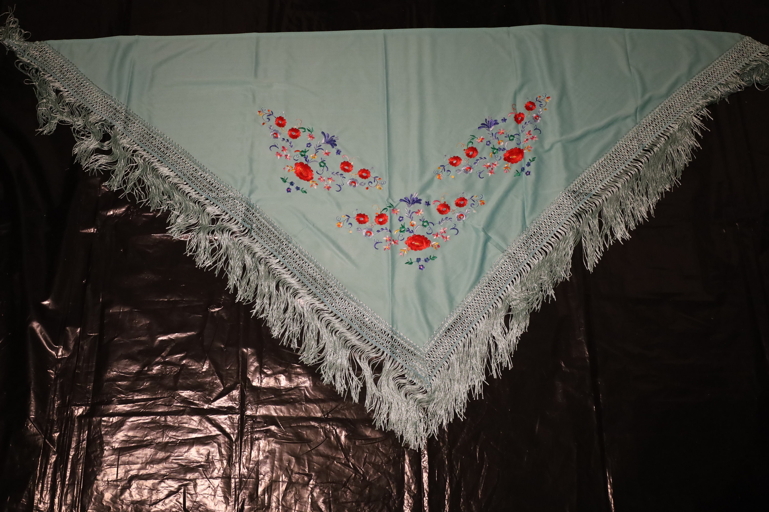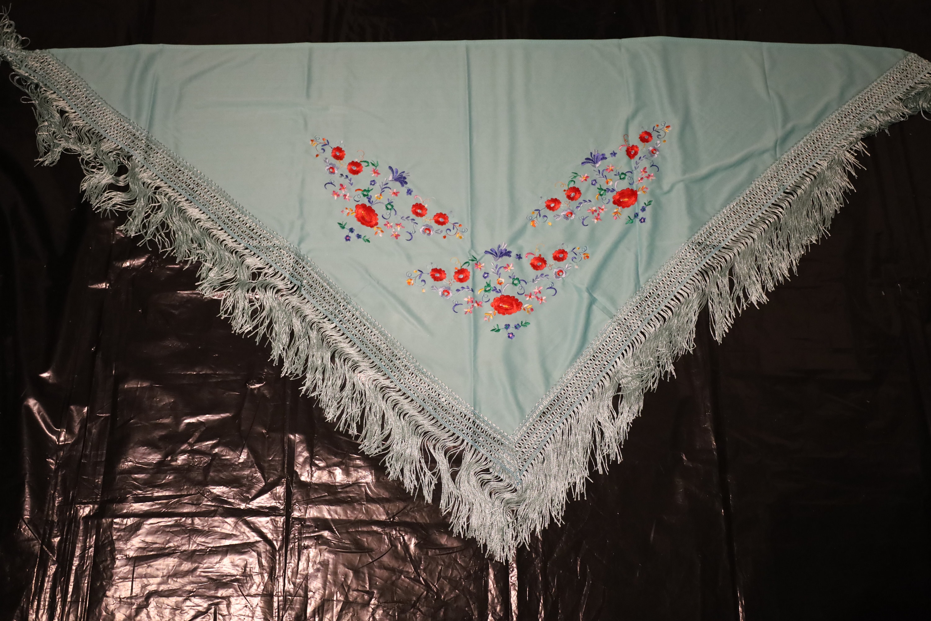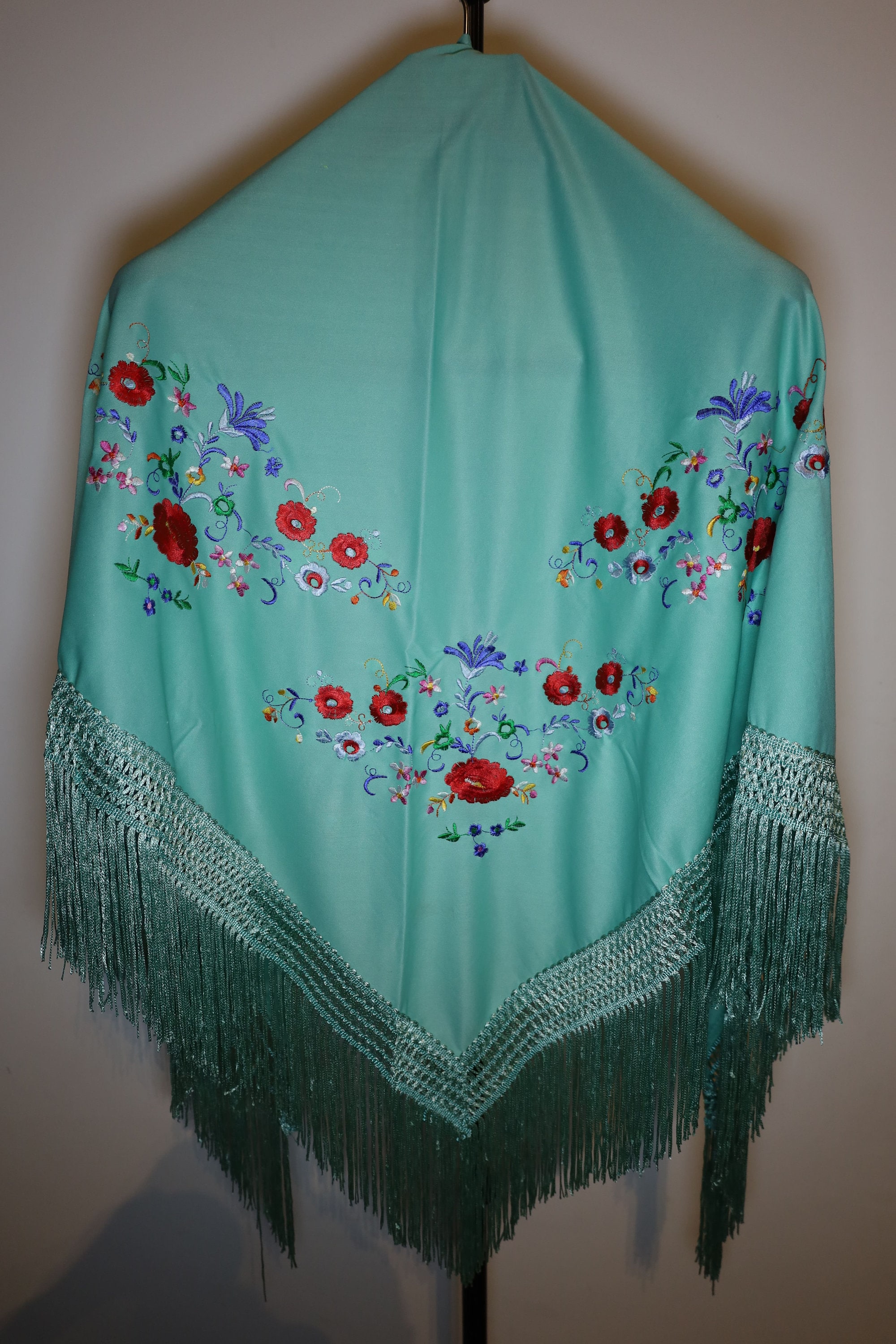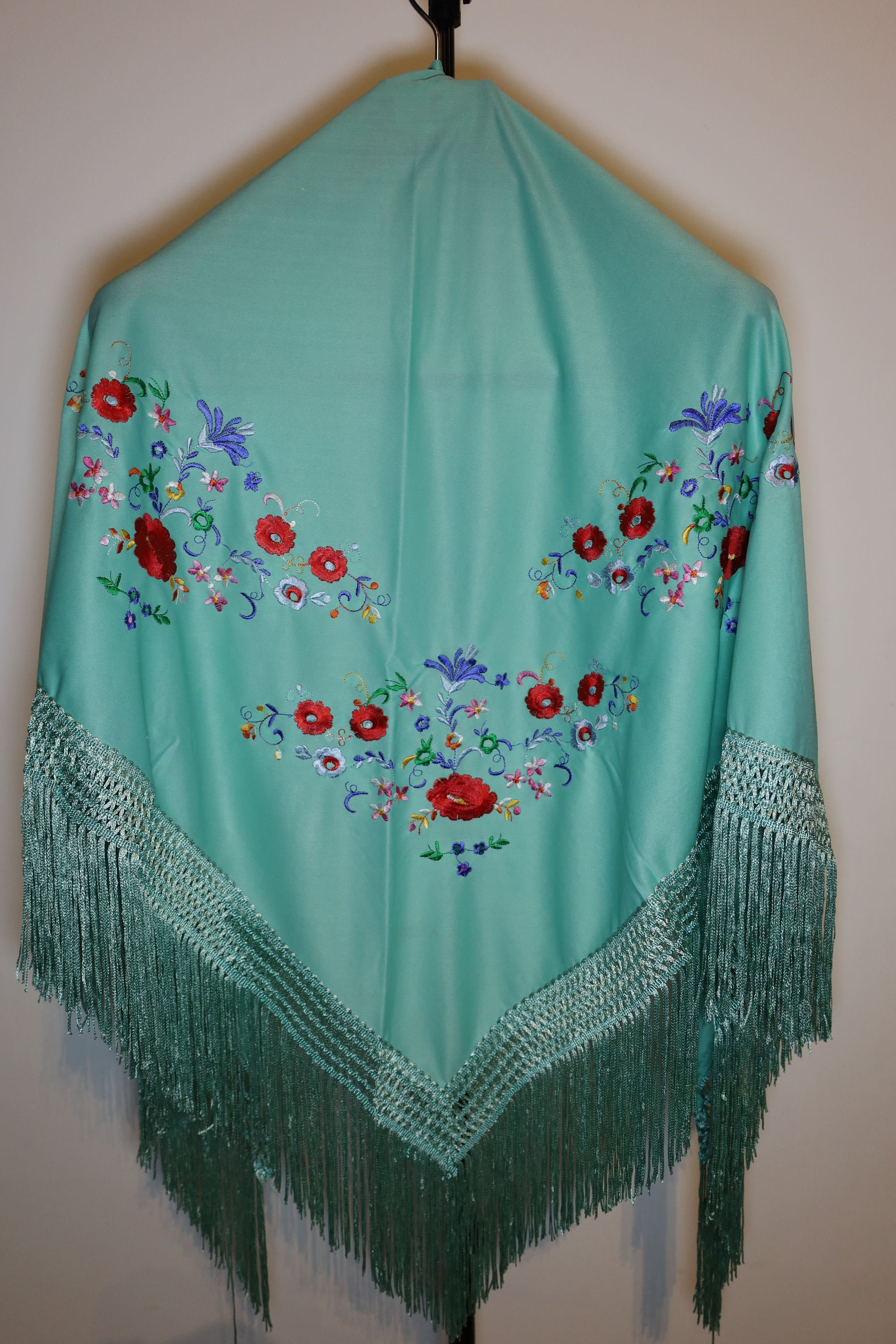 Dominant color: The background of the shawl is a superb turquoise or seafoam green. It is a fresh and luminous shade that particularly highlights the embroidery.