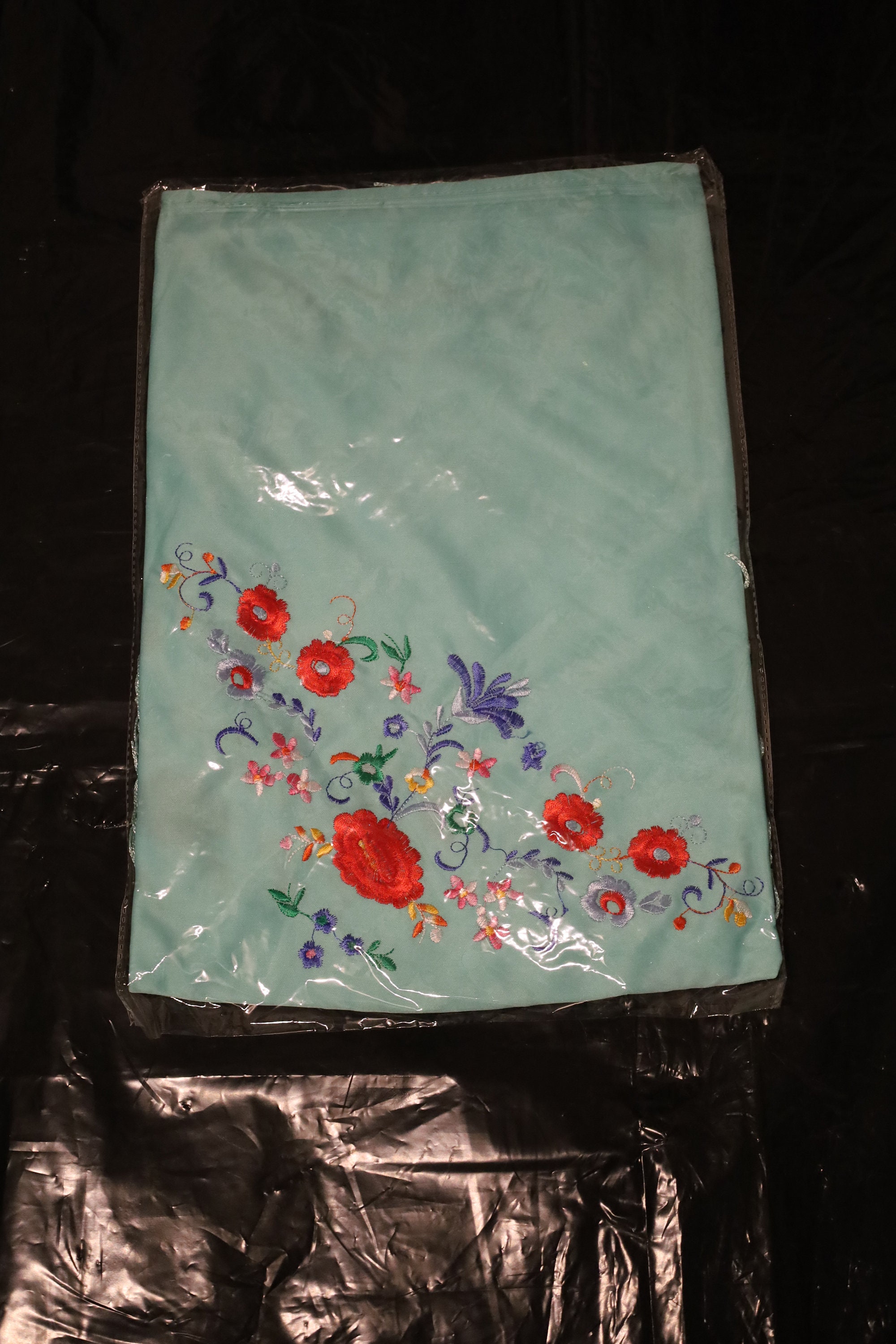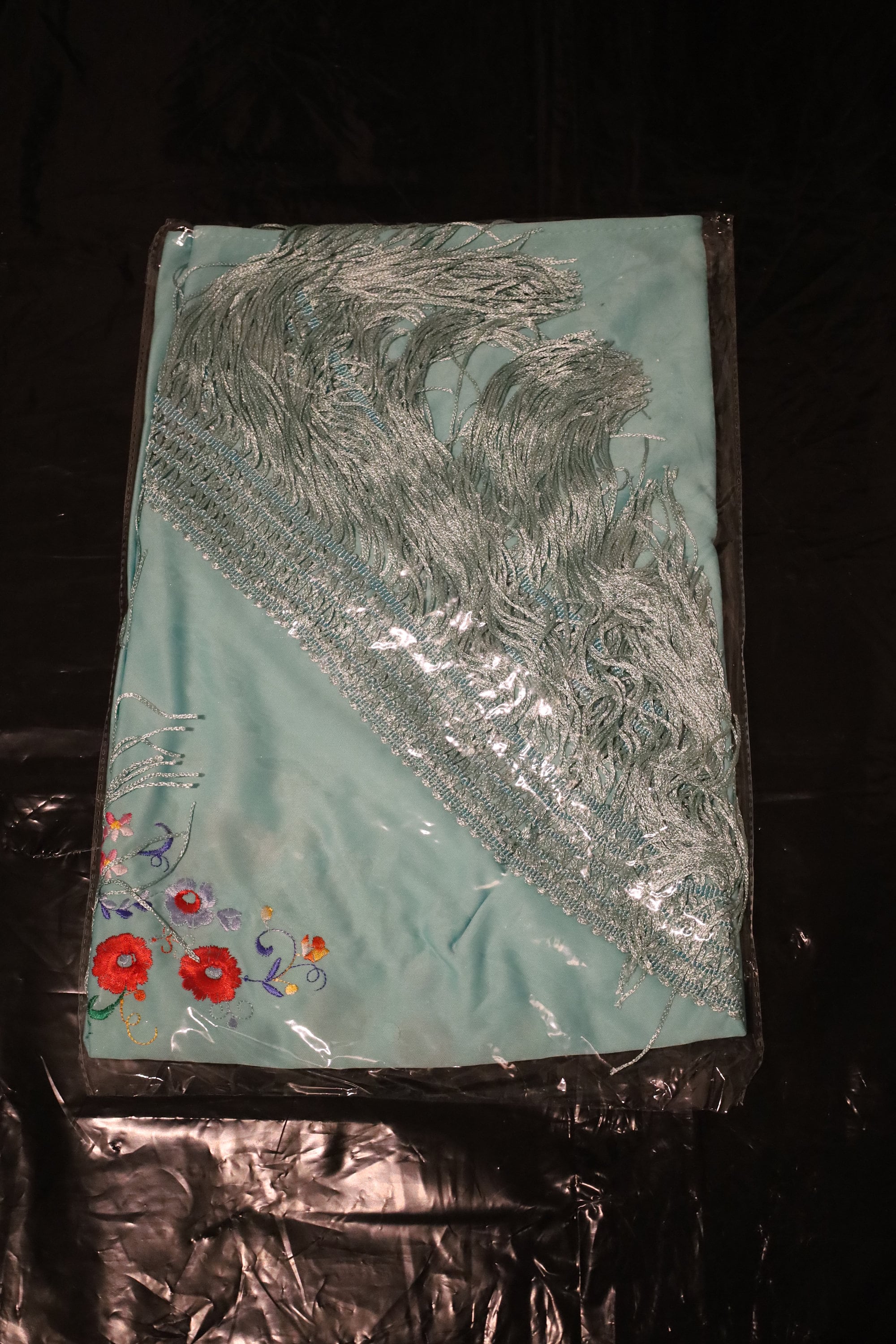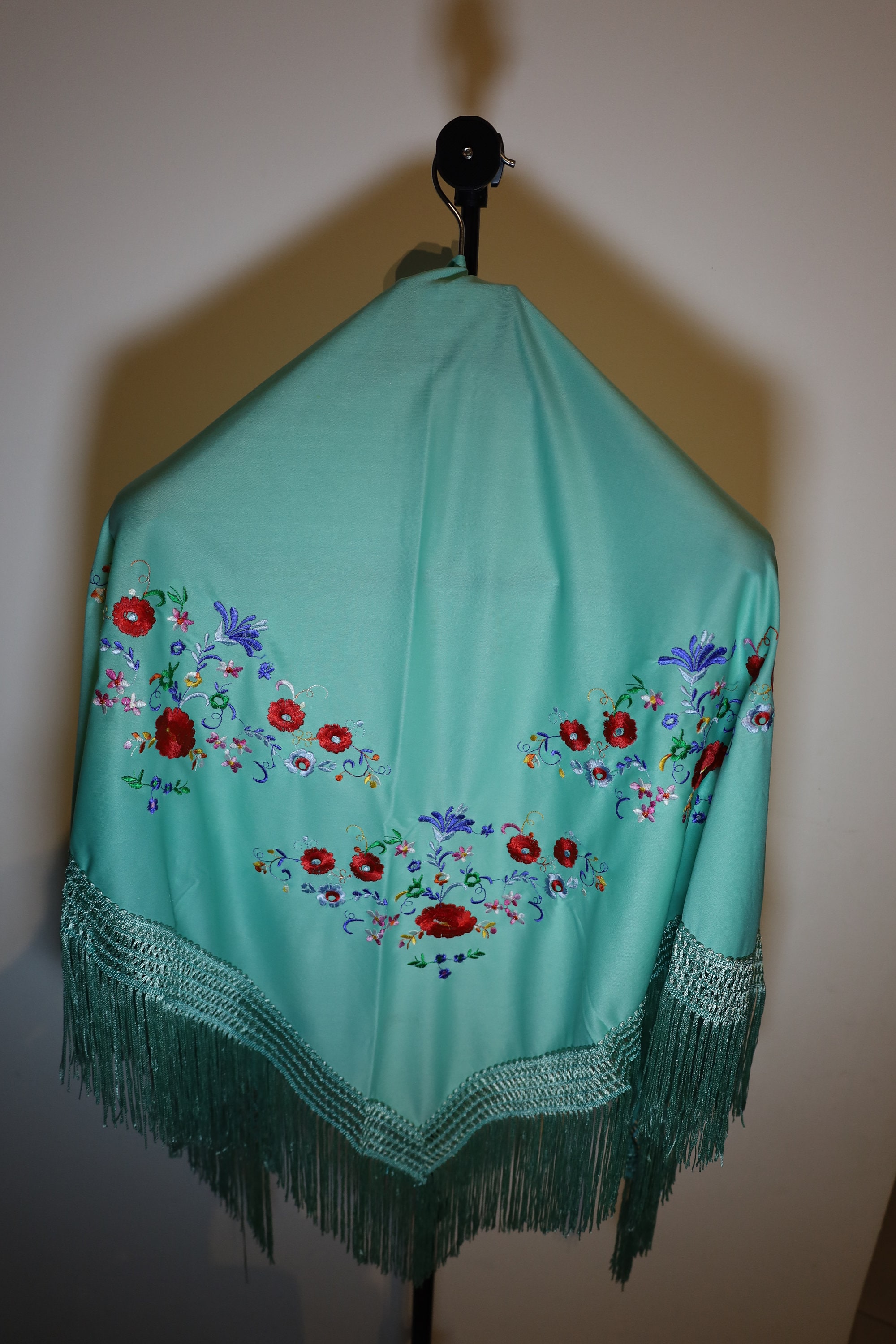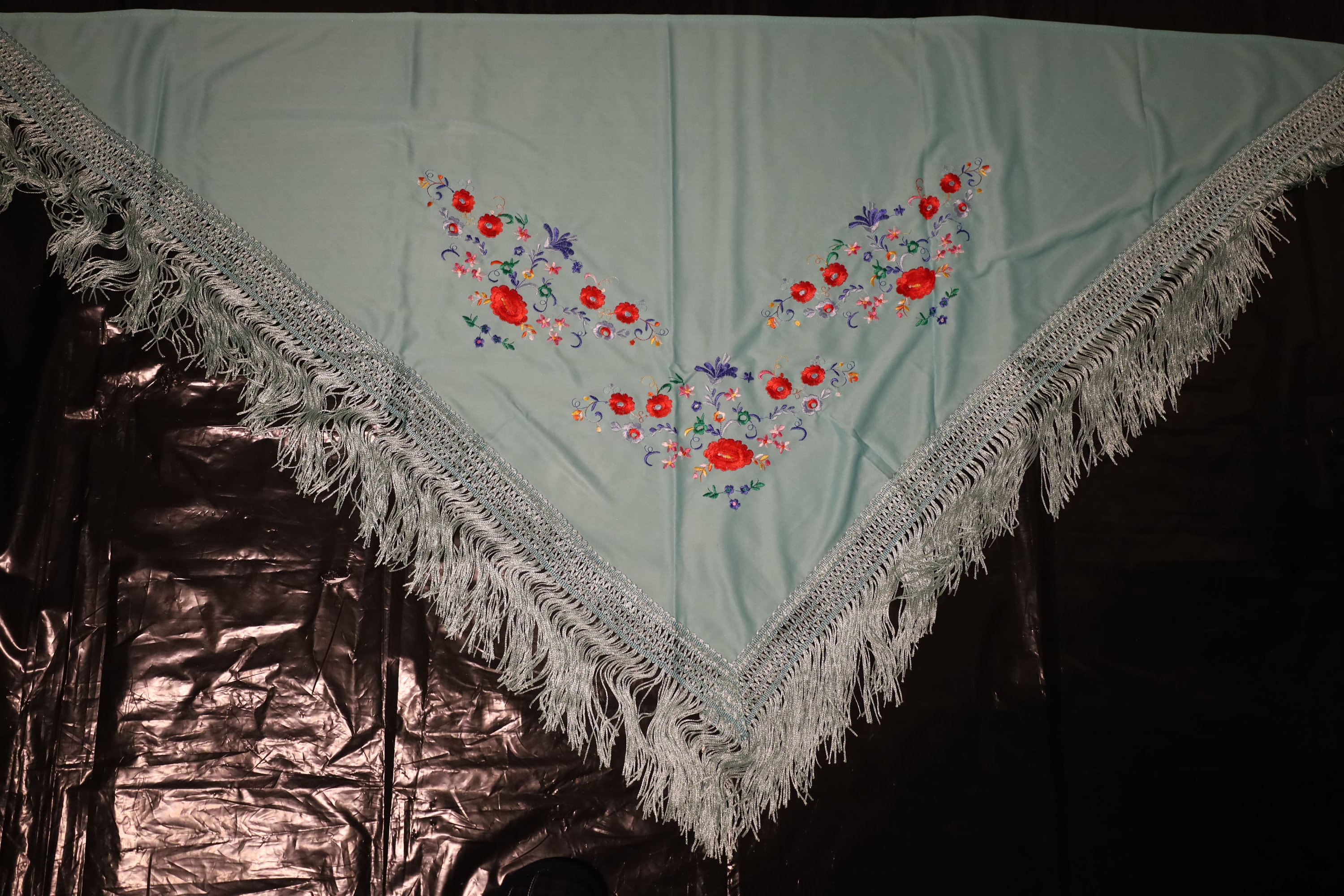 Dominant color: The background of the shawl is a superb turquoise or seafoam green. It is a fresh and luminous shade that particularly highlights the embroidery.