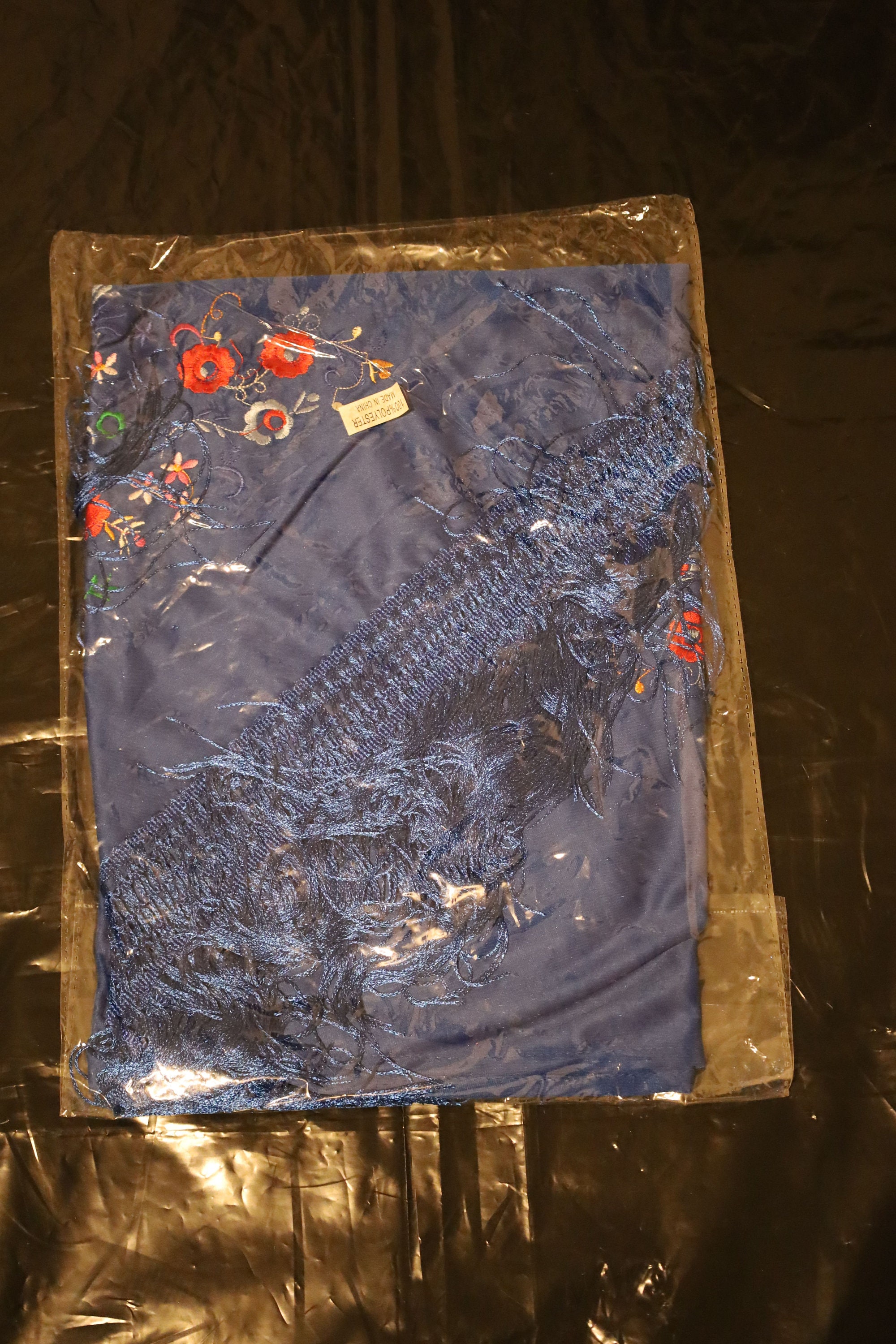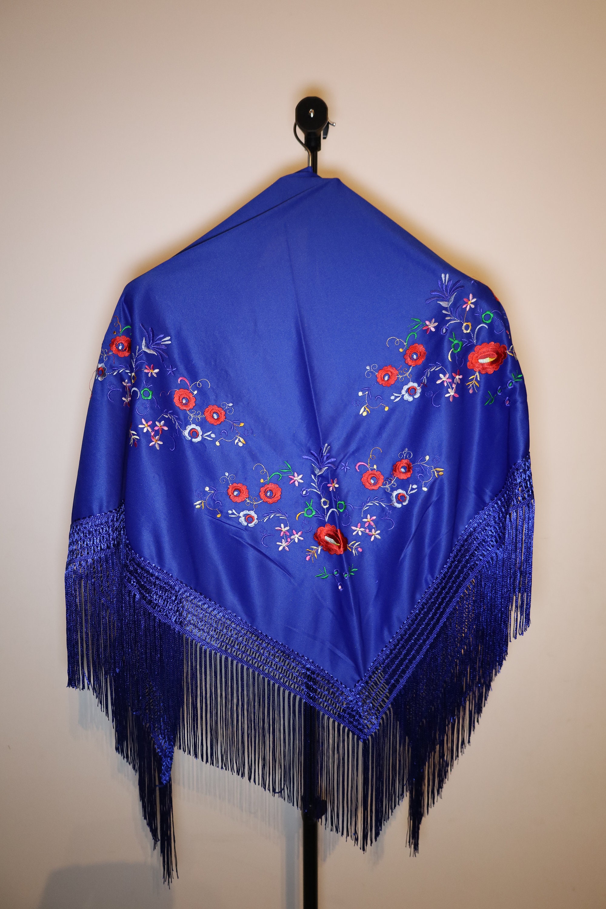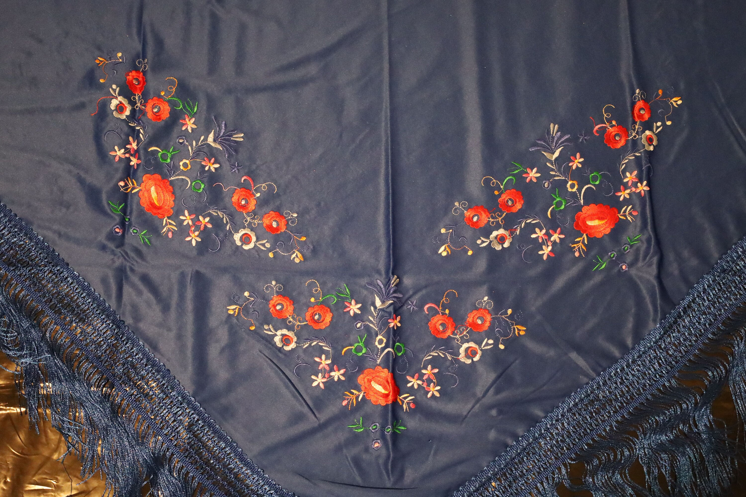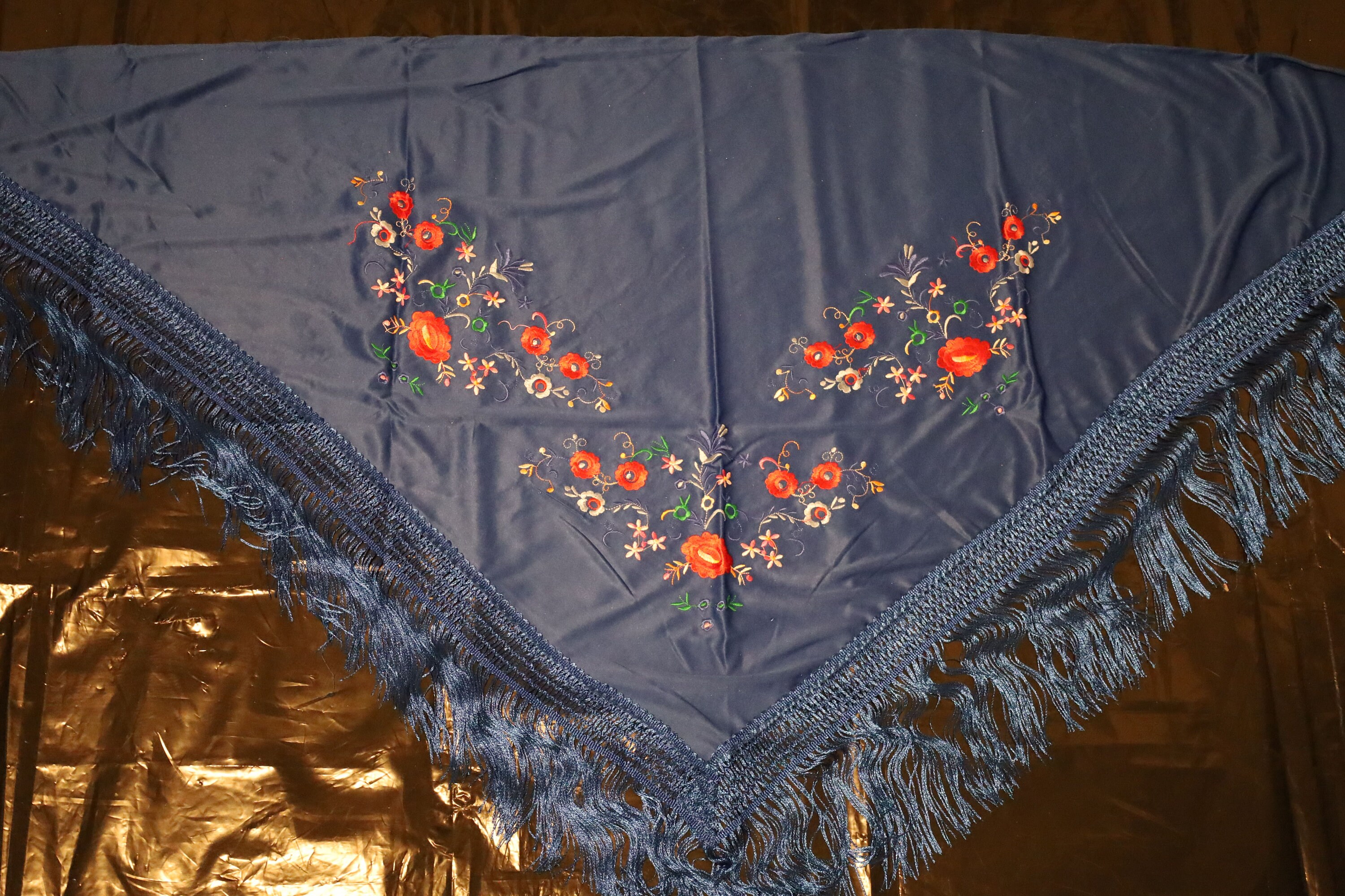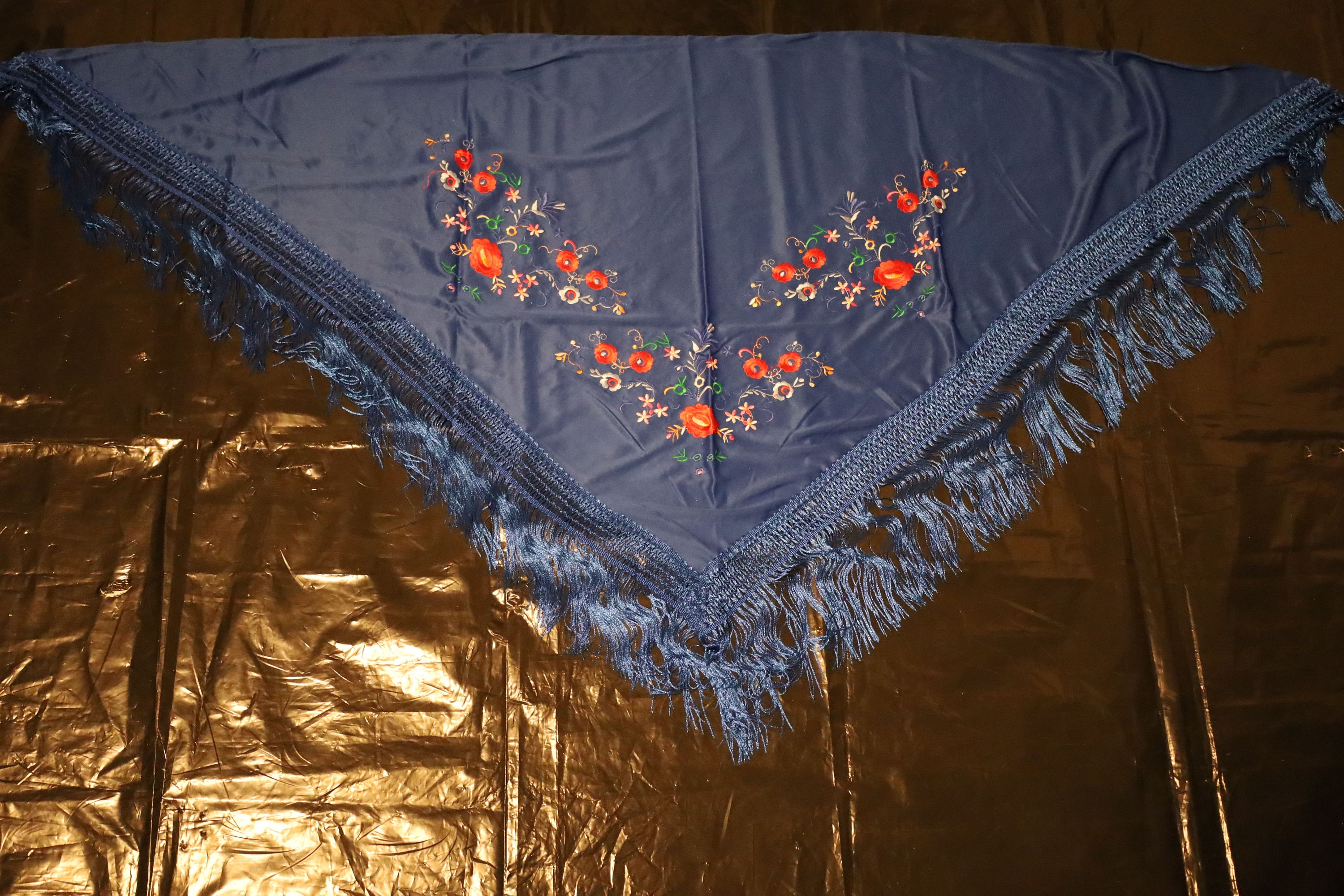 1. The Backdrop: A Deep Blue The base of the shawl is an electric, intense, and satiny navy blue. This color, reminiscent of a night sky or the depths of the ocean, captures the light with a silky softness. It offers a striking and dramatic contrast that highlights every detail of the embellishments.