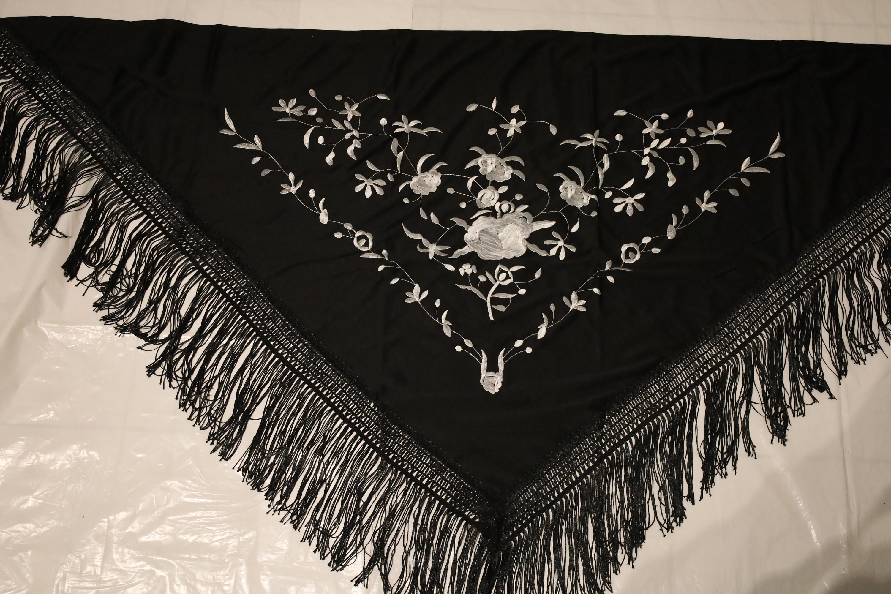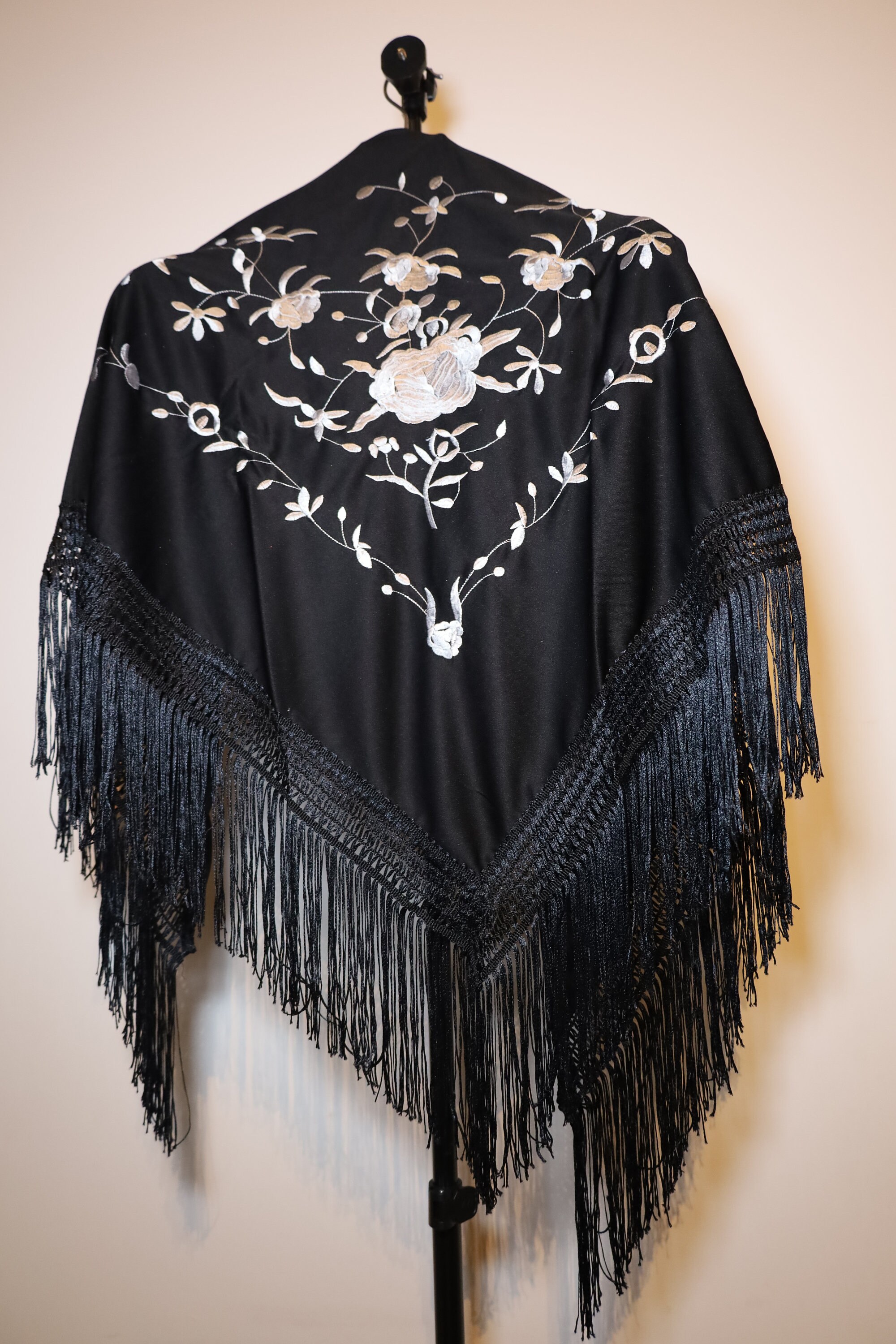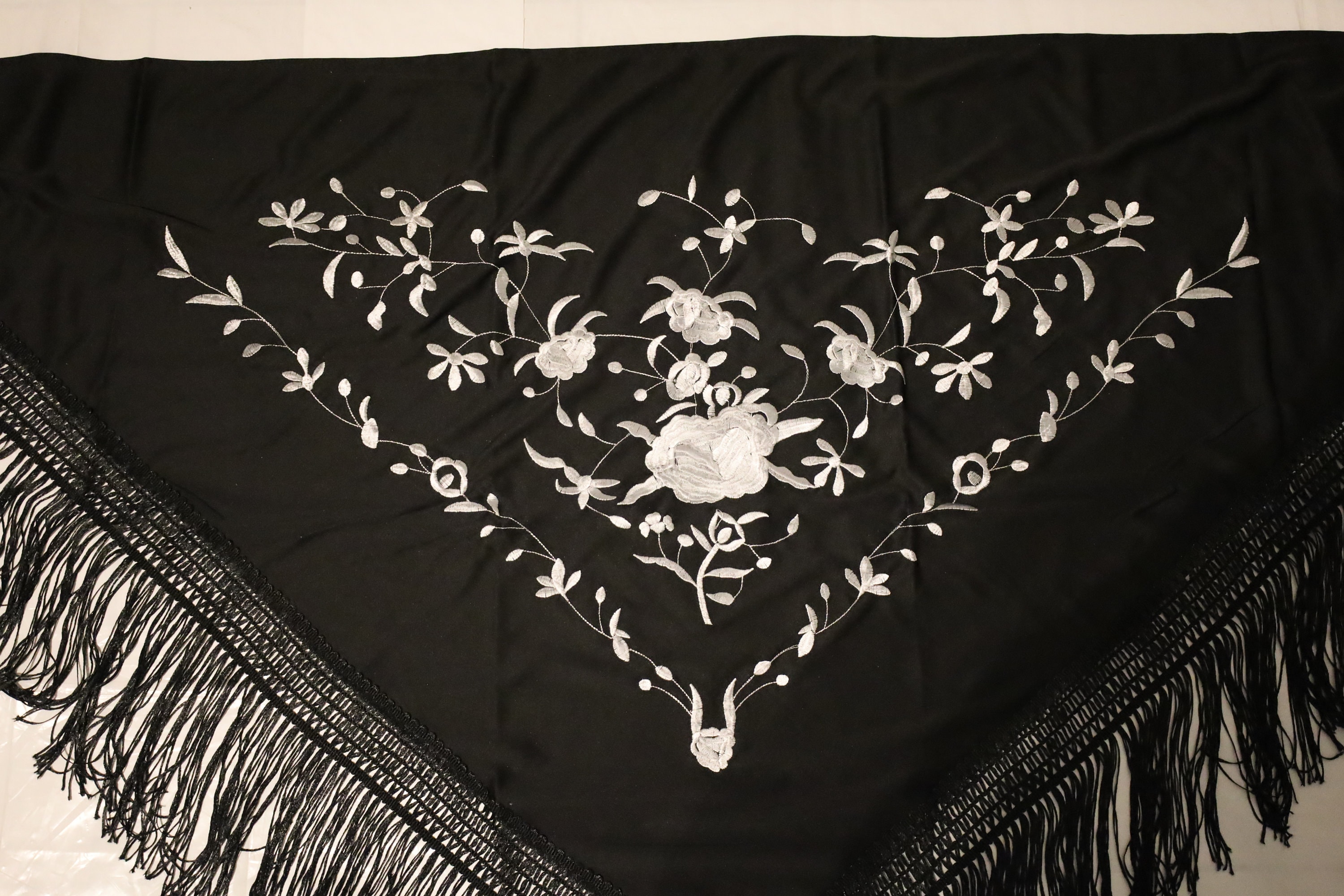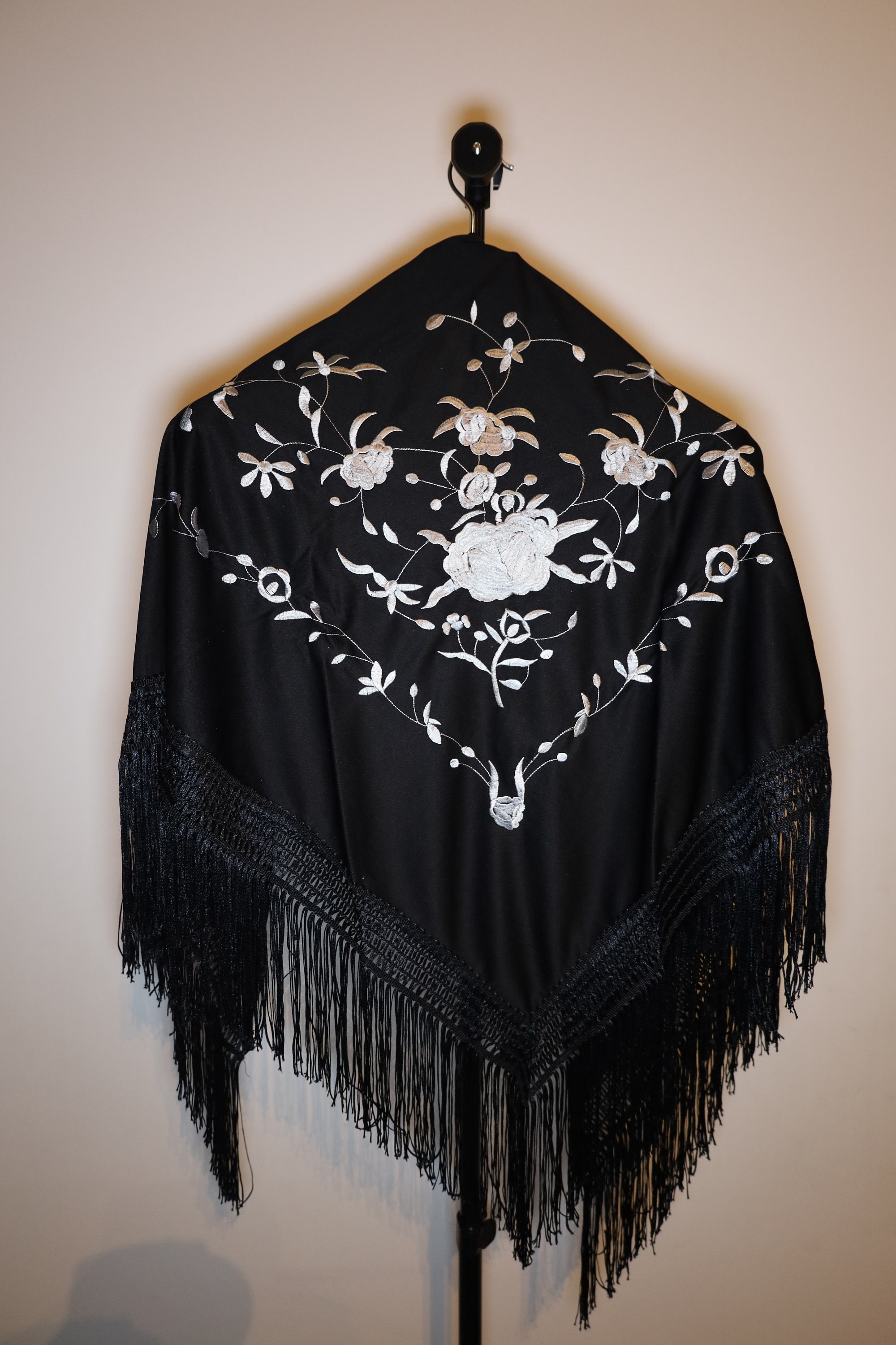 Be captivated by the timeless beauty of this traditional Spanish shawl, a symbol of elegance and grace. Crafted from sumptuous black fabric, it is exquisitely adorned with shimmering silver floral embroidery, offering a refined contrast and authentic style.