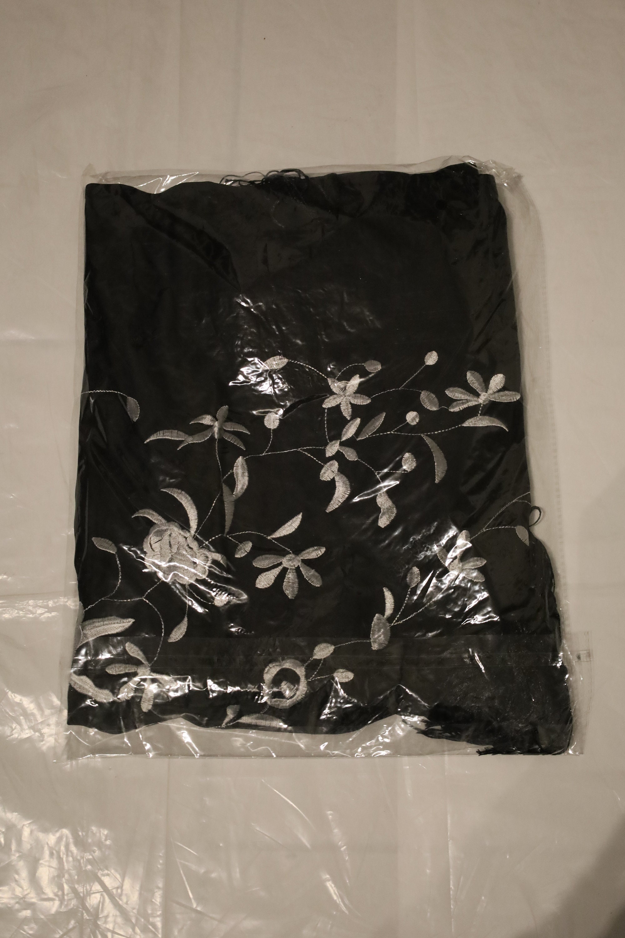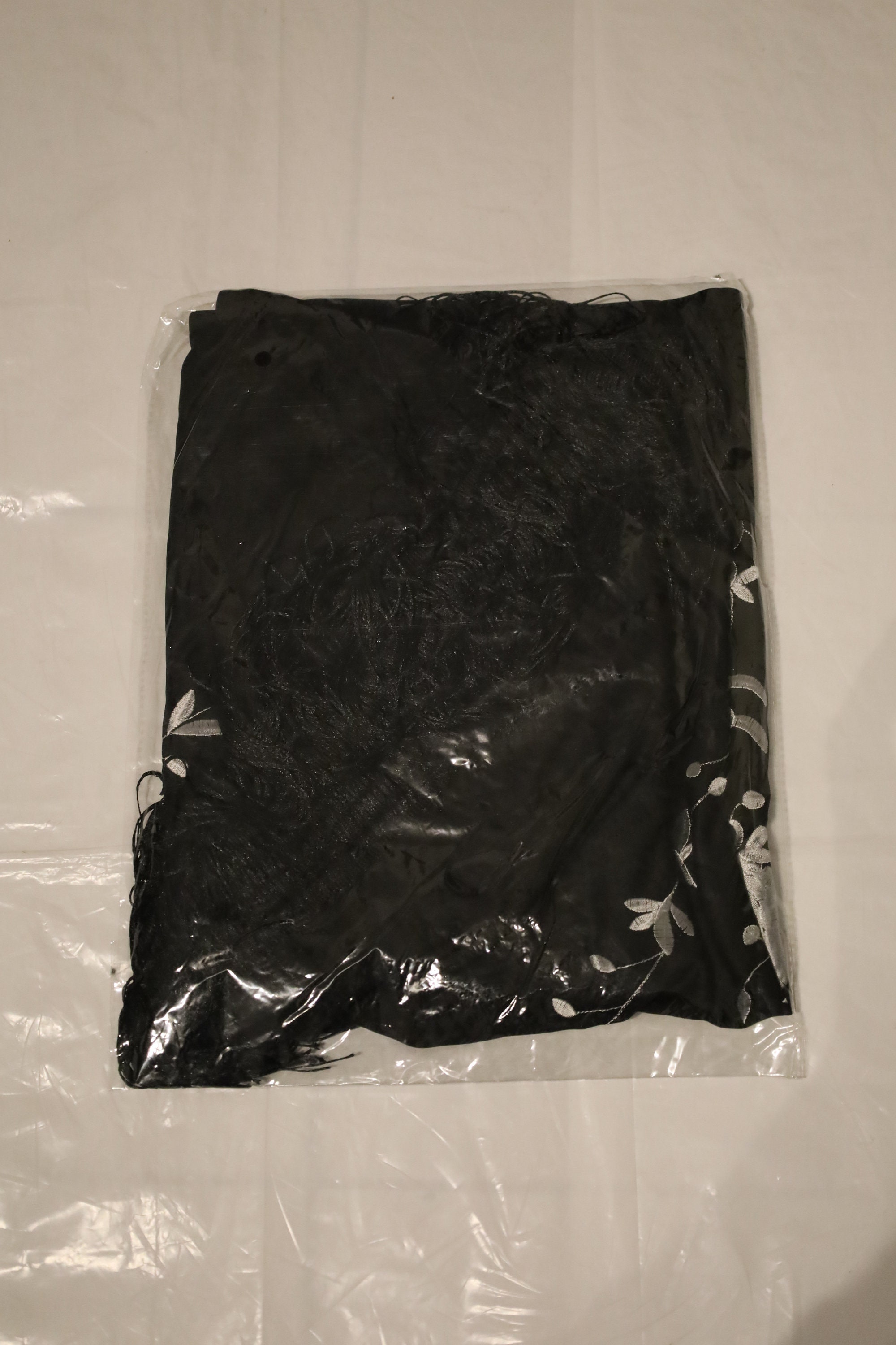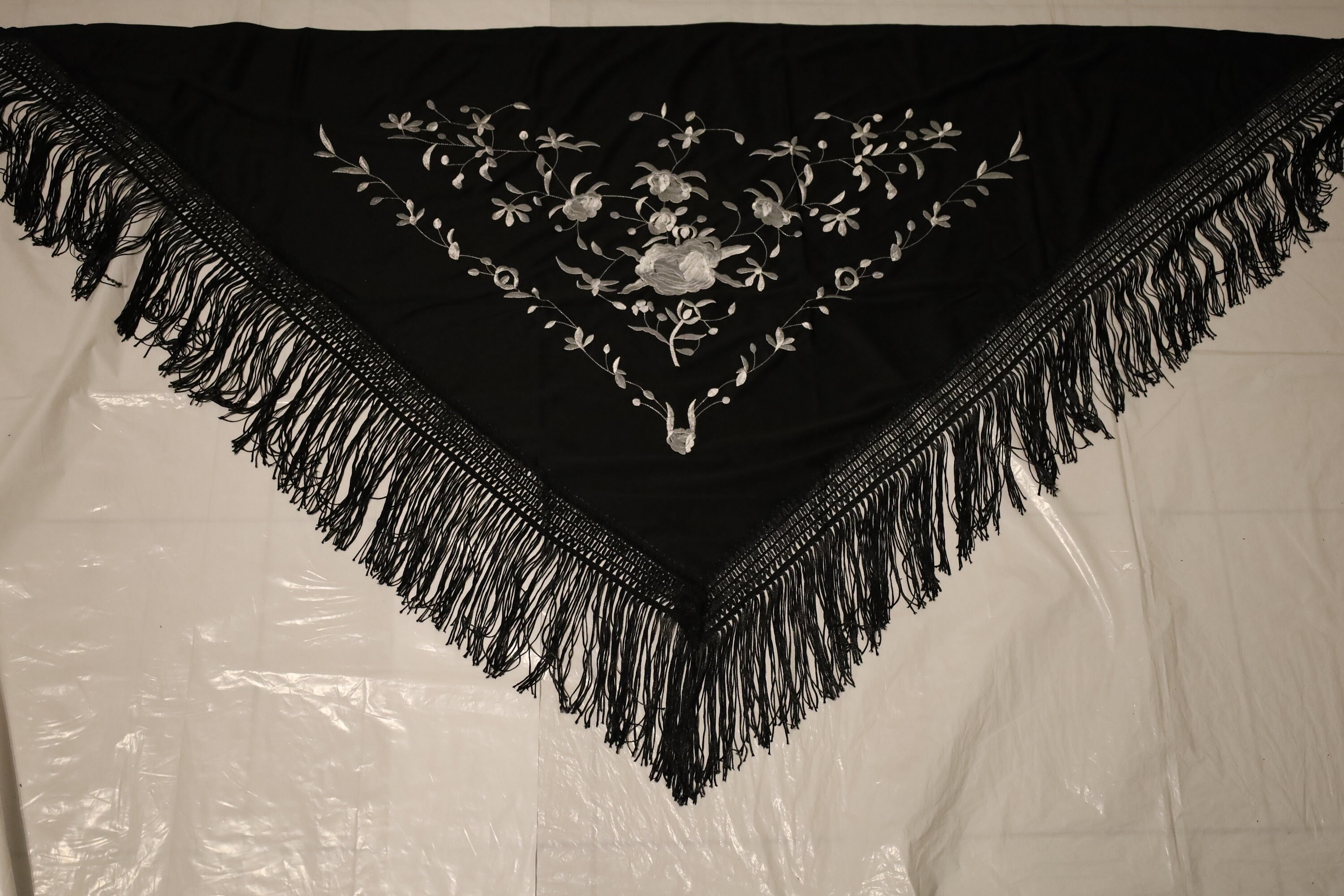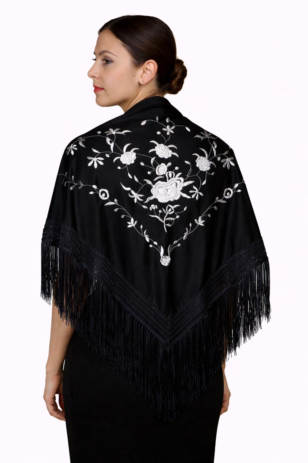 Be captivated by the timeless beauty of this traditional Spanish shawl, a symbol of elegance and grace. Crafted from sumptuous black fabric, it is exquisitely adorned with shimmering silver floral embroidery, offering a refined contrast and authentic style.