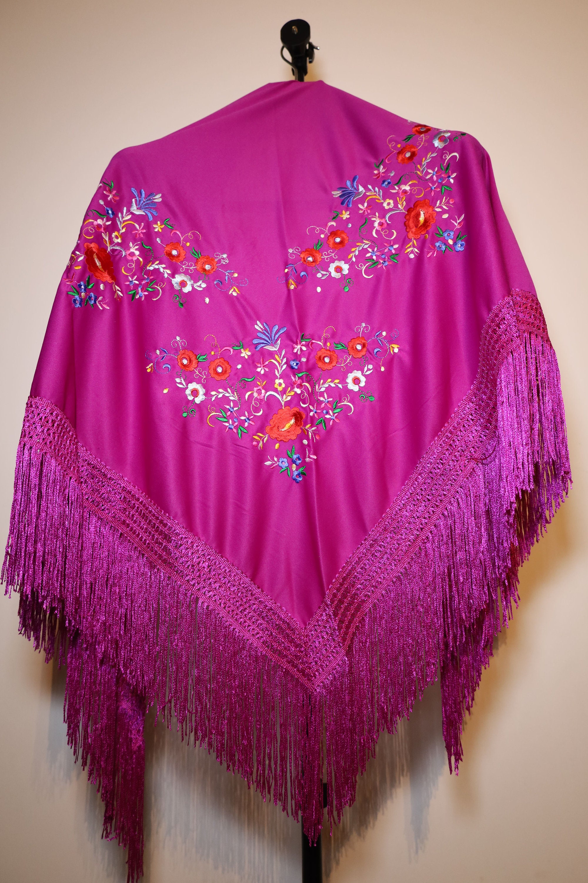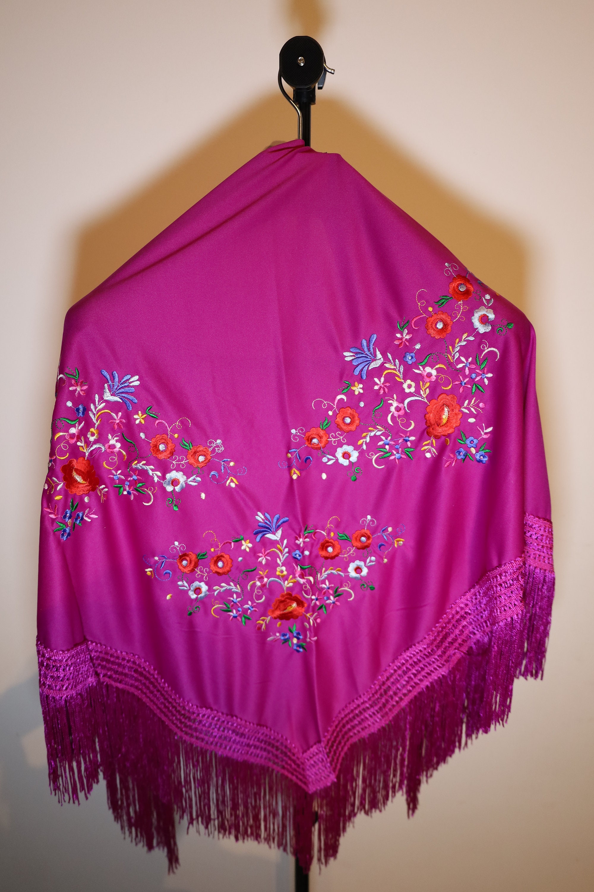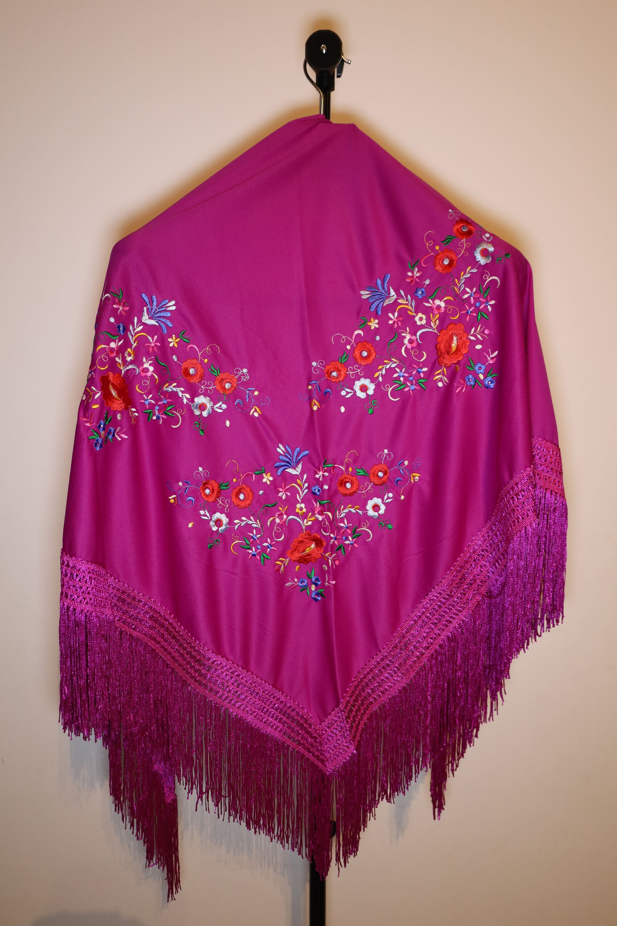 The most striking feature of this shawl is its background color: a deep magenta or fuchsia. It's a warm, intense, and very feminine shade that captures the light thanks to the satiny appearance of the fabric (probably silk or high-quality satin).