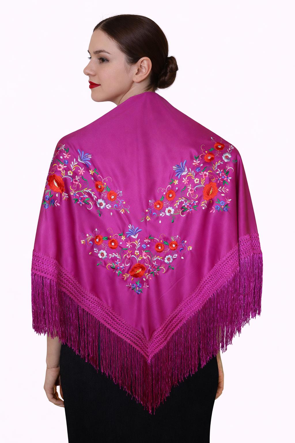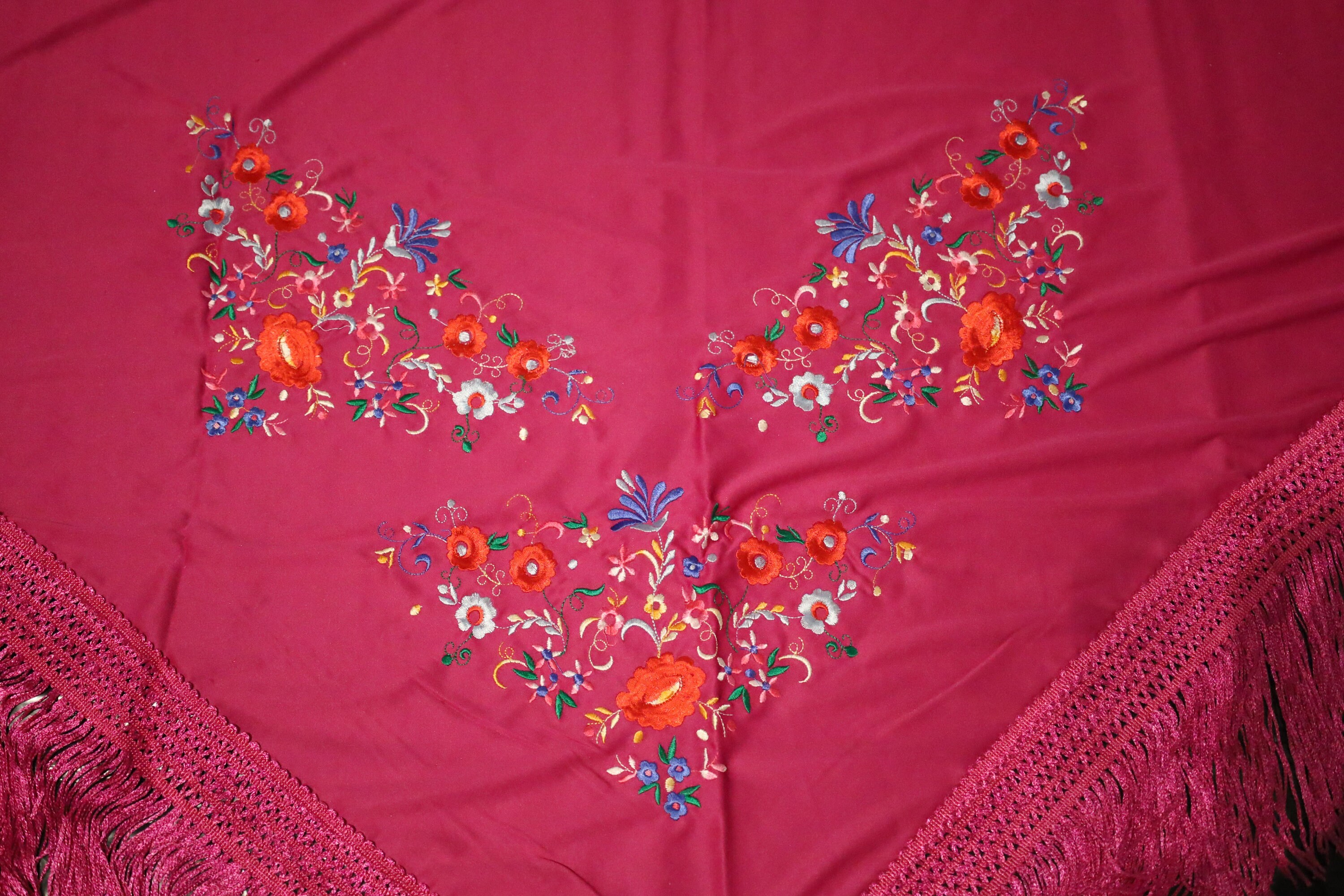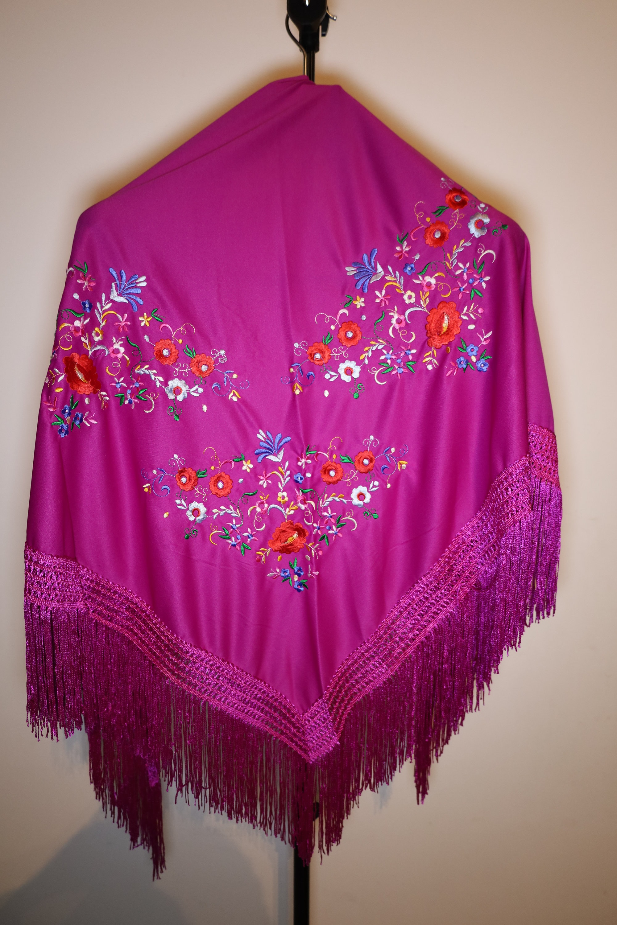 The most striking feature of this shawl is its background color: a deep magenta or fuchsia. It's a warm, intense, and very feminine shade that captures the light thanks to the satiny appearance of the fabric (probably silk or high-quality satin).