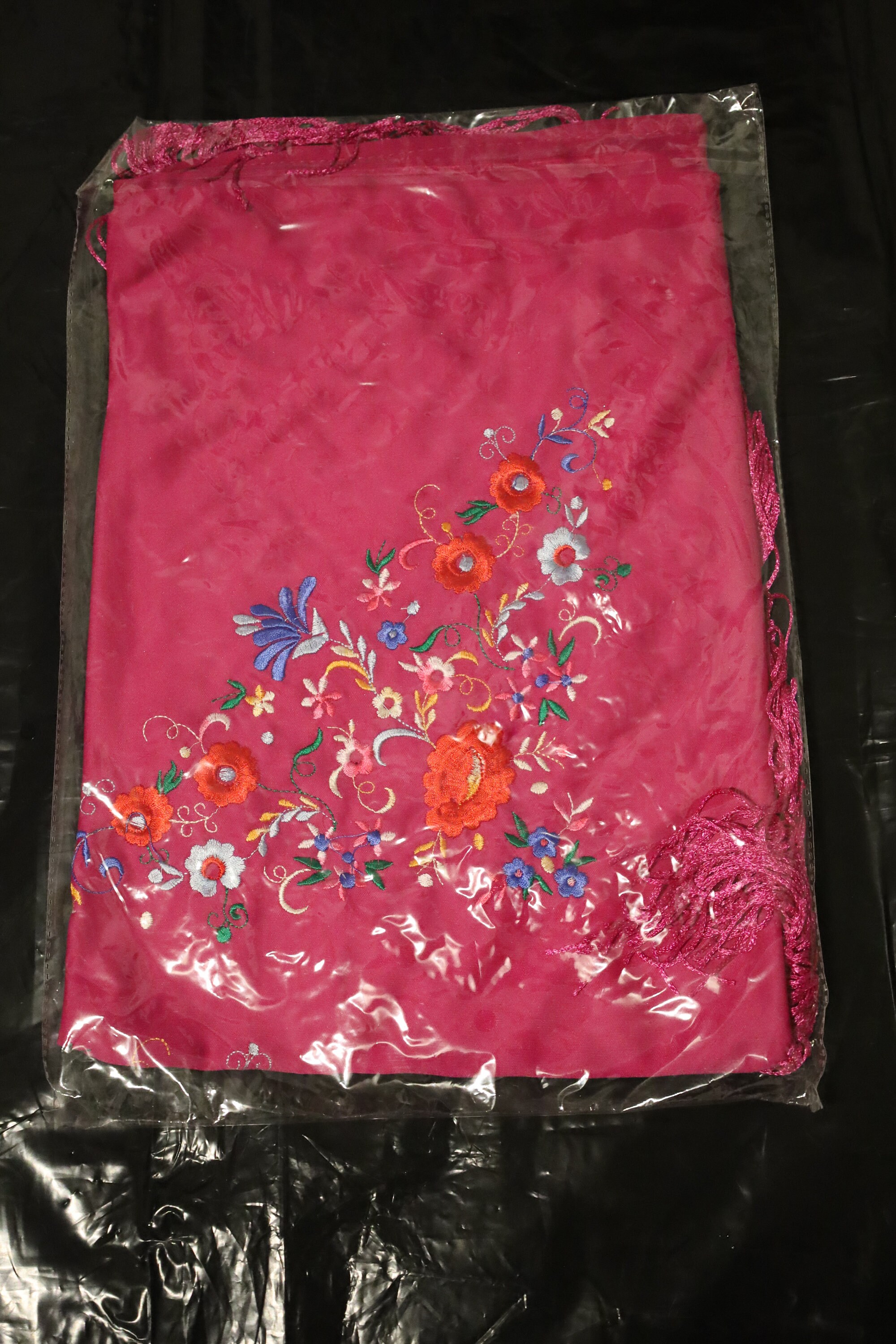 As with the previous shawl, the embroidery is rich and colorful, creating a striking contrast with the purple background: