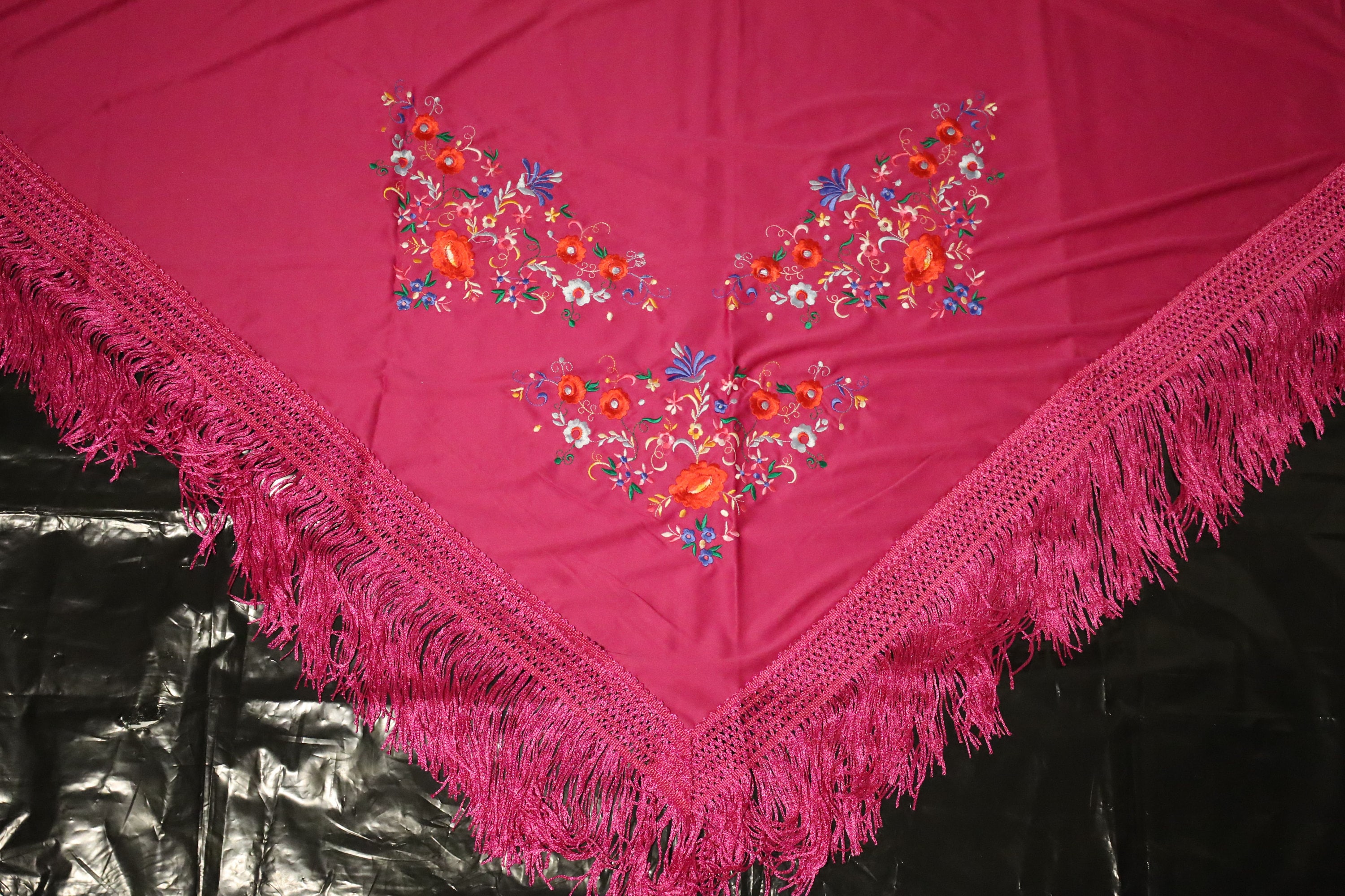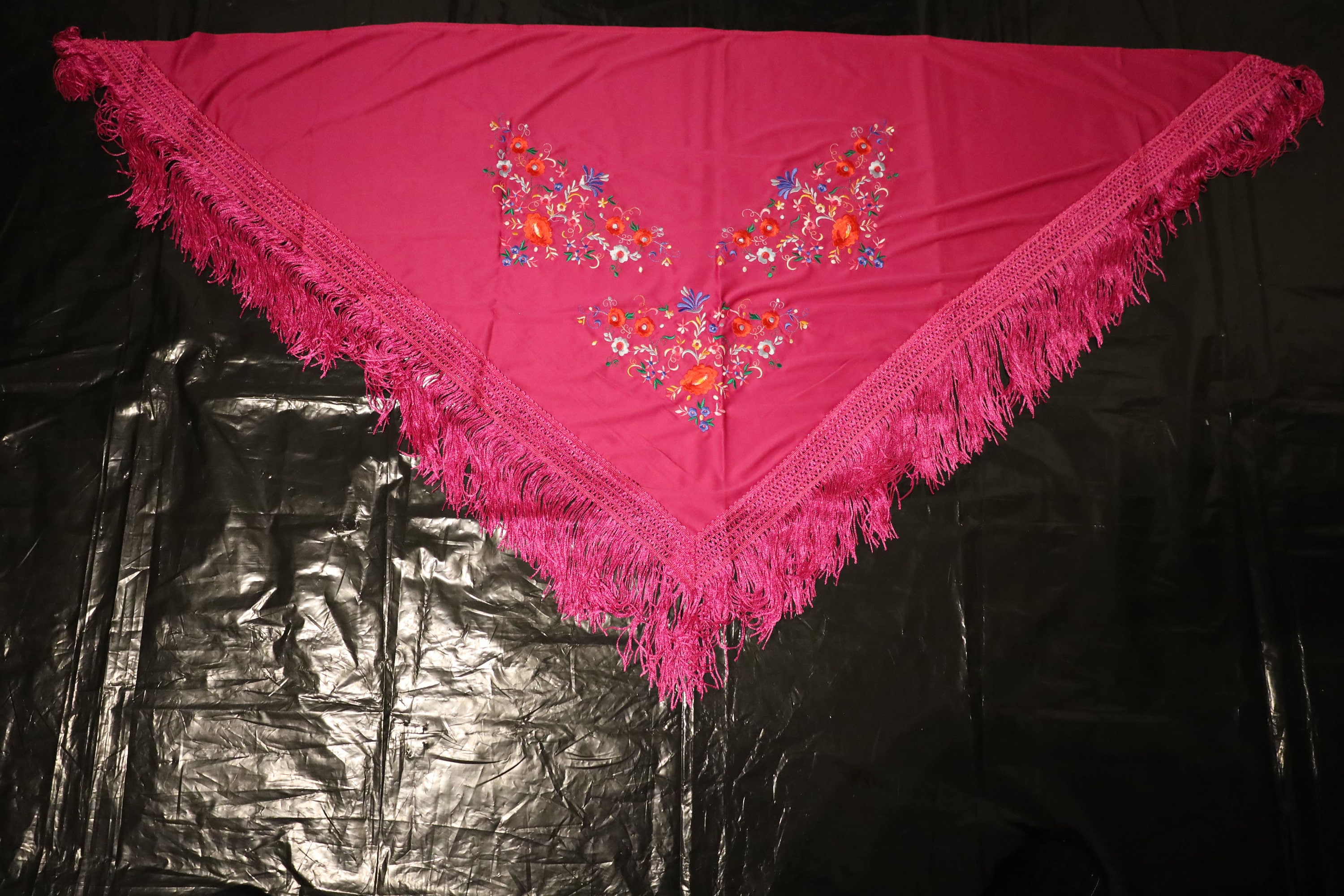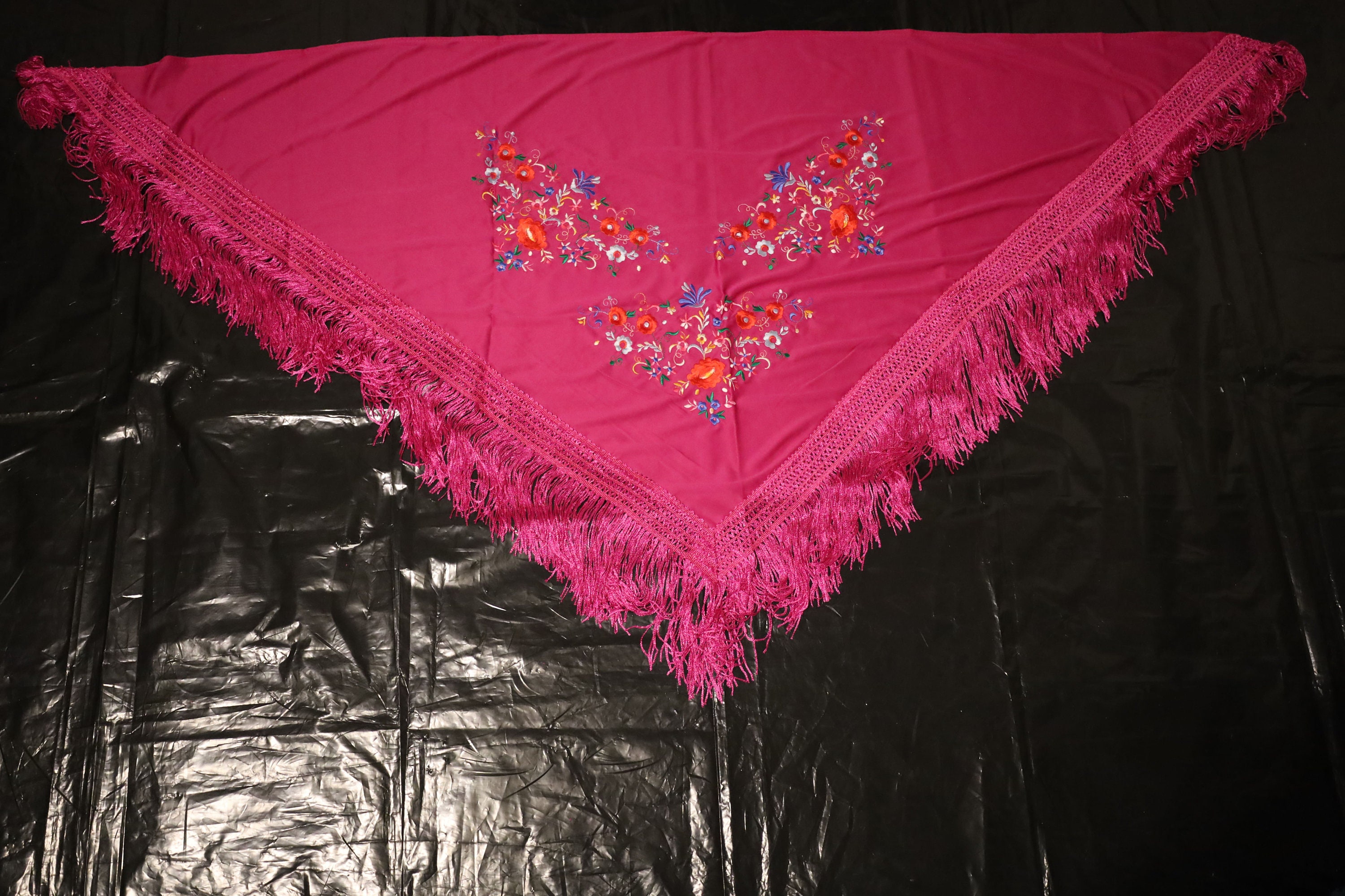 The fringes: They are long, silky, and a perfect tone-on-tone match to the magenta fabric. They ensure fluid and graceful movement, essential if this shawl is used for dance.