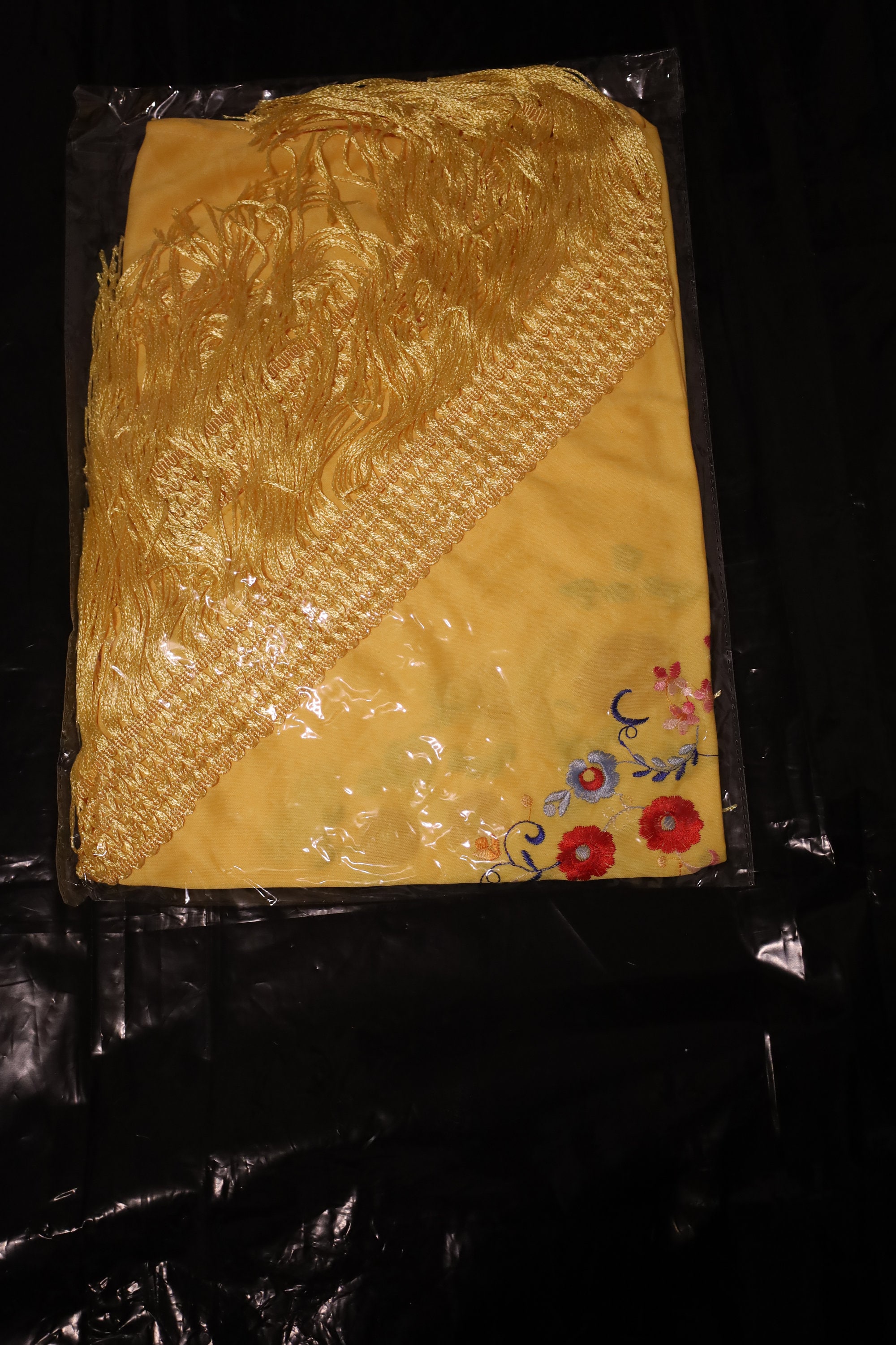 Twisted fringe: A long, silky yellow fringe frames the bottom of the shawl, adding movement, refinement, and fluidity to the overall look. The fringe is hand-knotted and flows generously, creating a dramatic effect with every gesture or dance step.