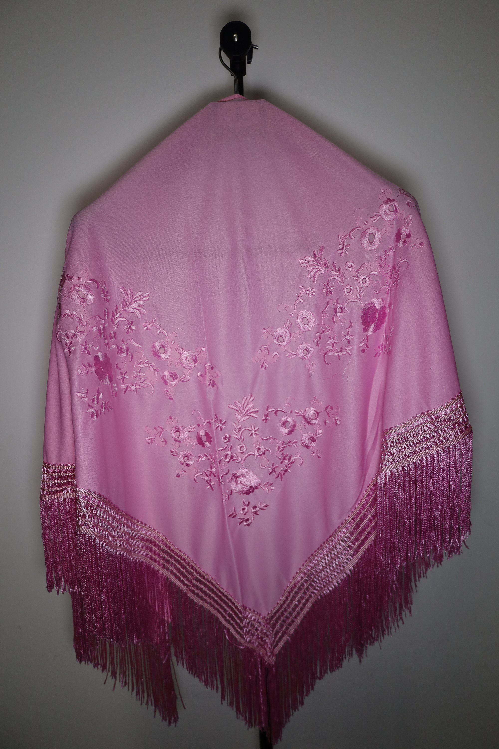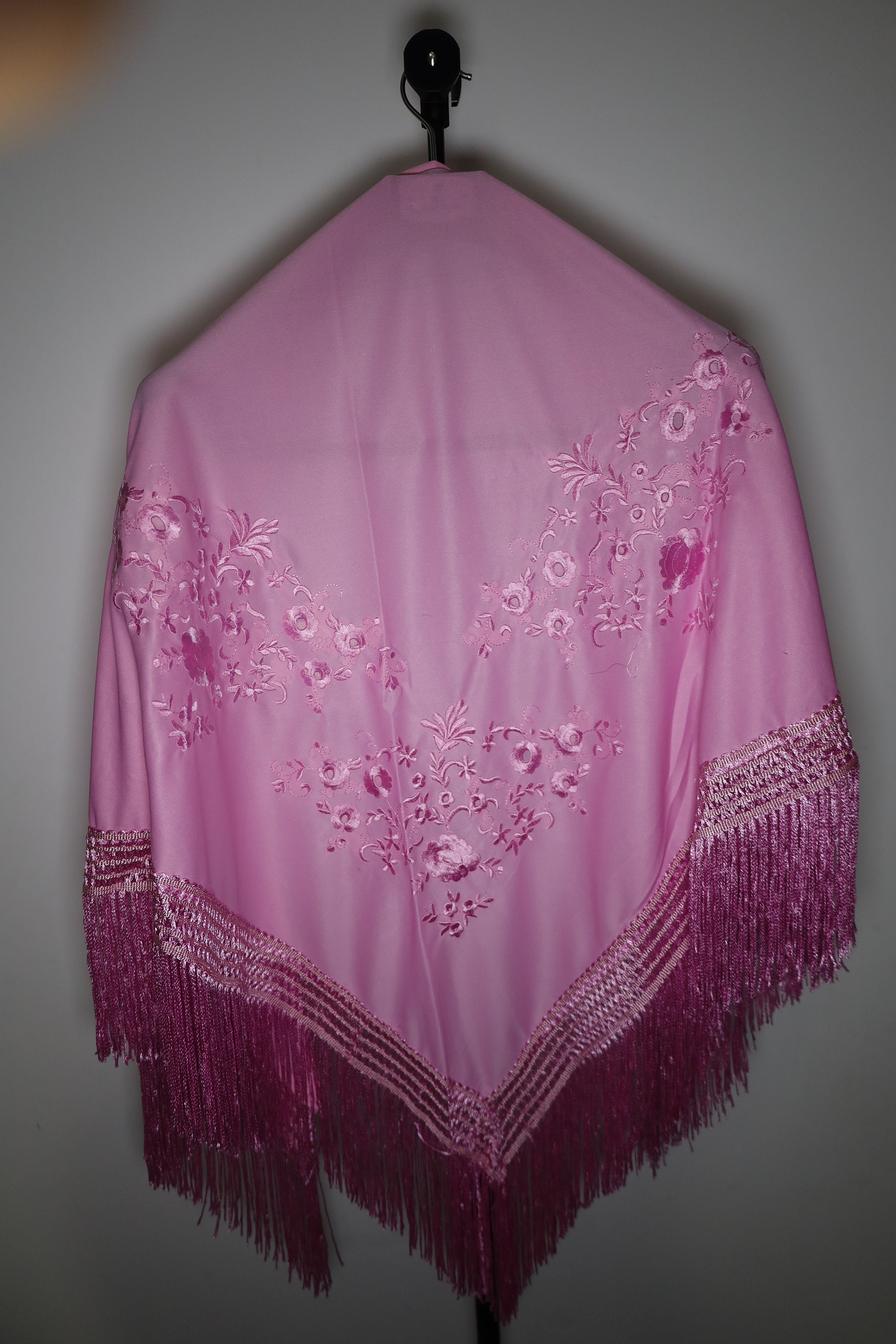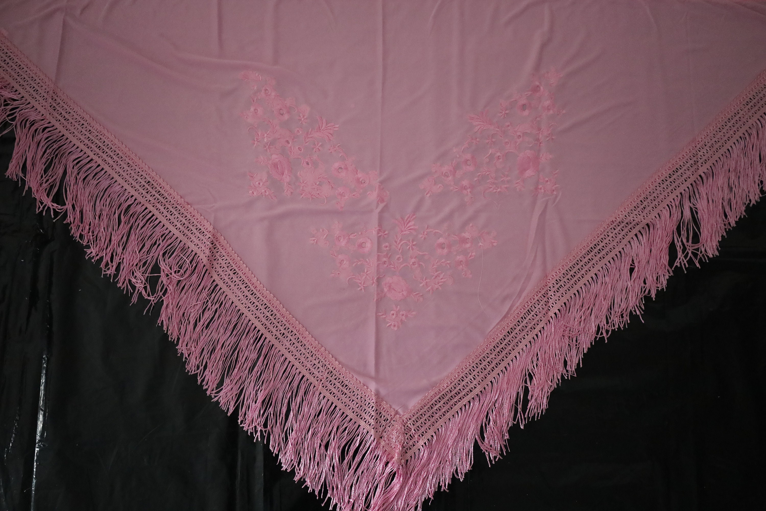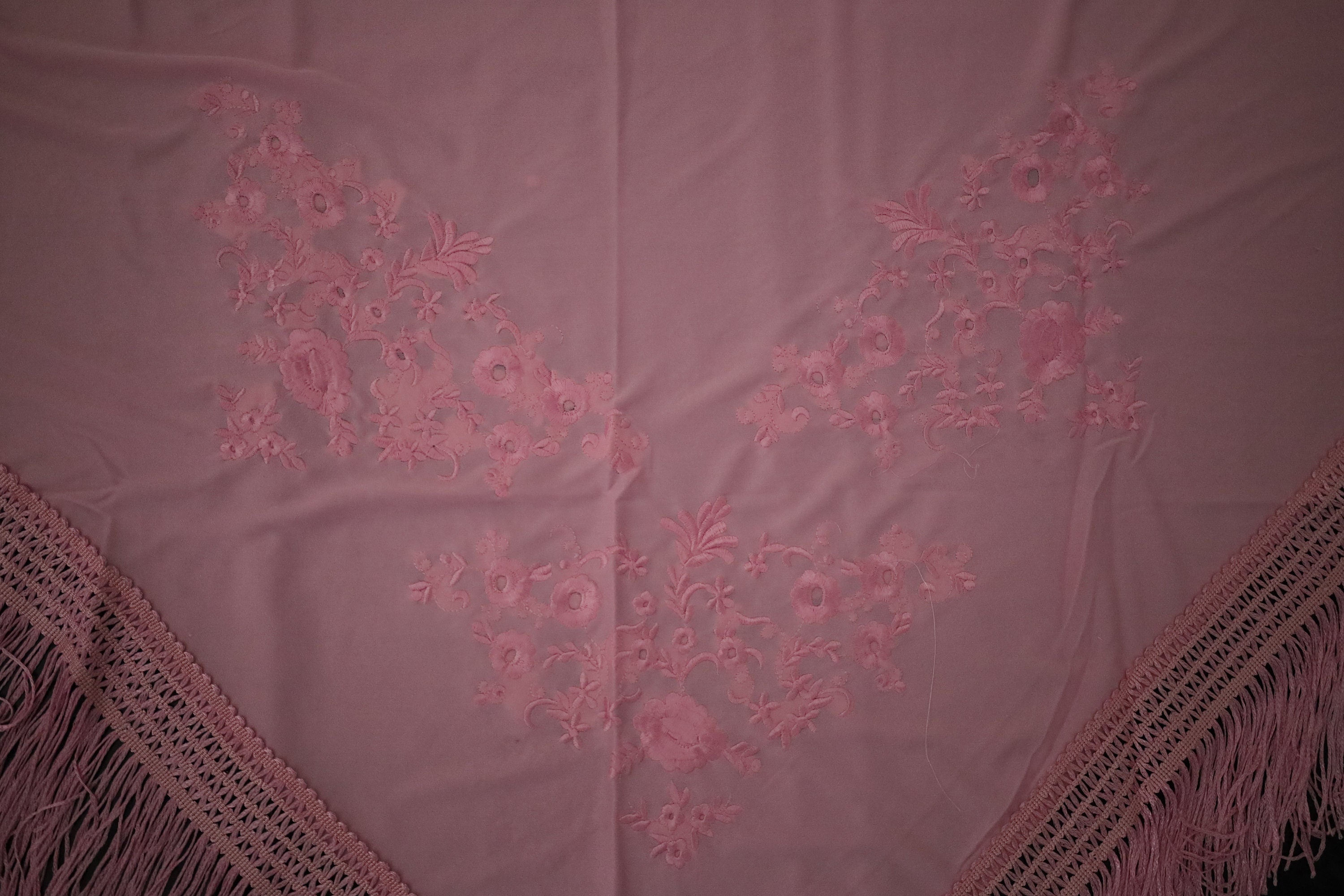 Immerse yourself in timeless elegance with this sumptuous pink Spanish shawl, a symbol of passion and refinement. Crafted from a silky, deep pink fabric, it is delicately embroidered with tone-on-tone floral motifs, adding a touch of sophistication and subtlety.