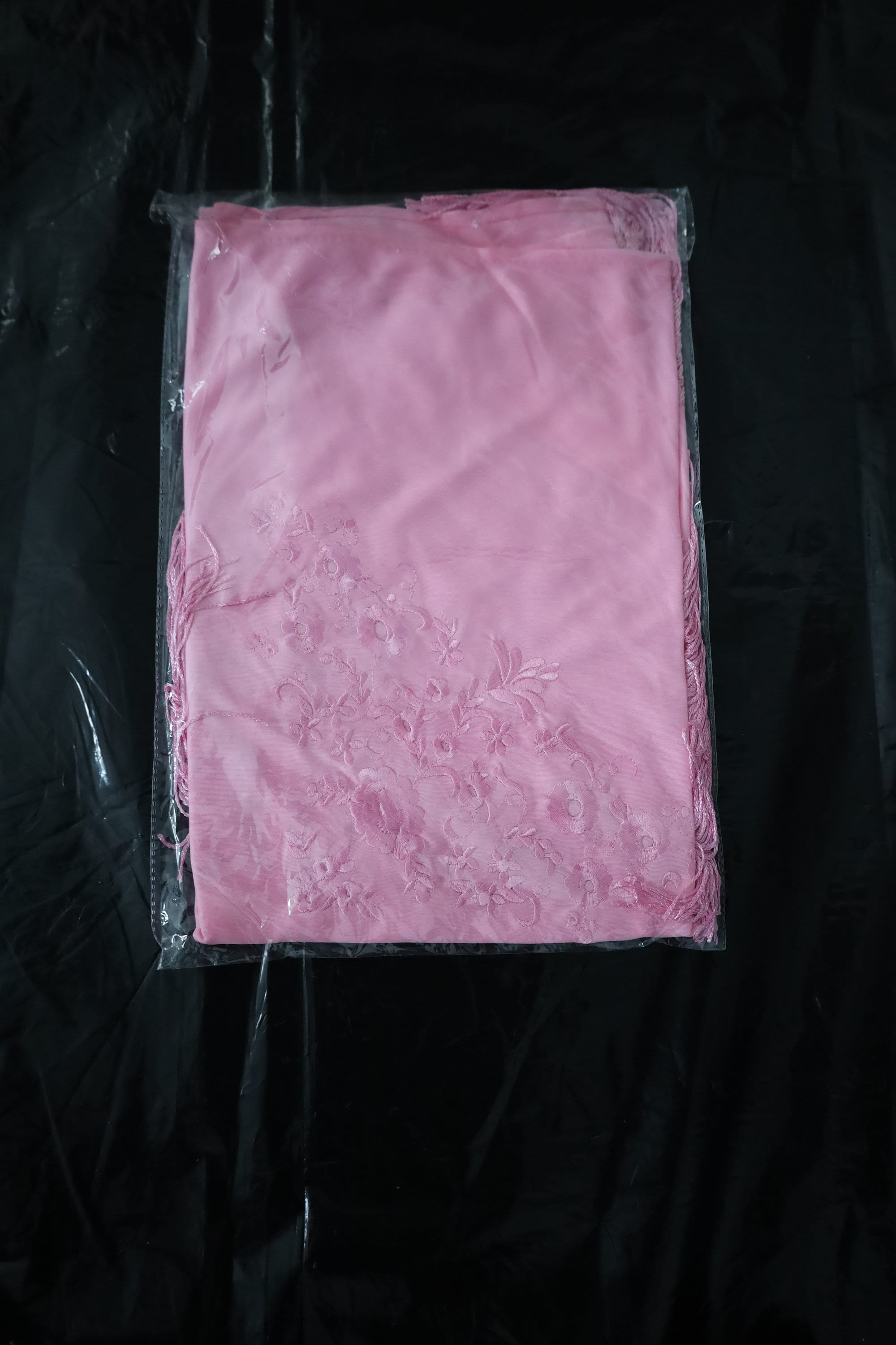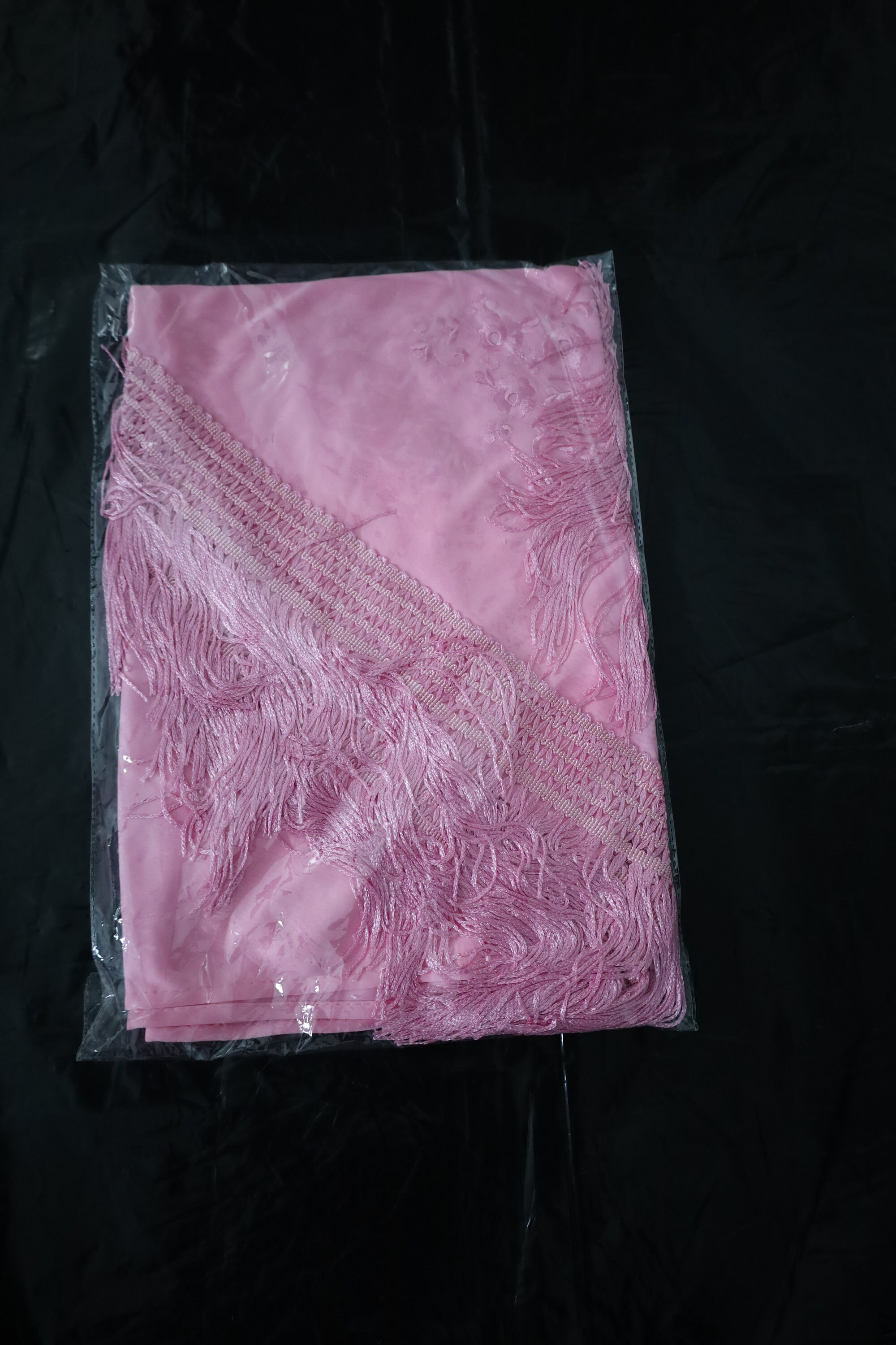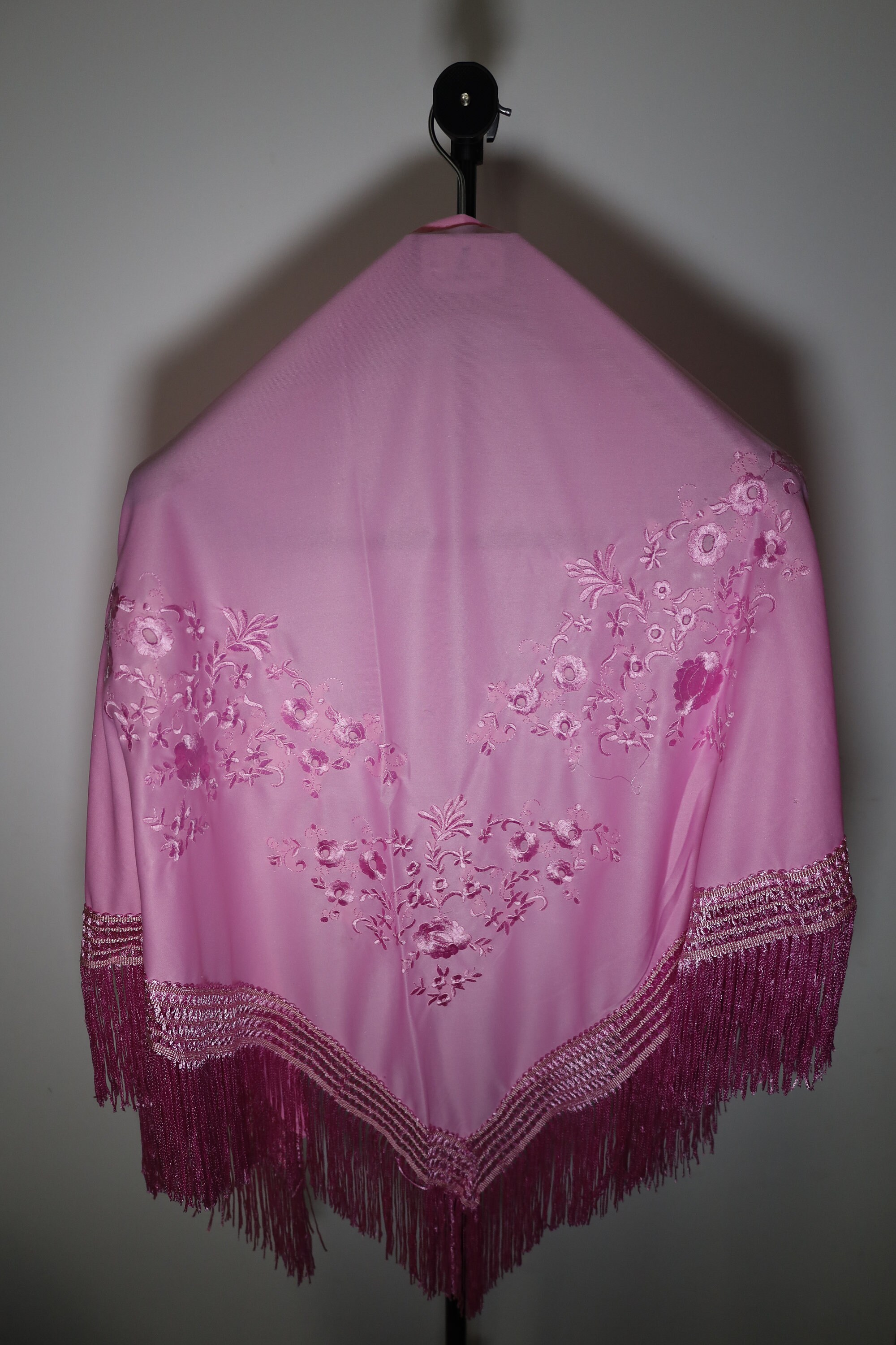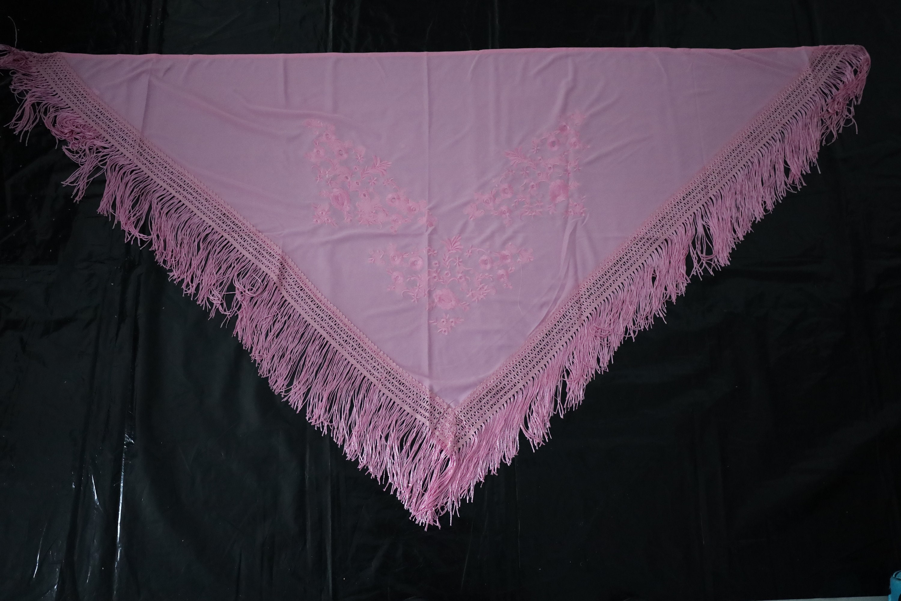 Immerse yourself in timeless elegance with this sumptuous pink Spanish shawl, a symbol of passion and refinement. Crafted from a silky, deep pink fabric, it is delicately embroidered with tone-on-tone floral motifs, adding a touch of sophistication and subtlety.