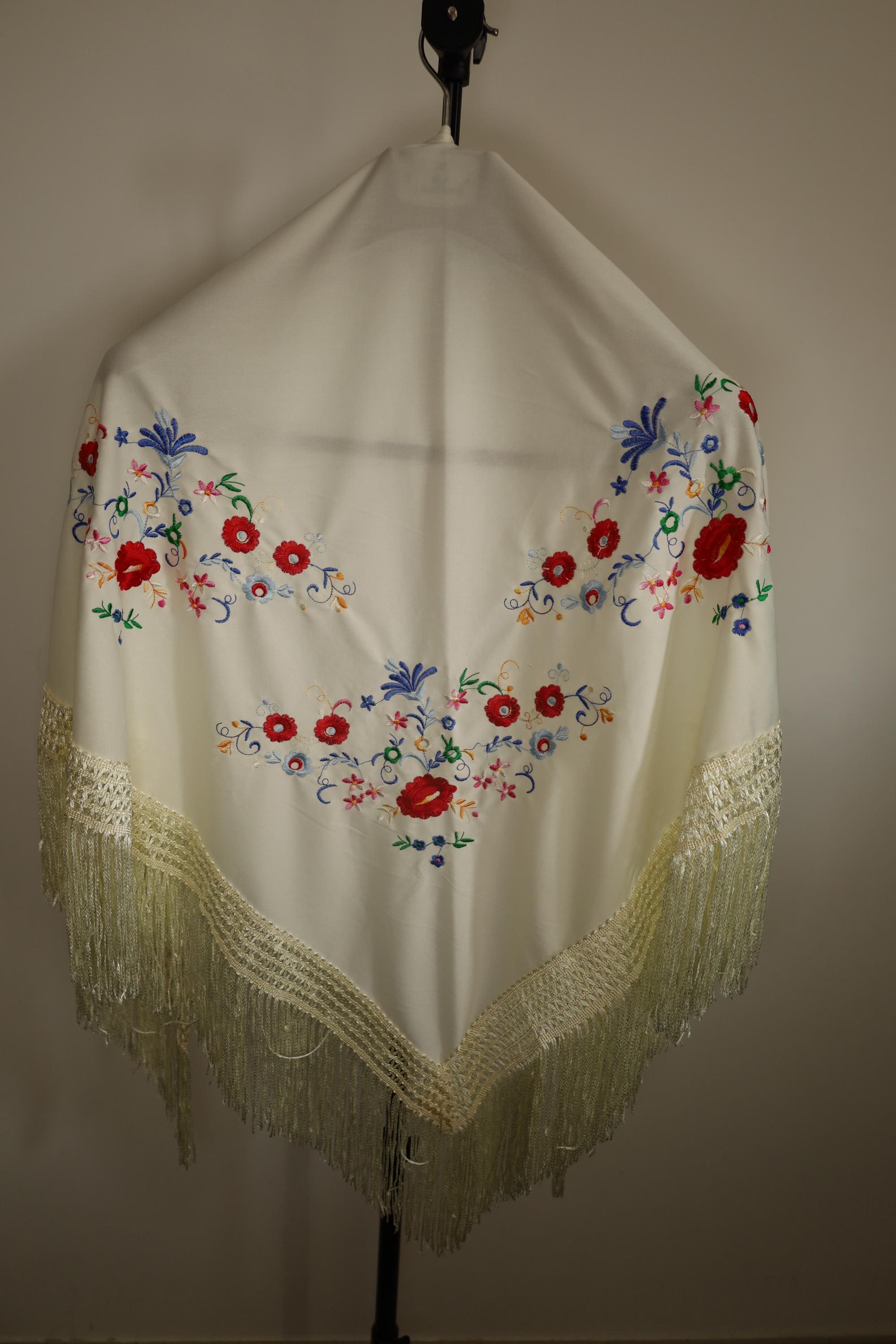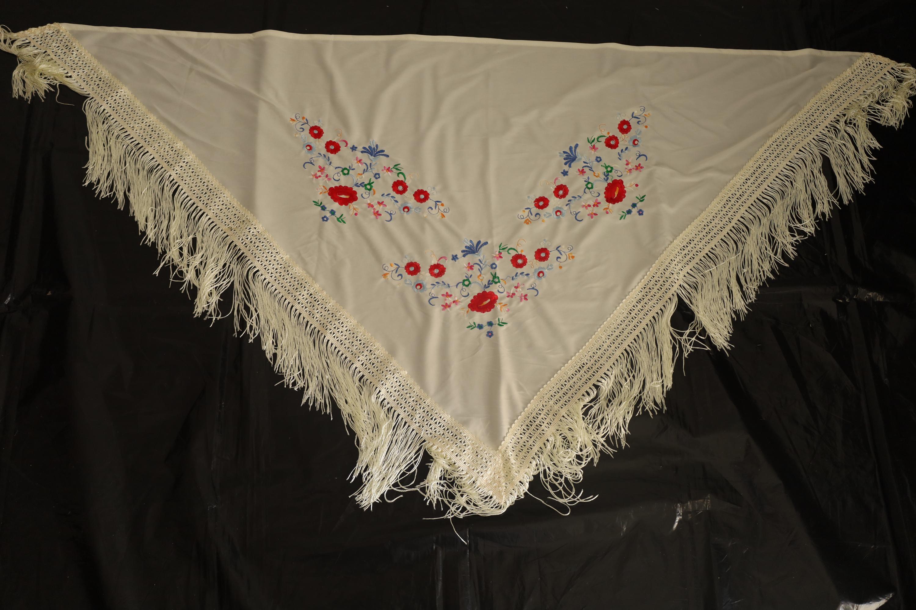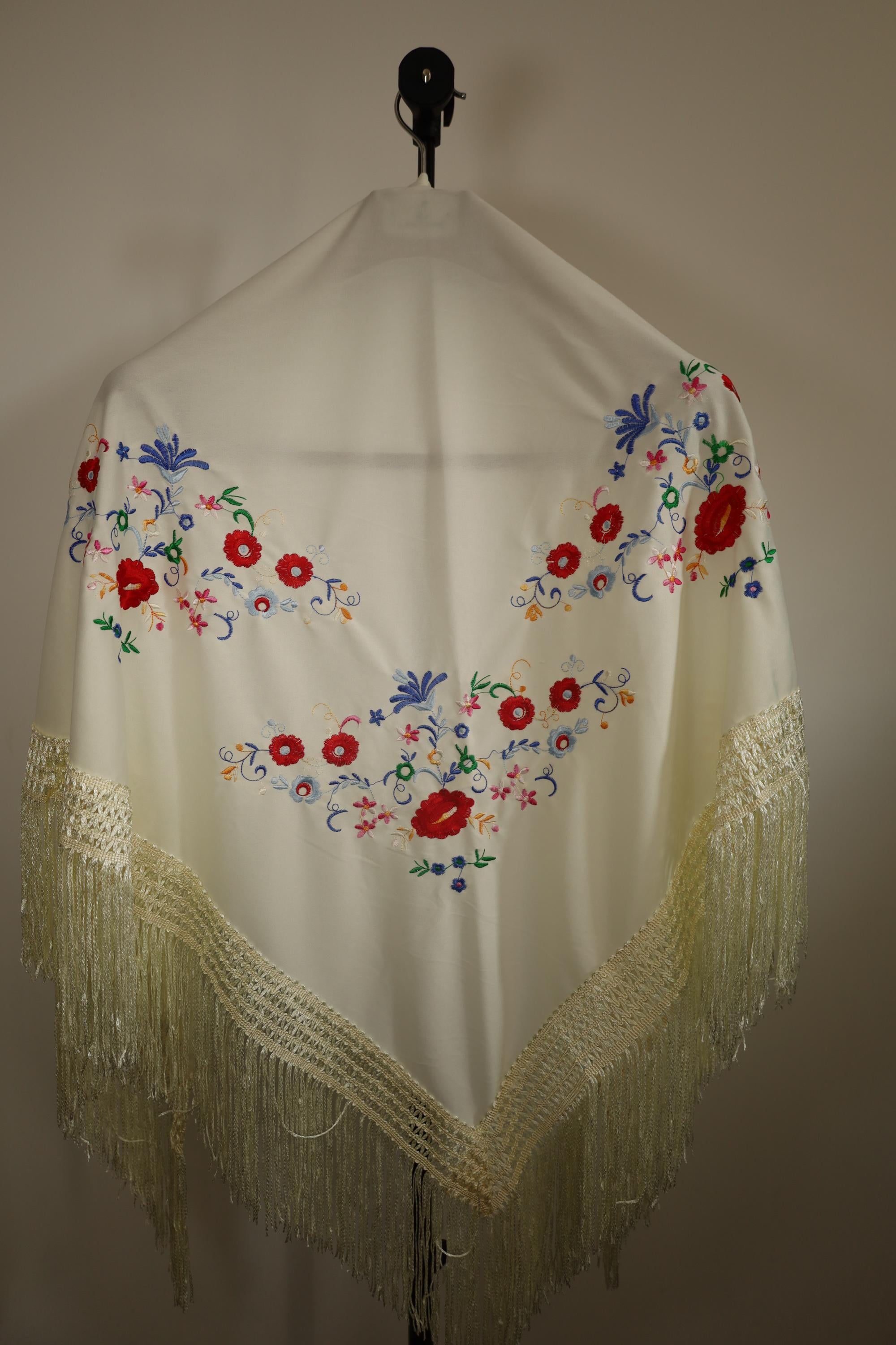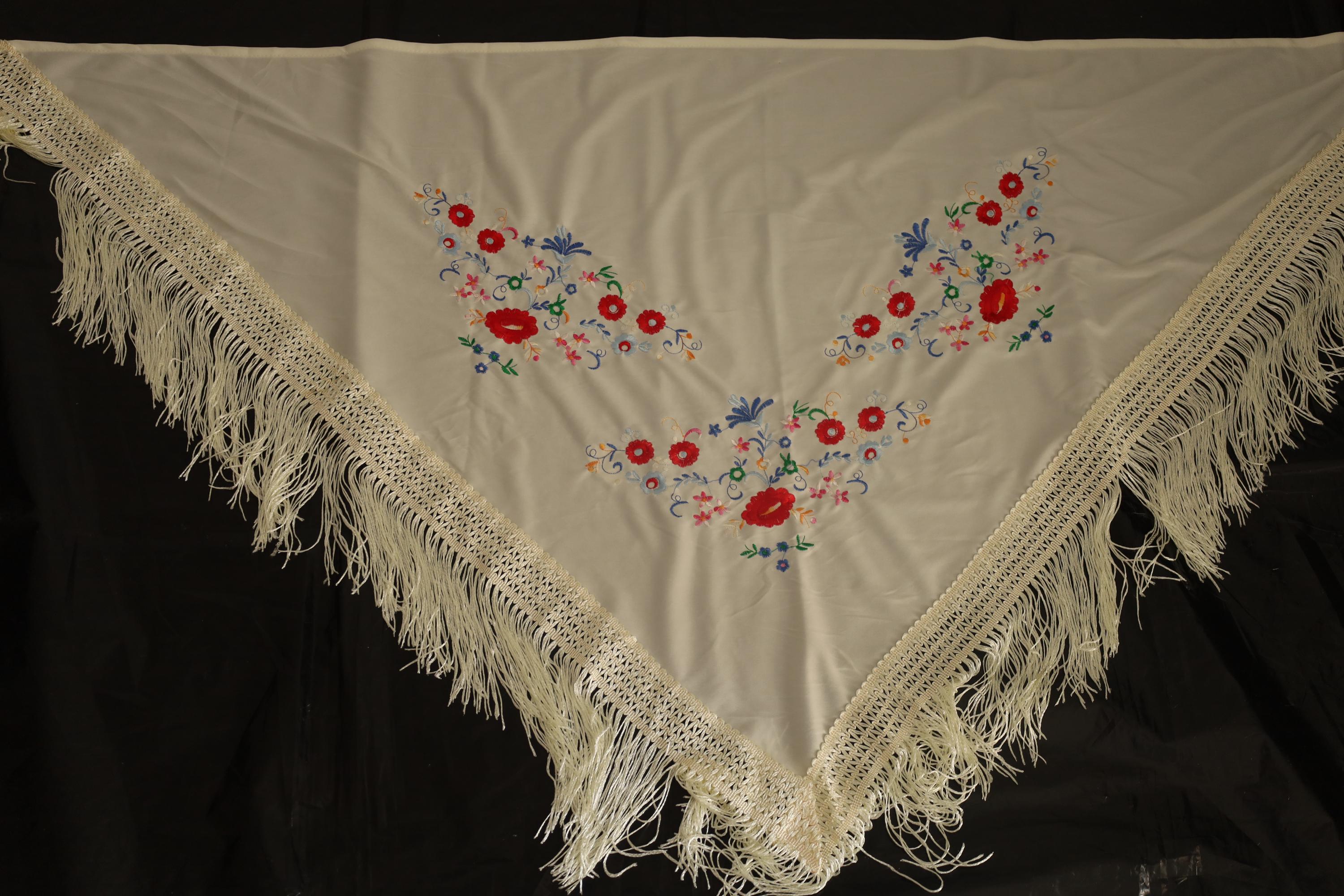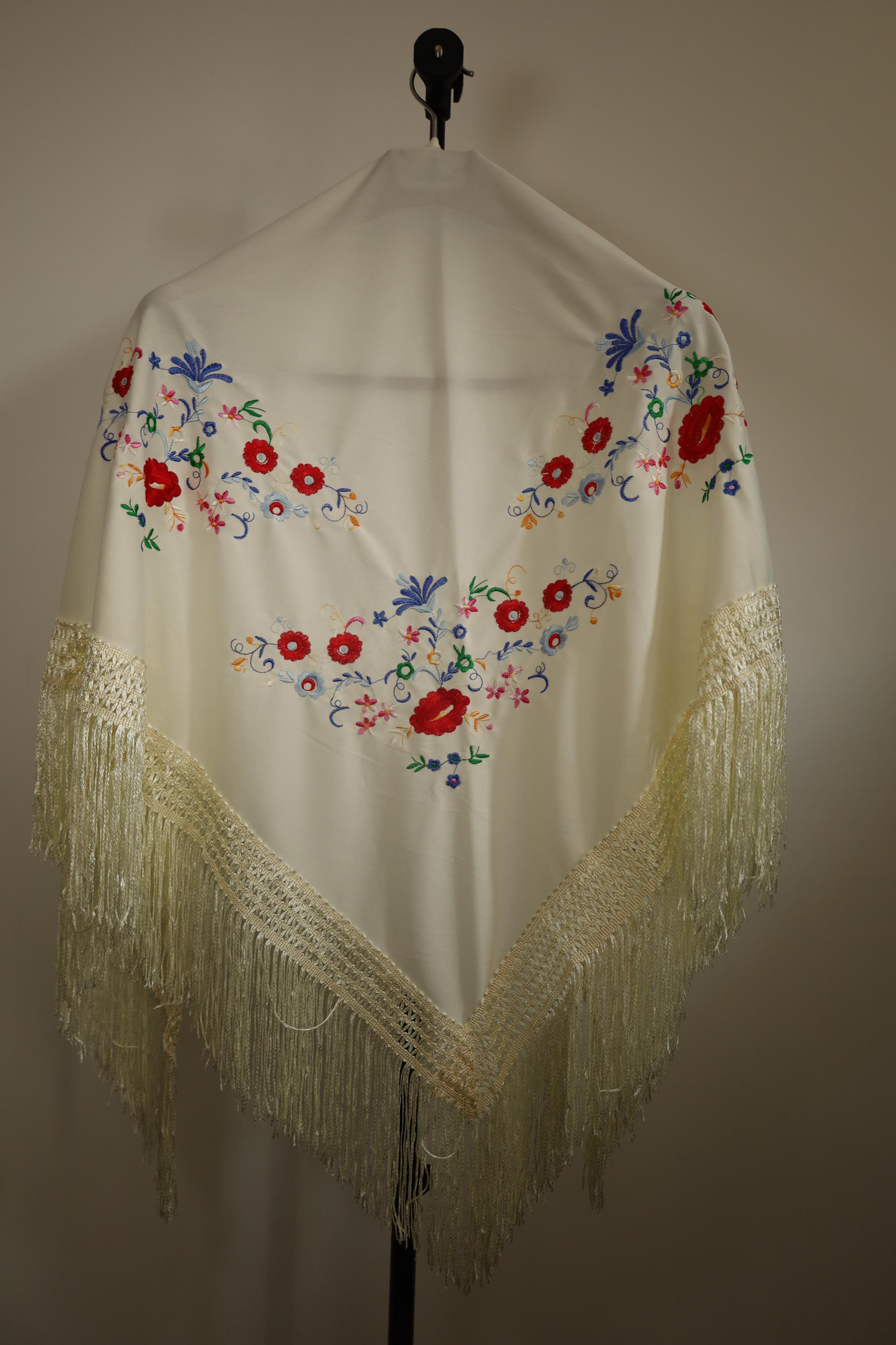 This magnificent shawl is a Manila mantón, a traditional accessory rich in history and elegance. It is made of cream-colored silk or satin fabric, adorned with colorful floral embroidery in vibrant hues such as red, blue, purple, green, and yellow. The floral motifs are arranged symmetrically and with refined elegance, creating a harmonious aesthetic.
