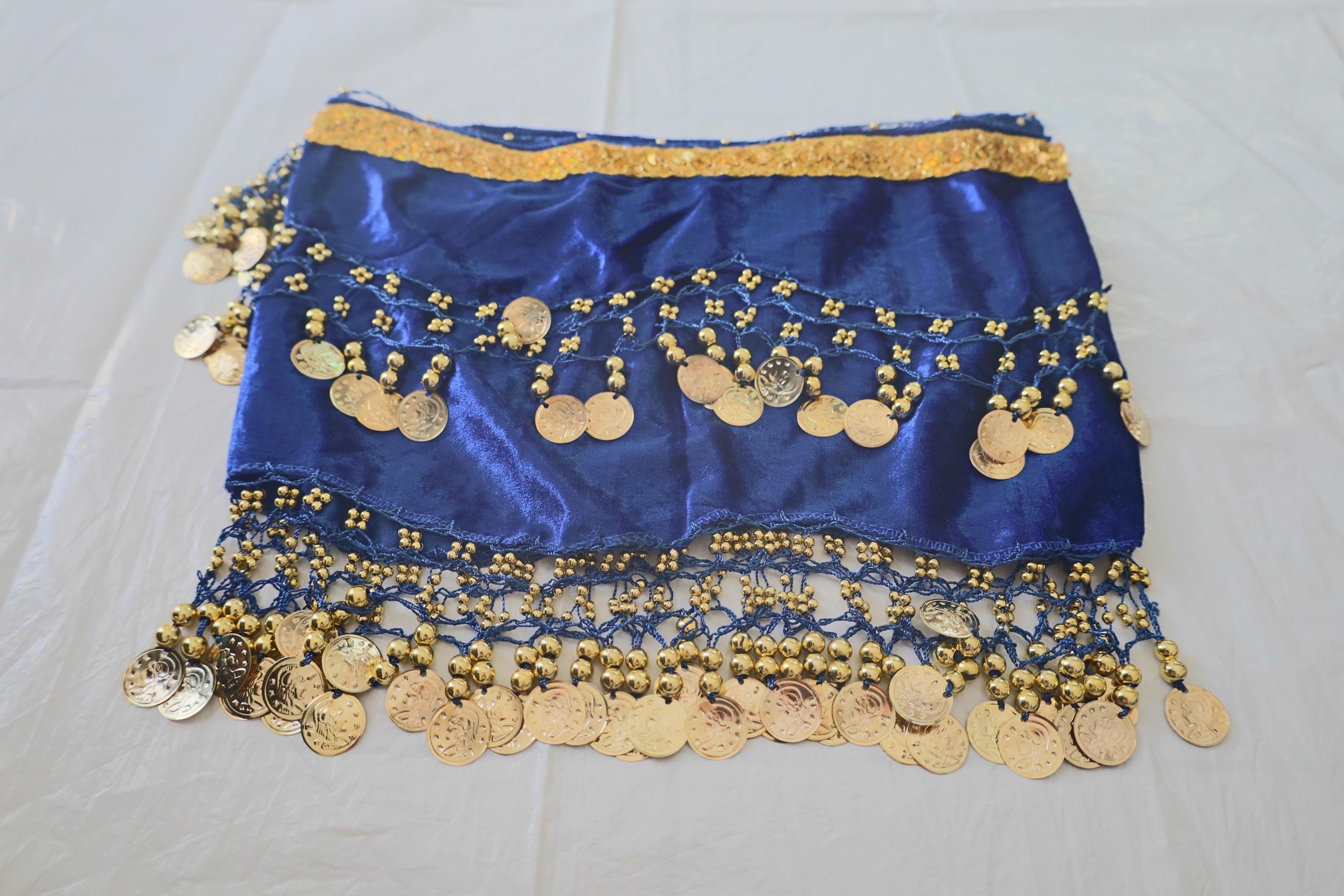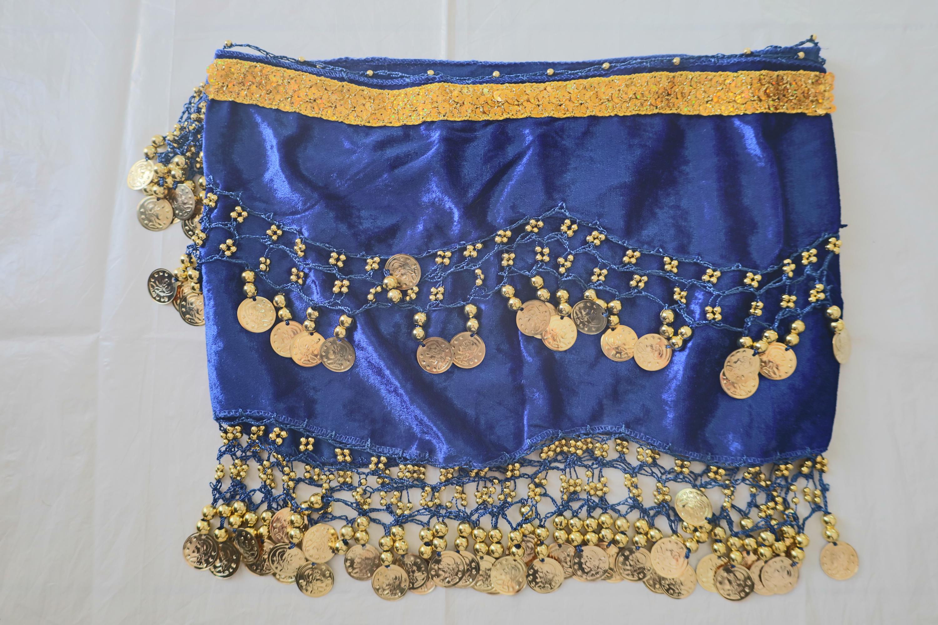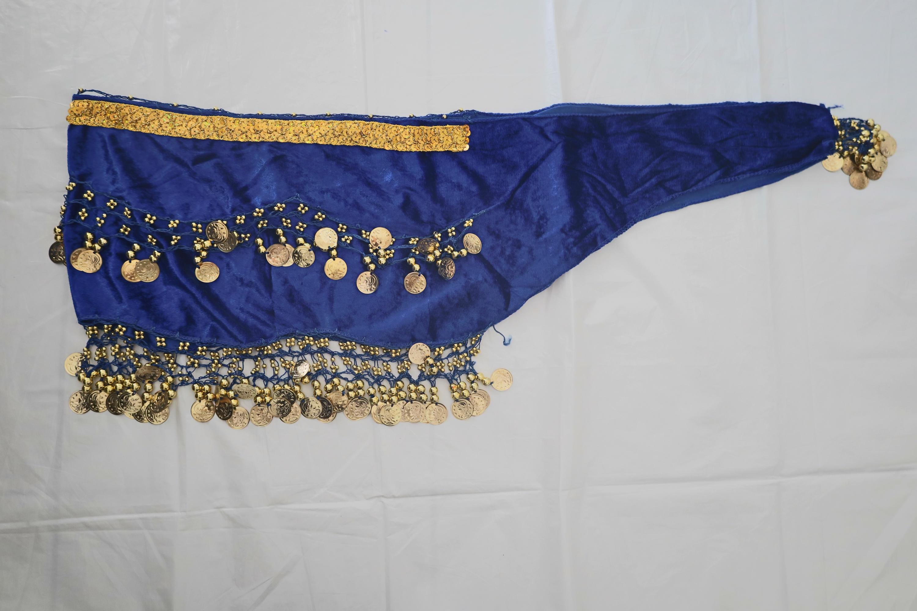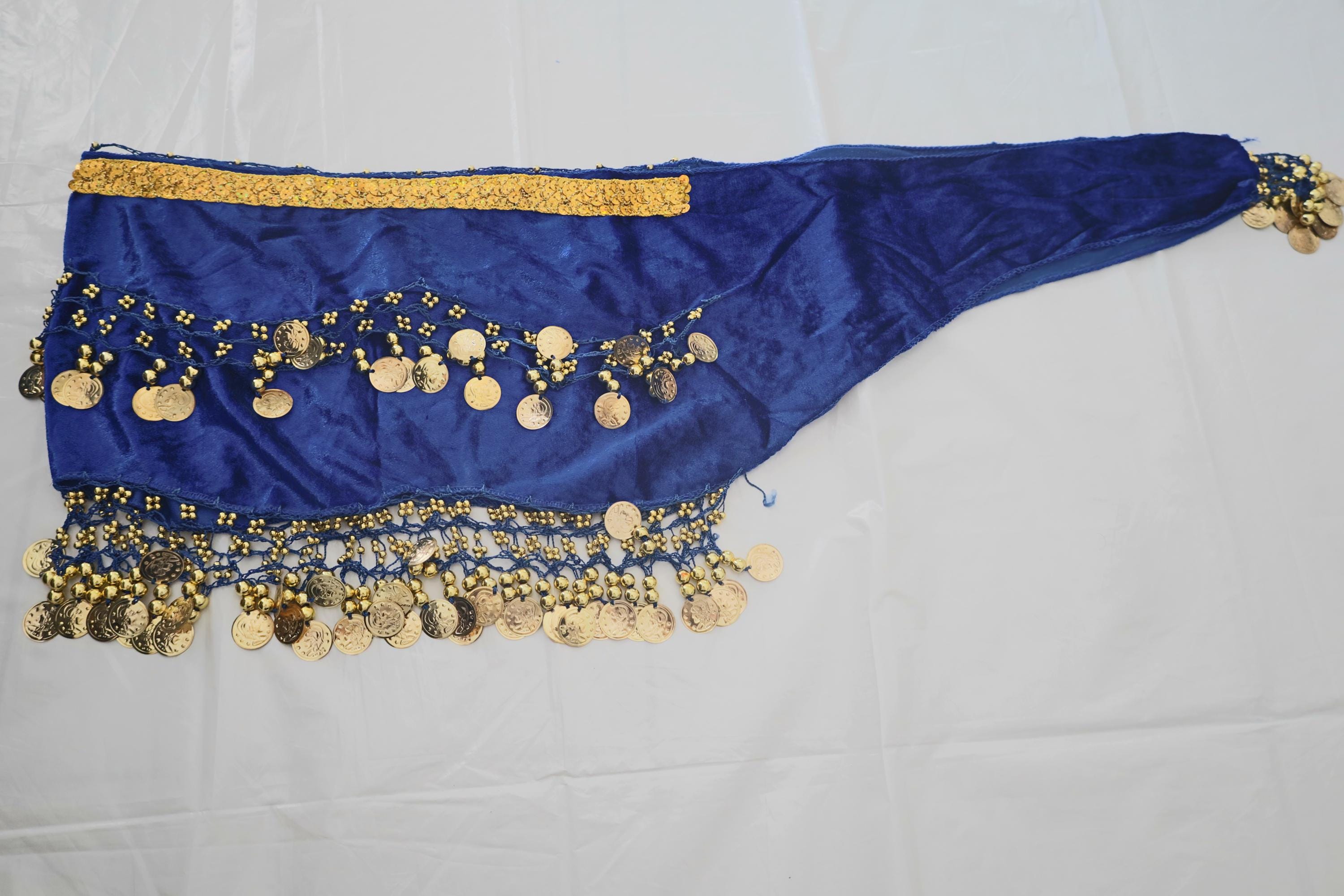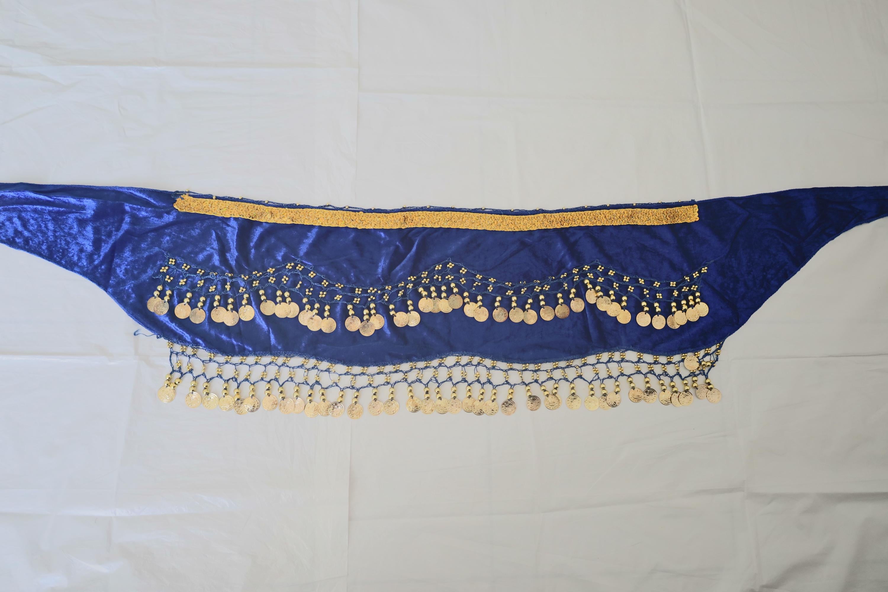 This dance shawl is a truly charming and elegant piece, perfect for enhancing an oriental or belly dance outfit. Crafted from sumptuous, deep navy velvet, it boasts a soft, shiny texture that beautifully captures the light with every movement.