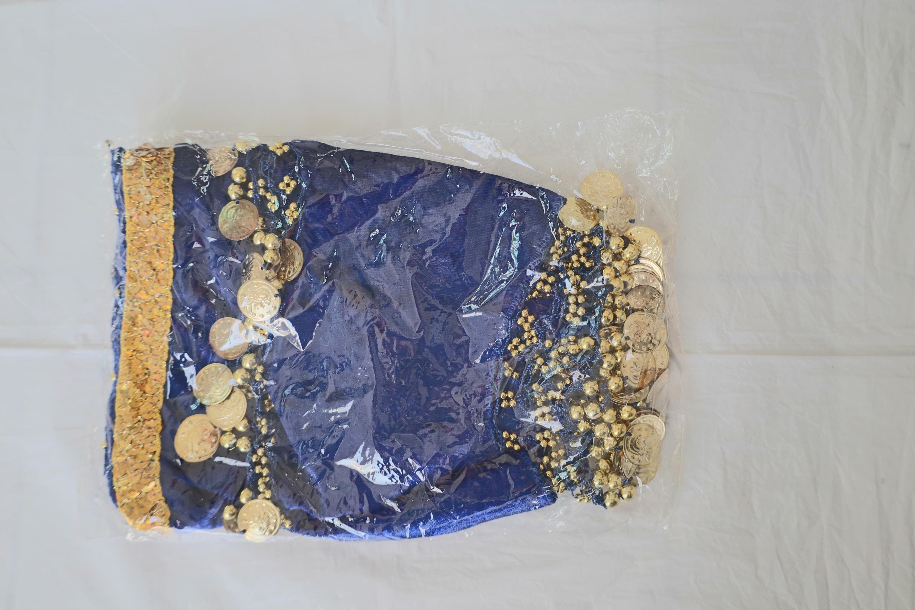 The top edge of the shawl is adorned with an elegant embroidered gold band, adding an extra touch of refinement. Along the bottom edge, rows of intertwined navy blue beads support multiple small metallic gold coins that delicately tink with every step. These intricately engraved coins are arranged in harmonious garlands, creating a captivating visual and audio effect.