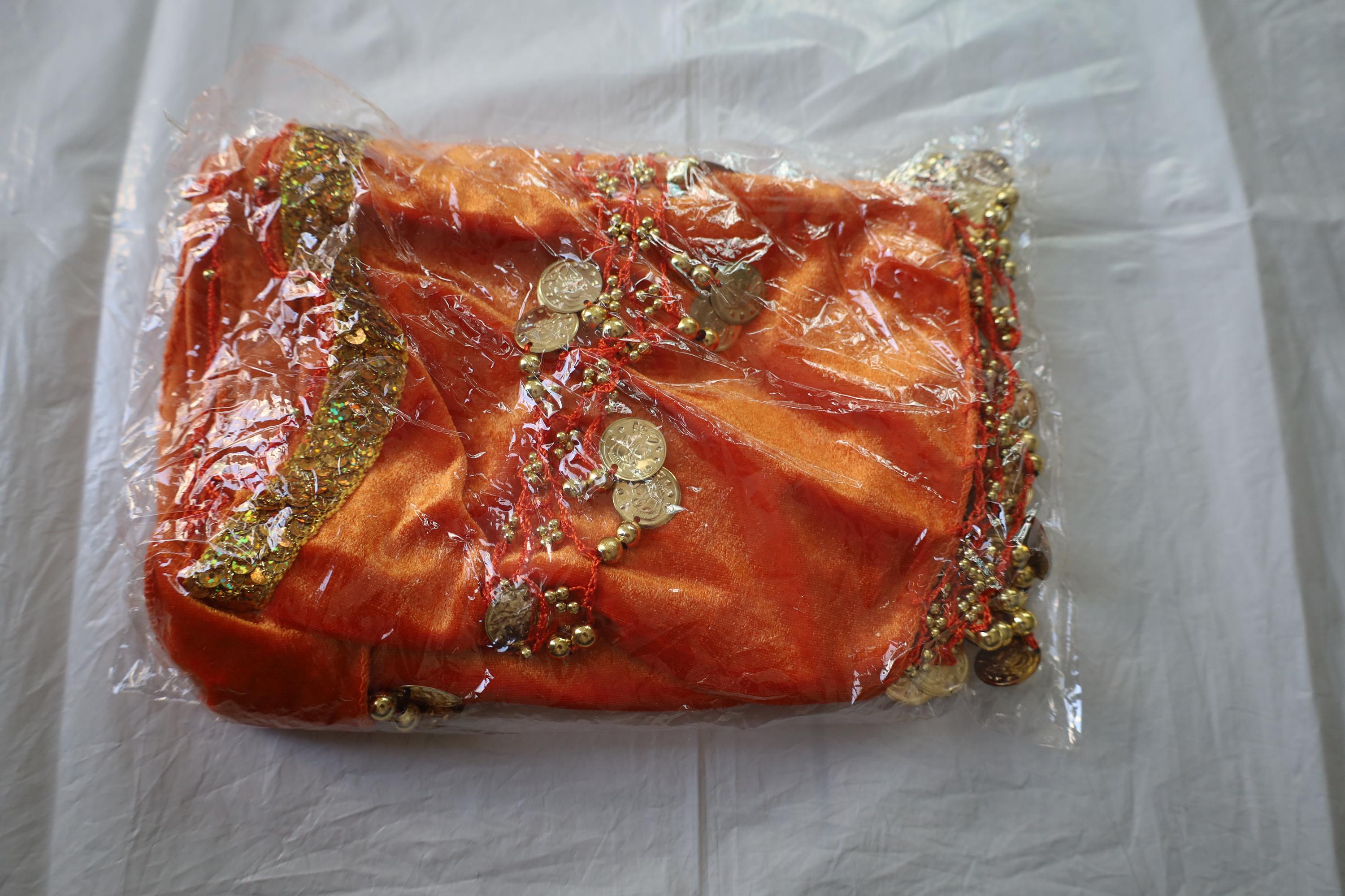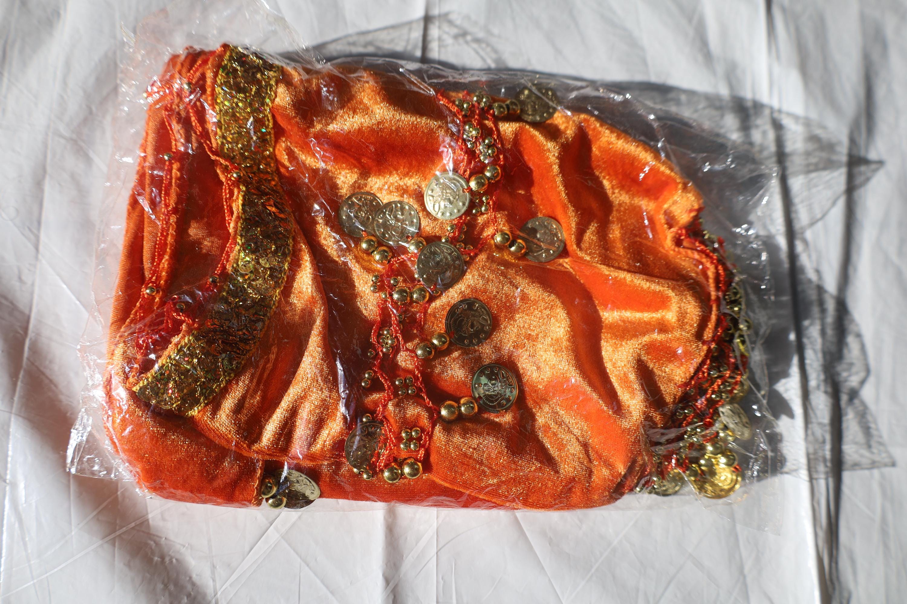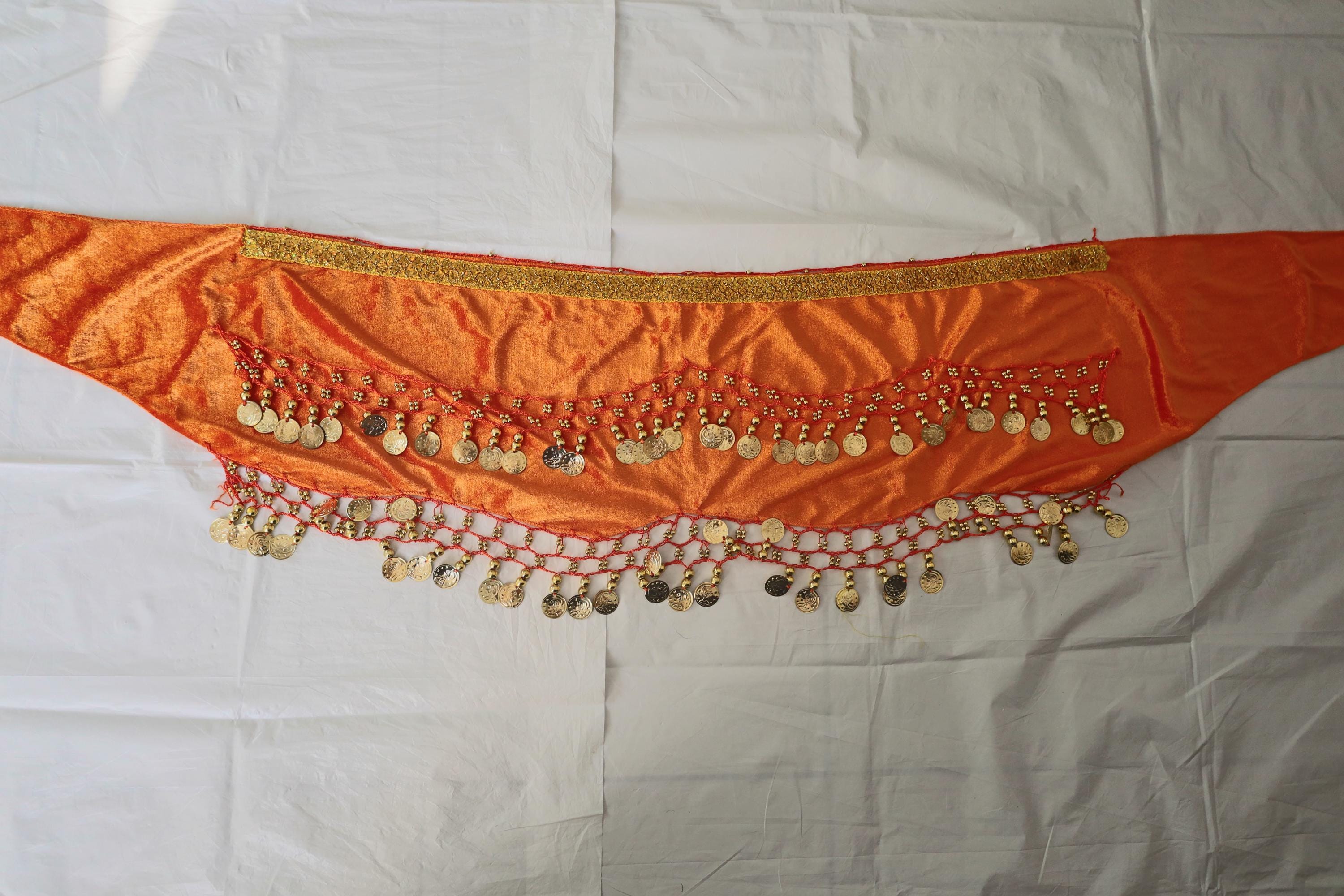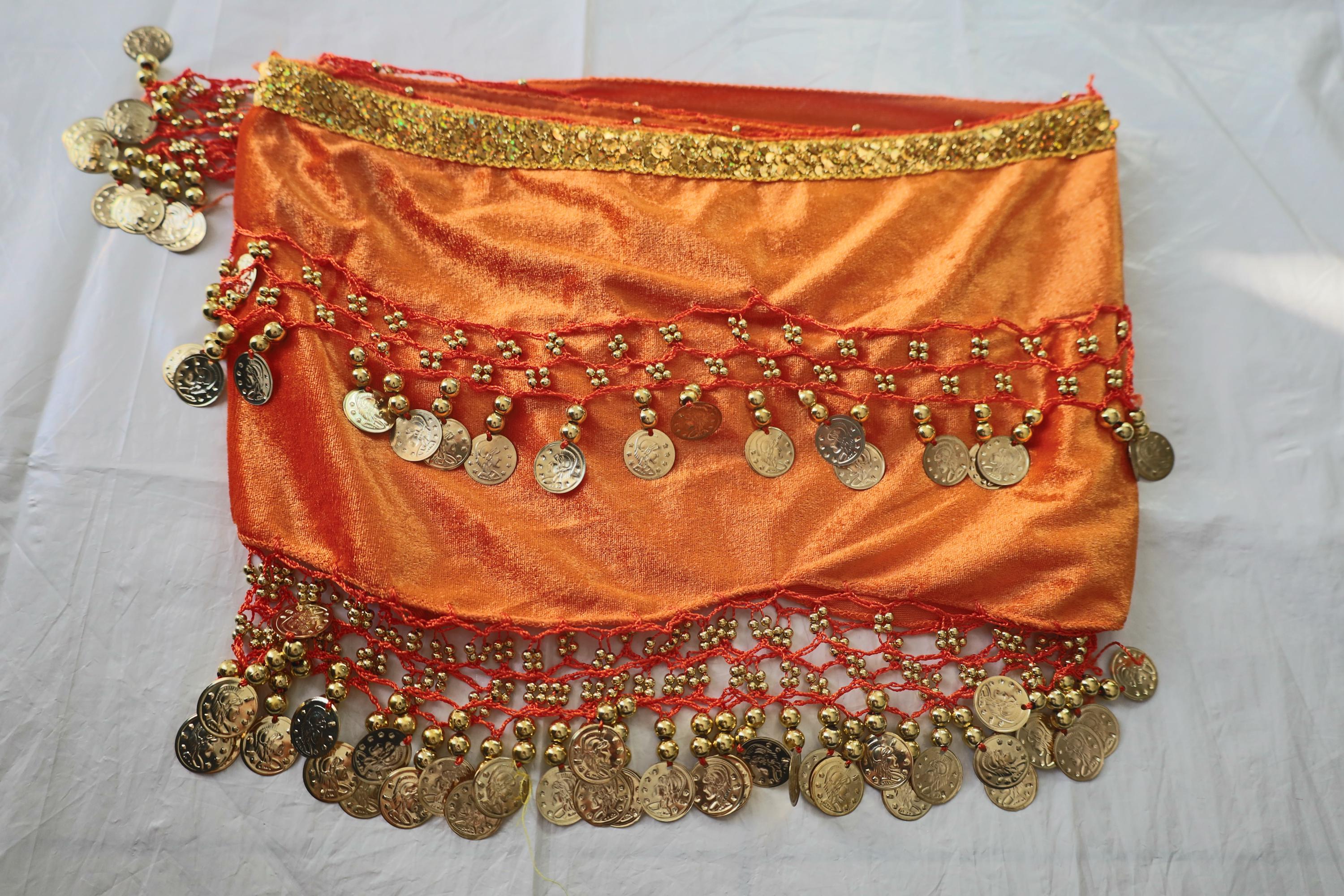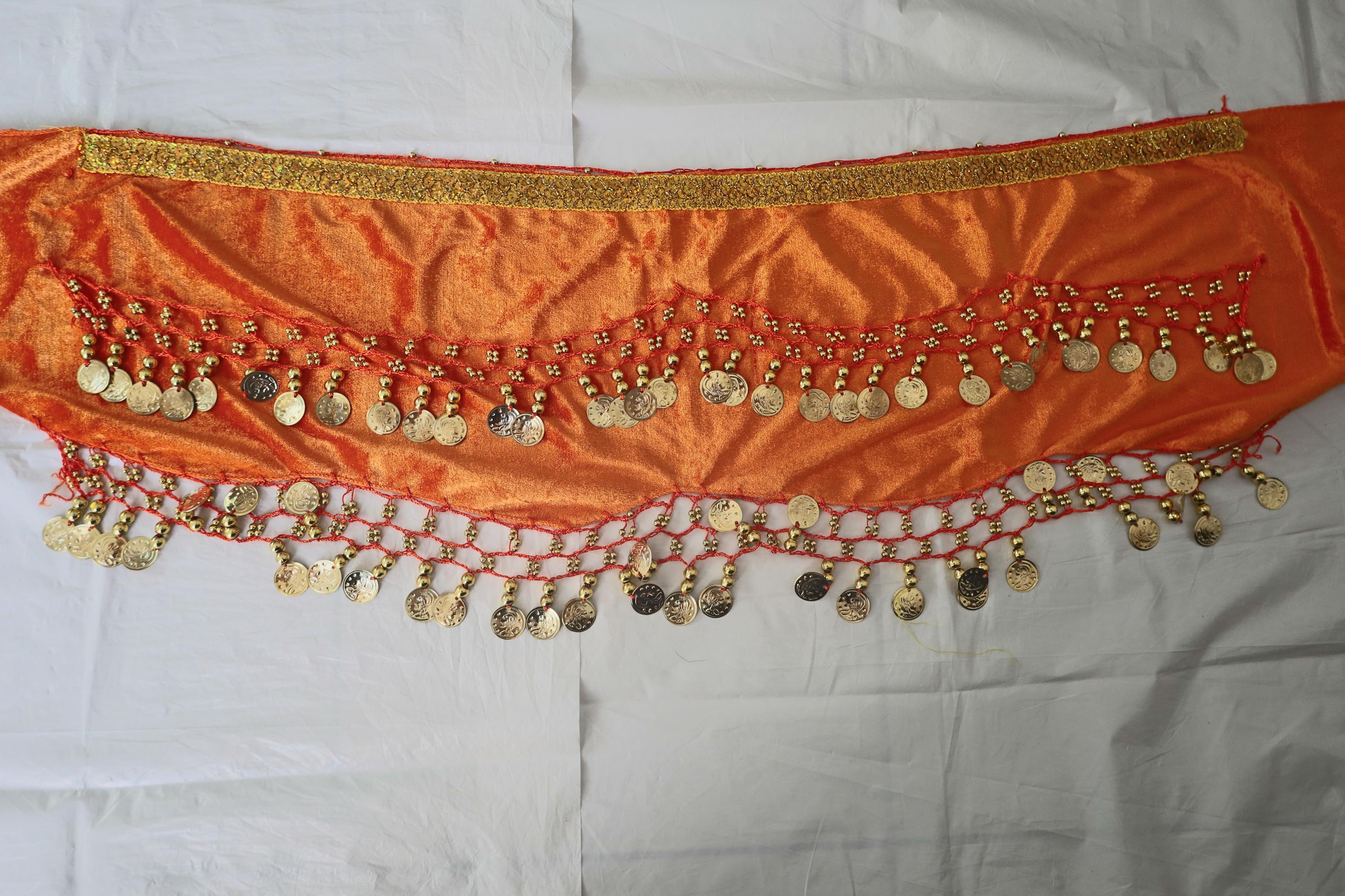 This dance shawl is a truly charming and elegant piece, perfect for enhancing an oriental or belly dance outfit. Crafted from sumptuous orange velvet, it boasts a soft, shiny texture that beautifully captures the light with every movement.