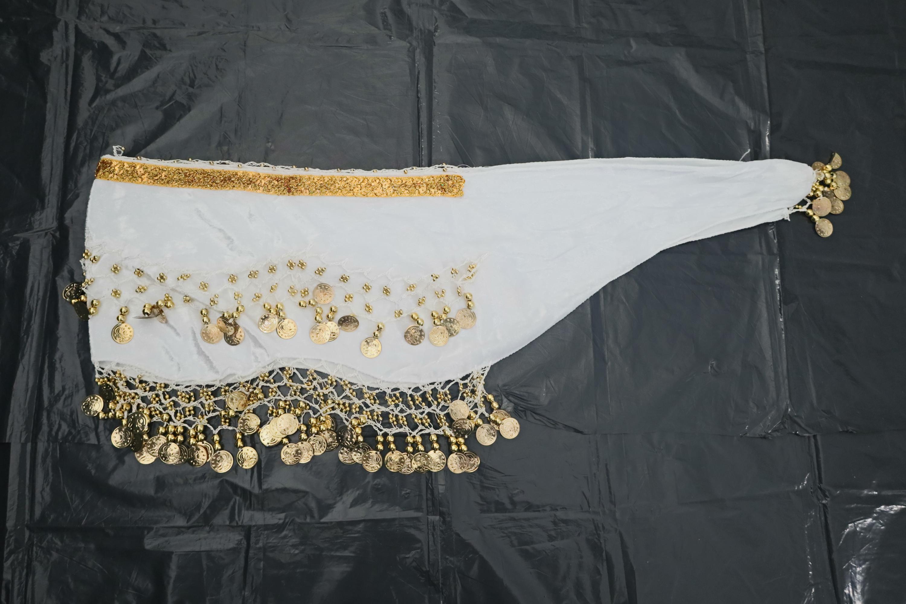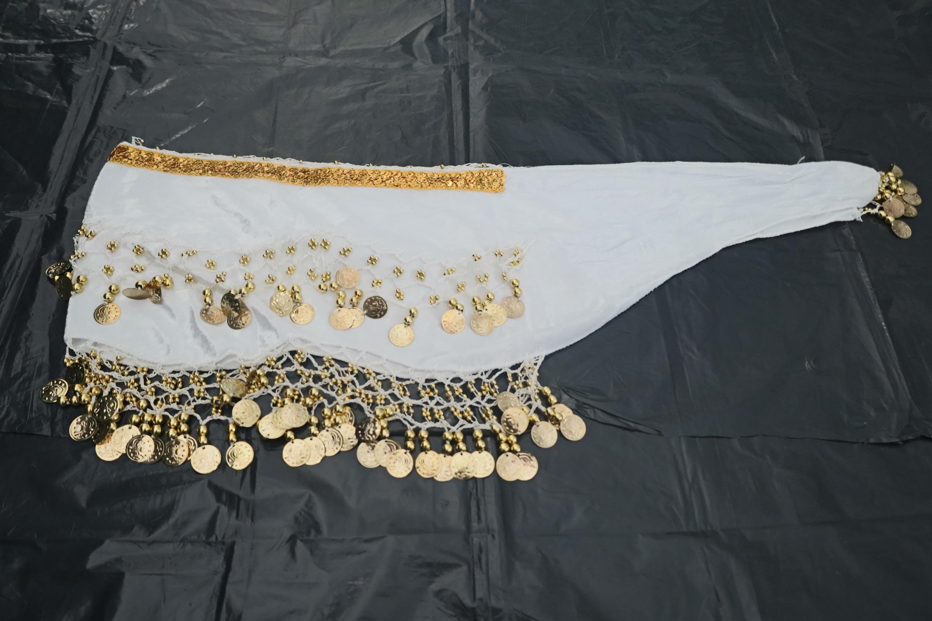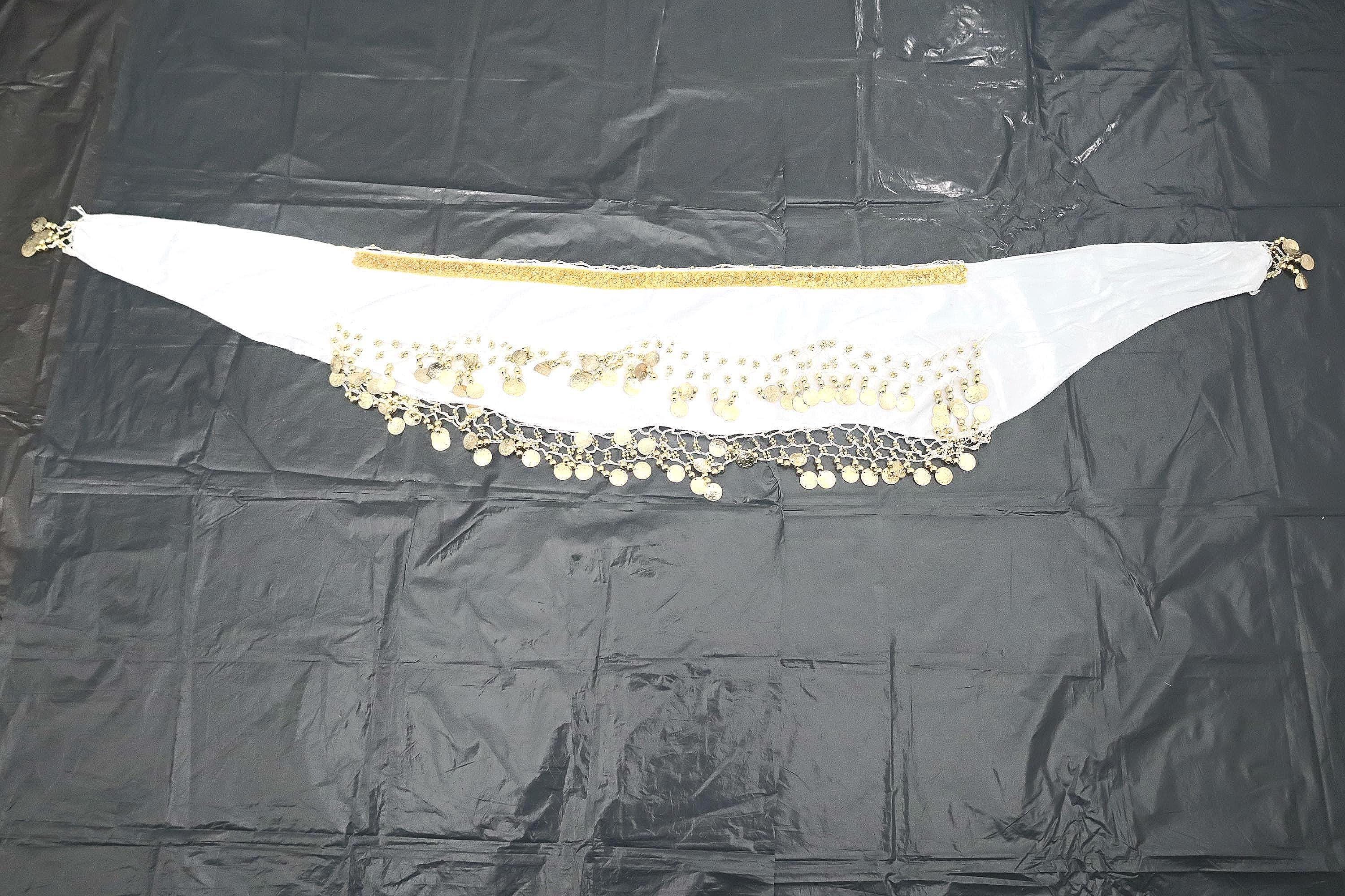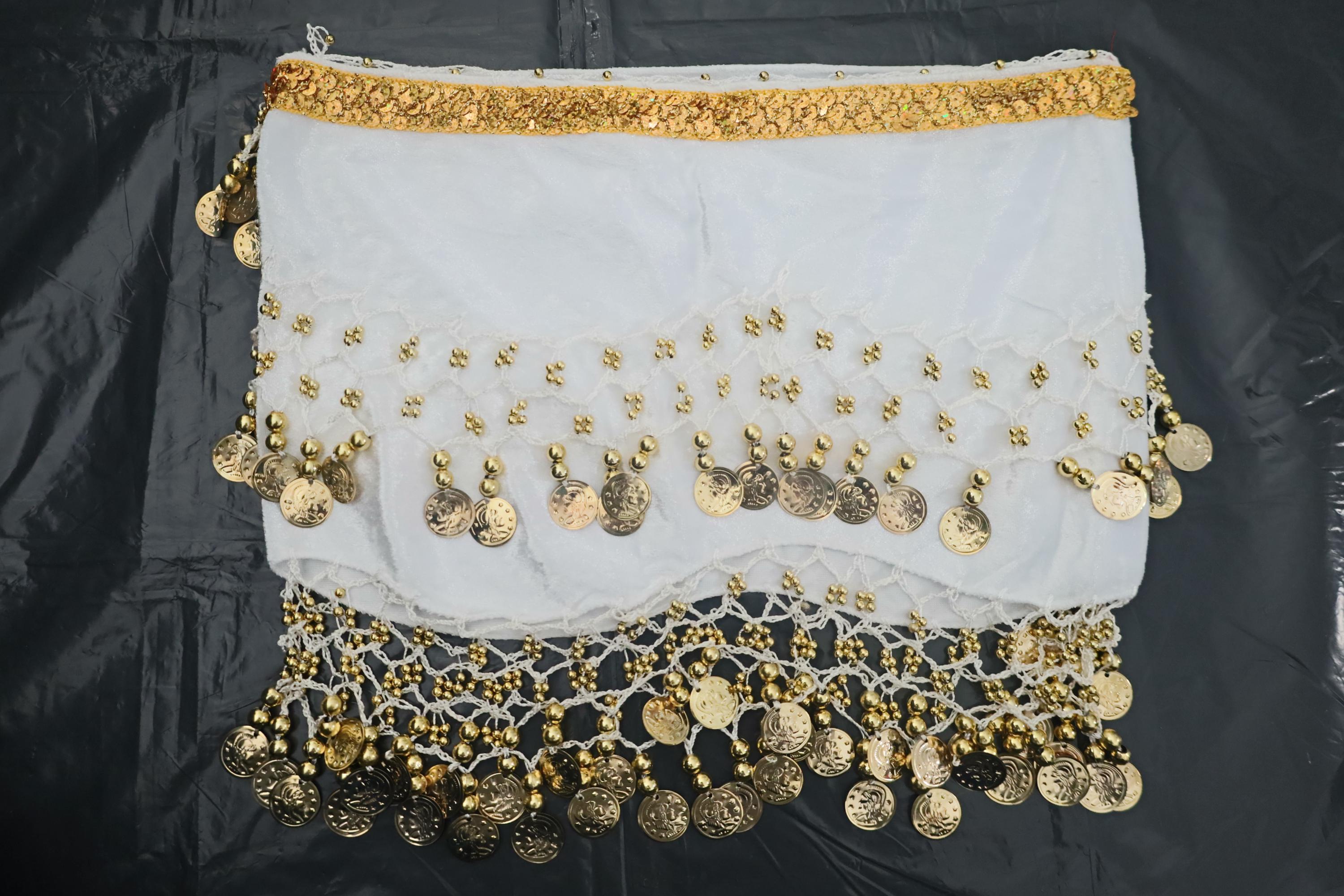 This dance shawl is a truly charming and elegant piece, ideal for enhancing an oriental or belly dance outfit. Crafted from sumptuous, bright snow-white velvet, it boasts a soft, shiny texture that beautifully captures the light with every movement.