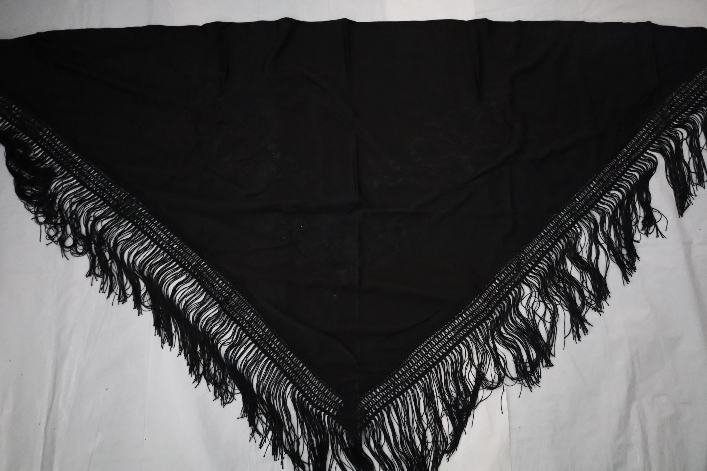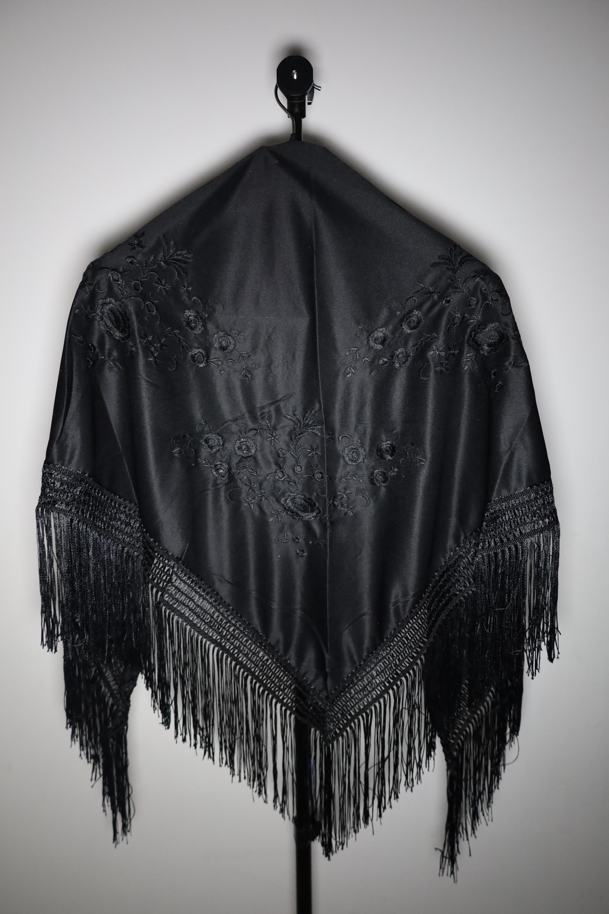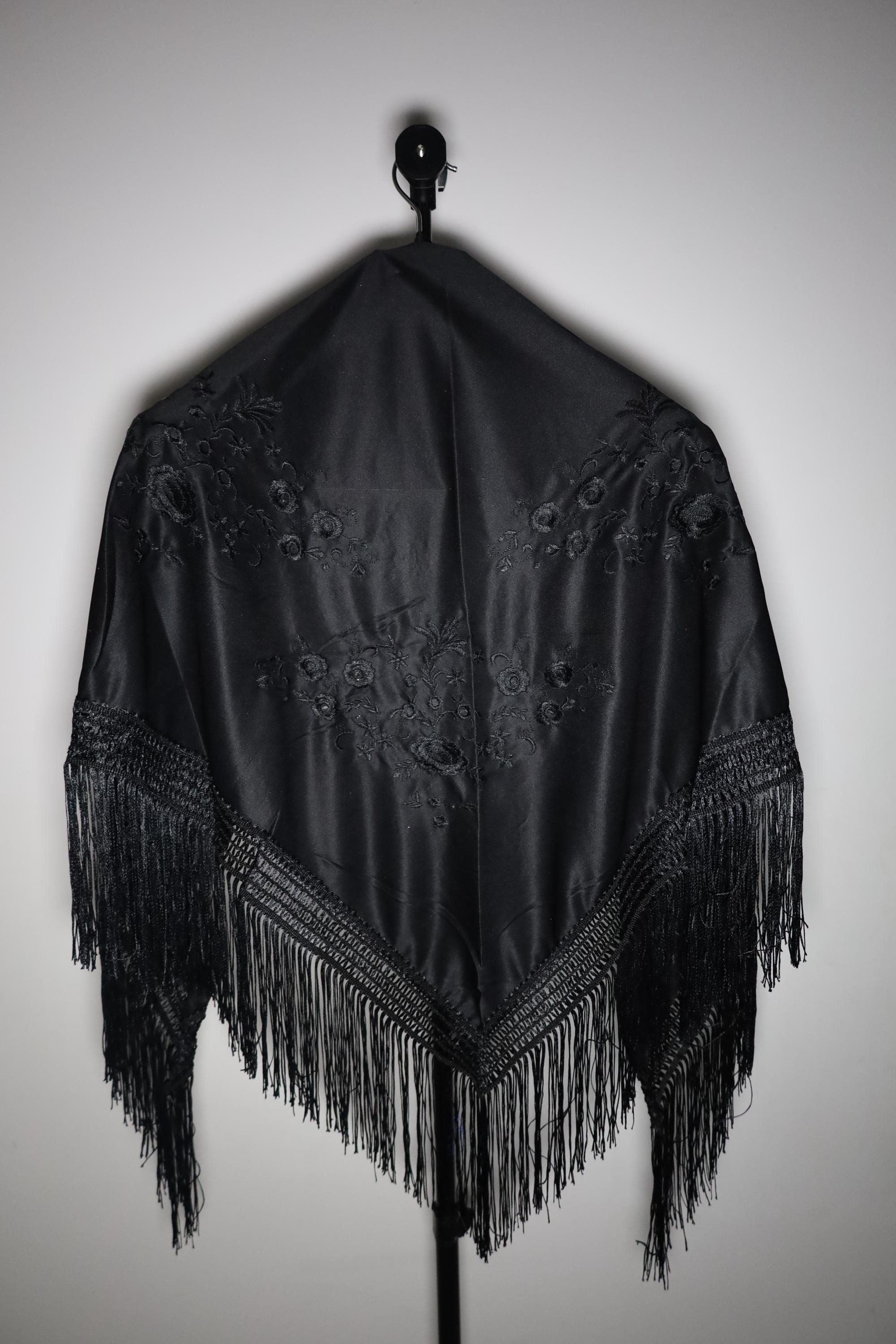Immerse yourself in timeless elegance with this sumptuous black Spanish shawl, a symbol of passion and refinement. Crafted from a silky, deep black fabric, it is delicately embroidered with tone-on-tone floral motifs, adding a touch of sophistication and subtlety.