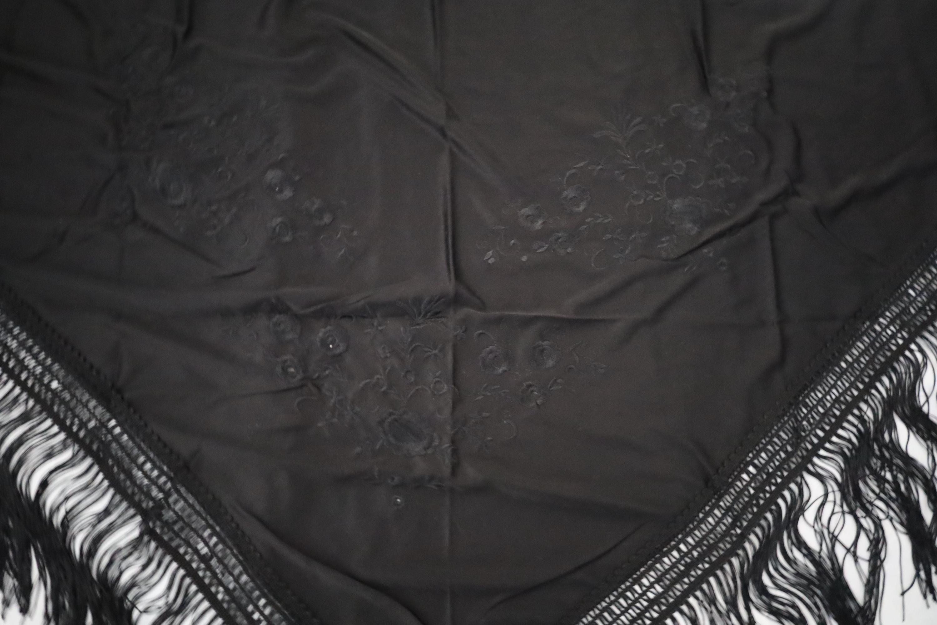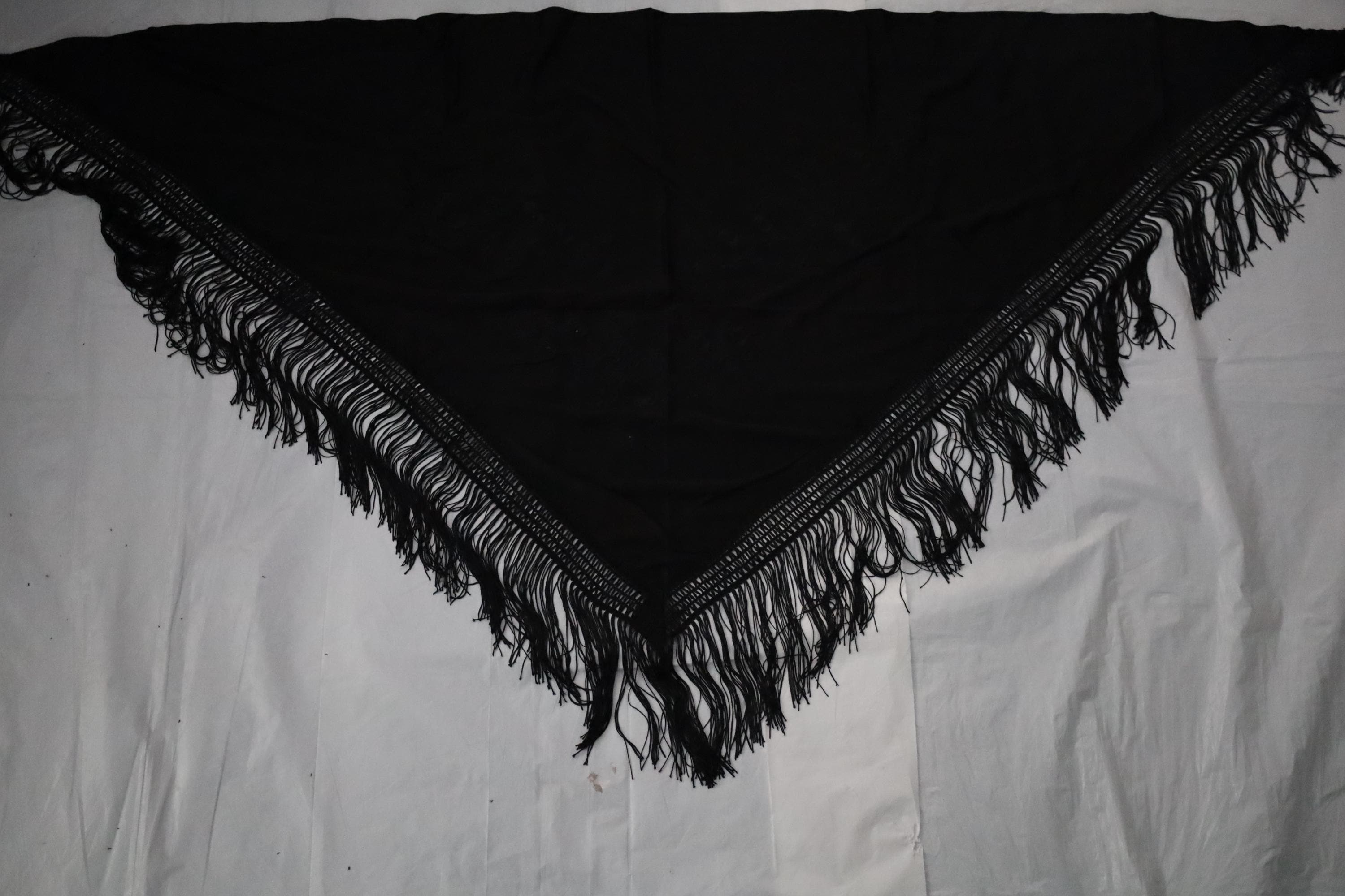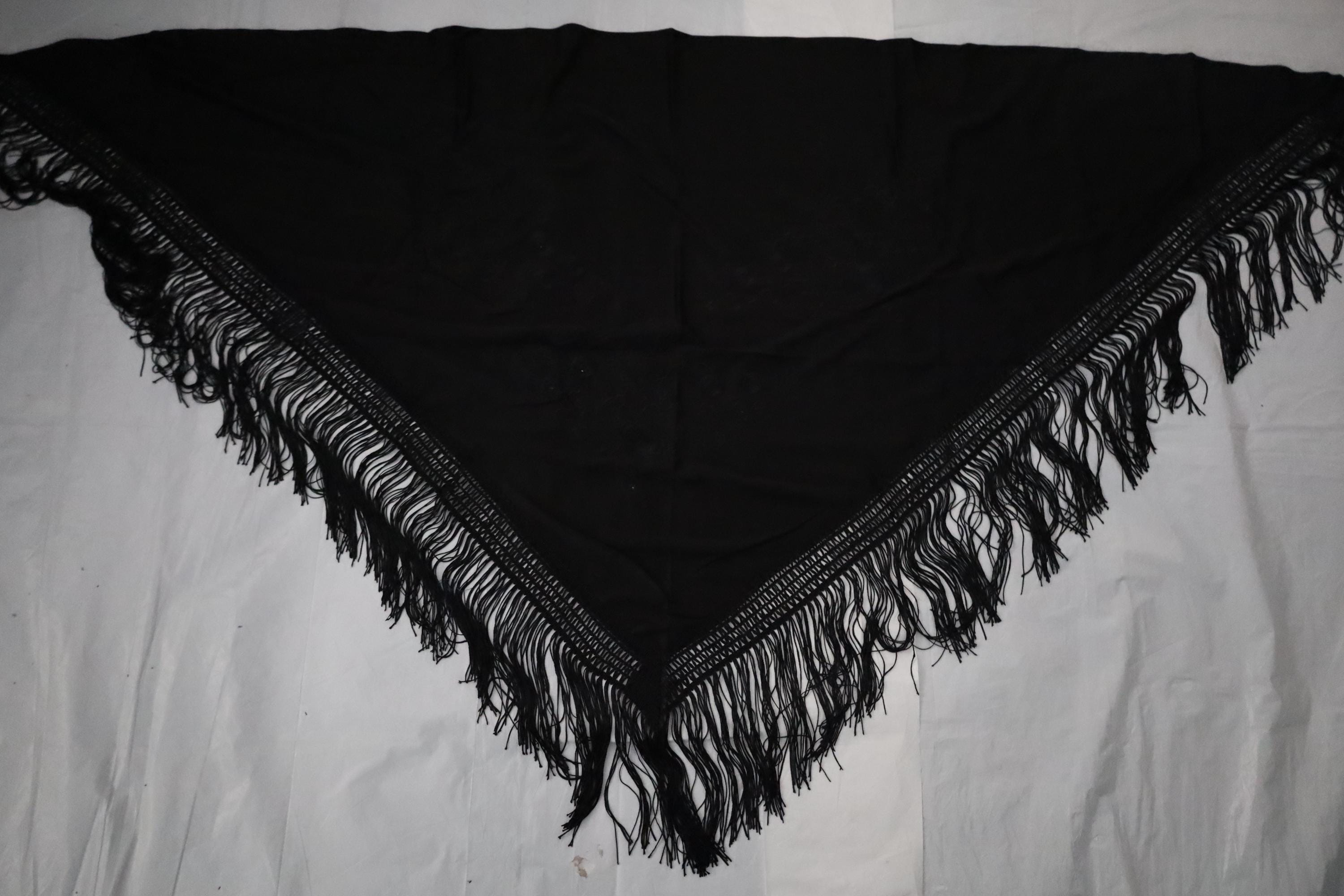 Immerse yourself in timeless elegance with this sumptuous black Spanish shawl, a symbol of passion and refinement. Crafted from a silky, deep black fabric, it is delicately embroidered with tone-on-tone floral motifs, adding a touch of sophistication and subtlety.