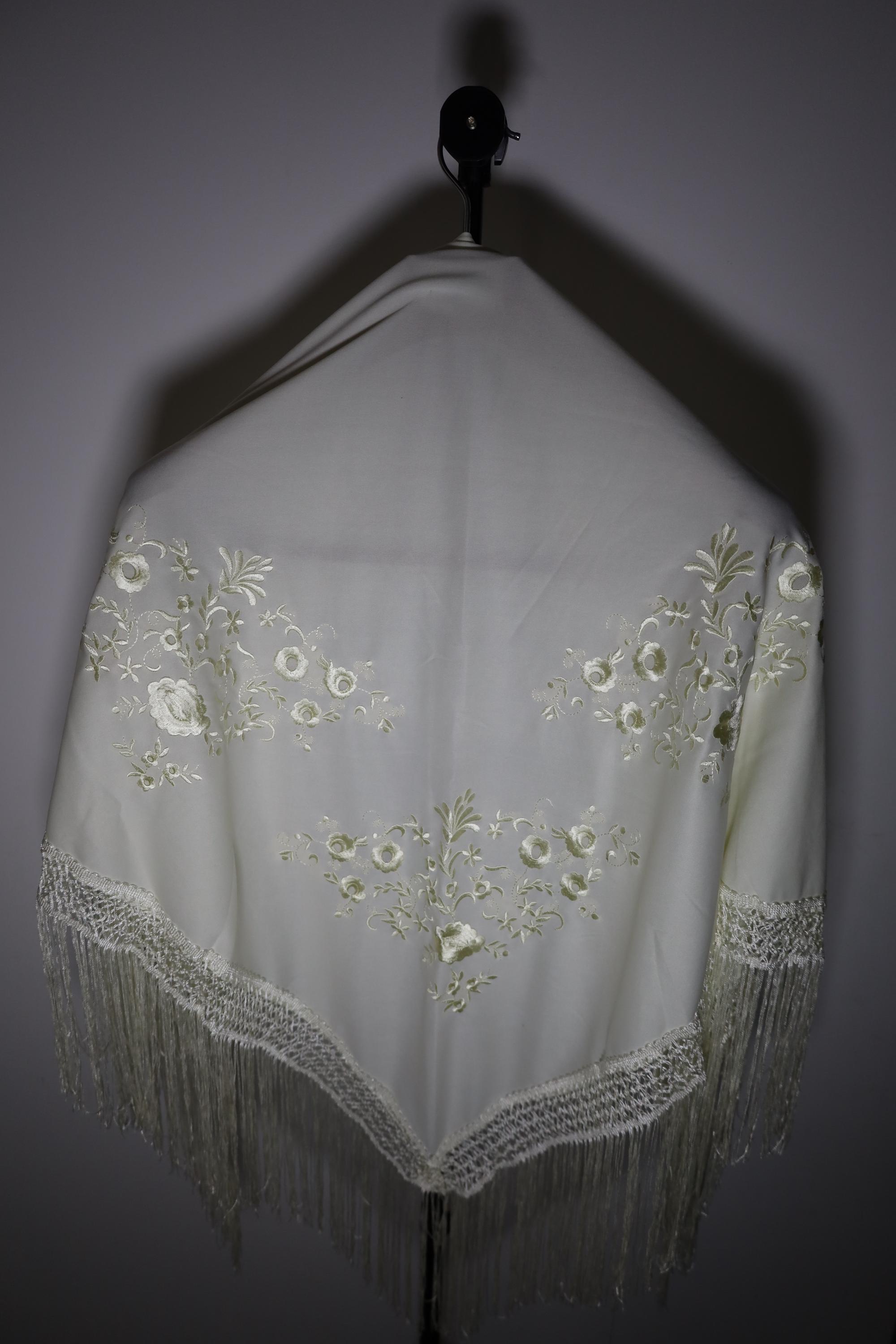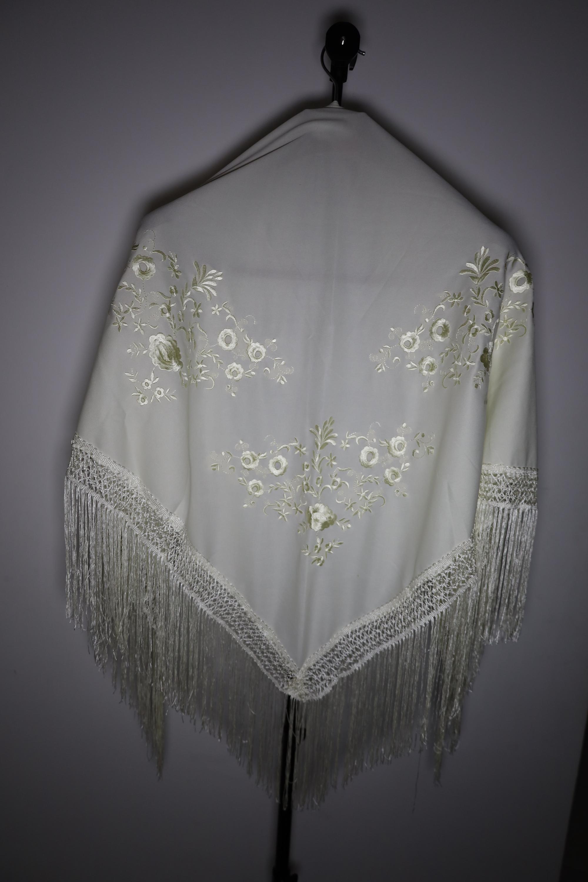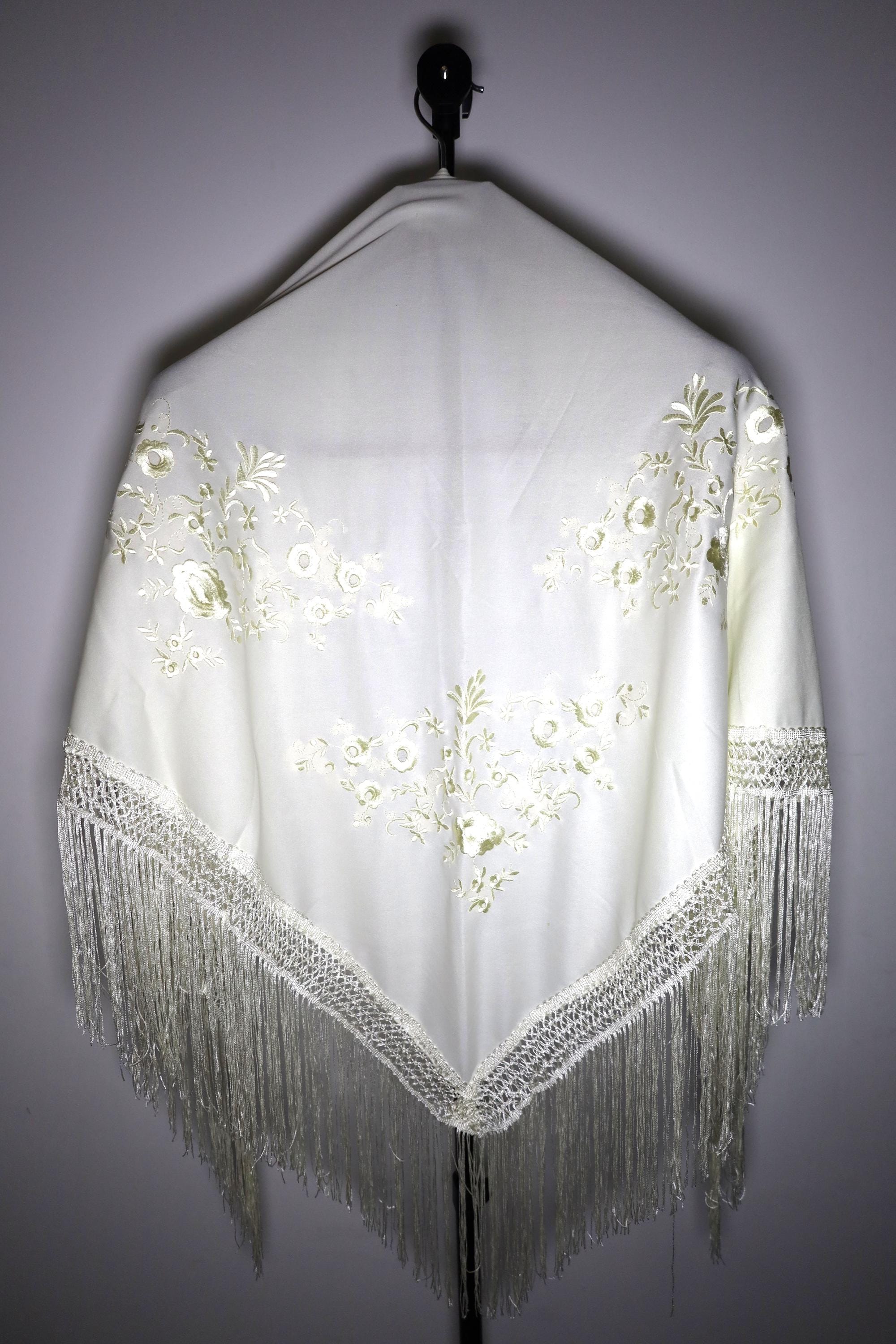Immerse yourself in timeless elegance with this sumptuous beige Spanish shawl, a symbol of passion and refinement. Crafted from a silky, deep beige fabric, it is delicately embroidered with tone-on-tone floral motifs, adding a touch of sophistication and subtlety.