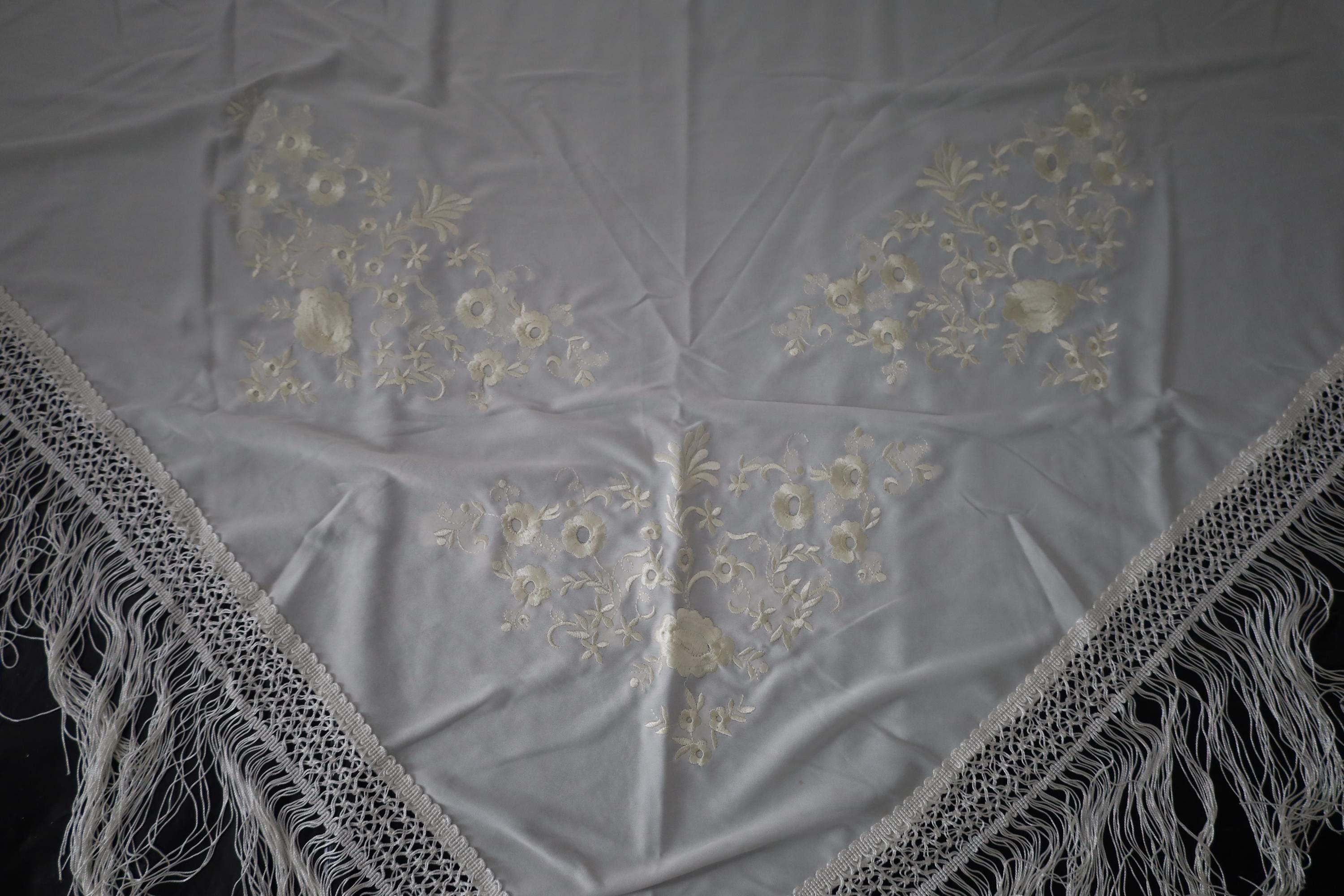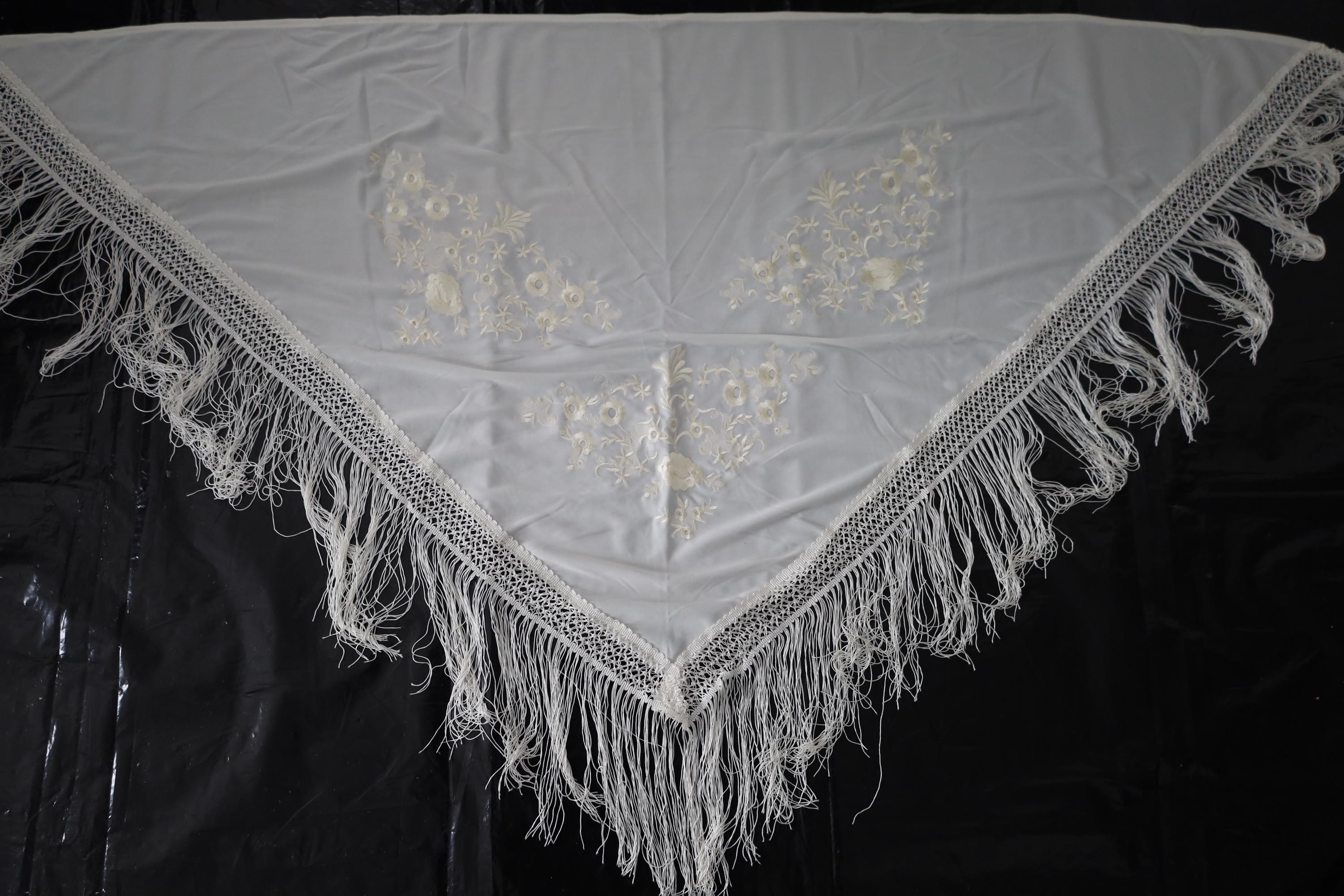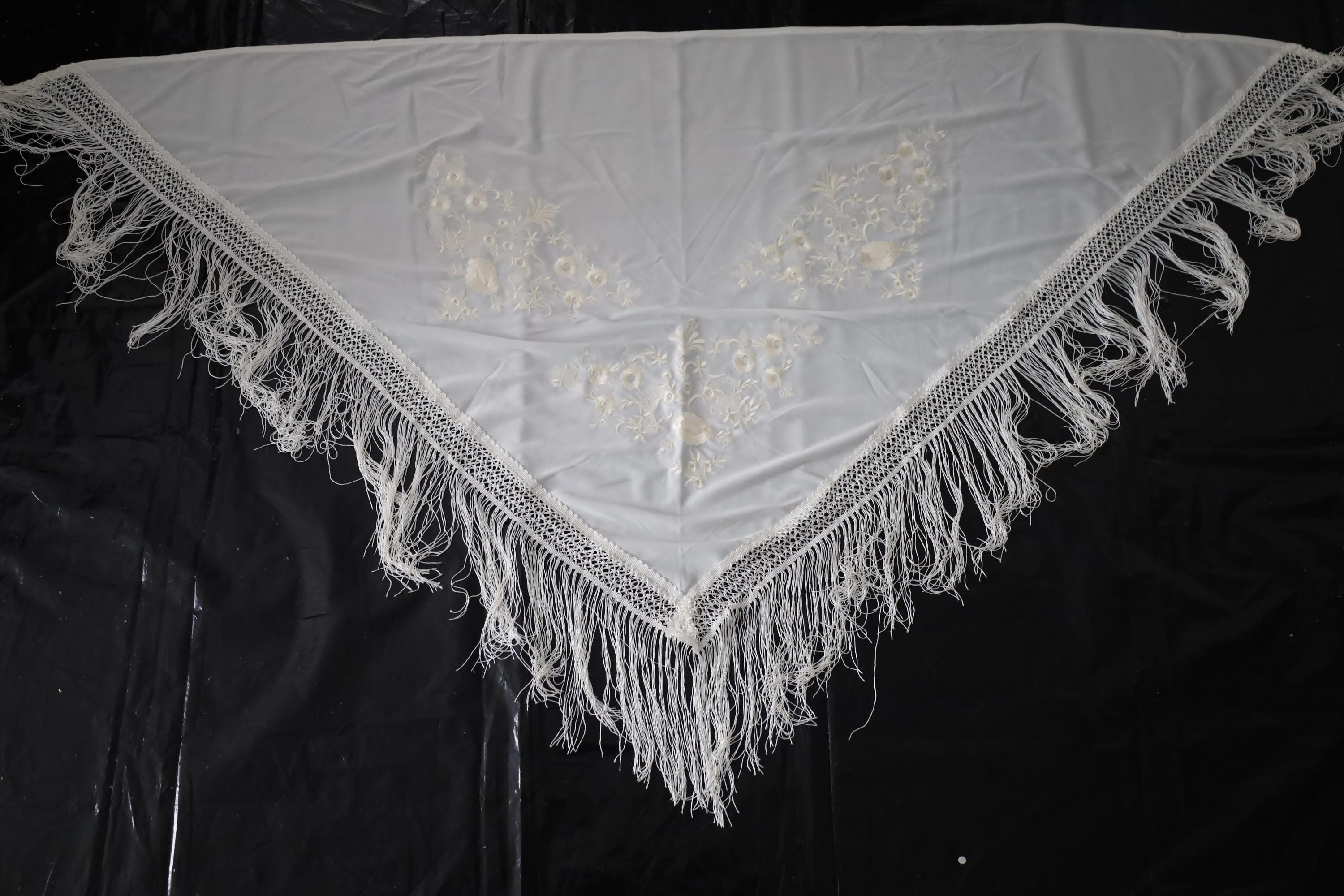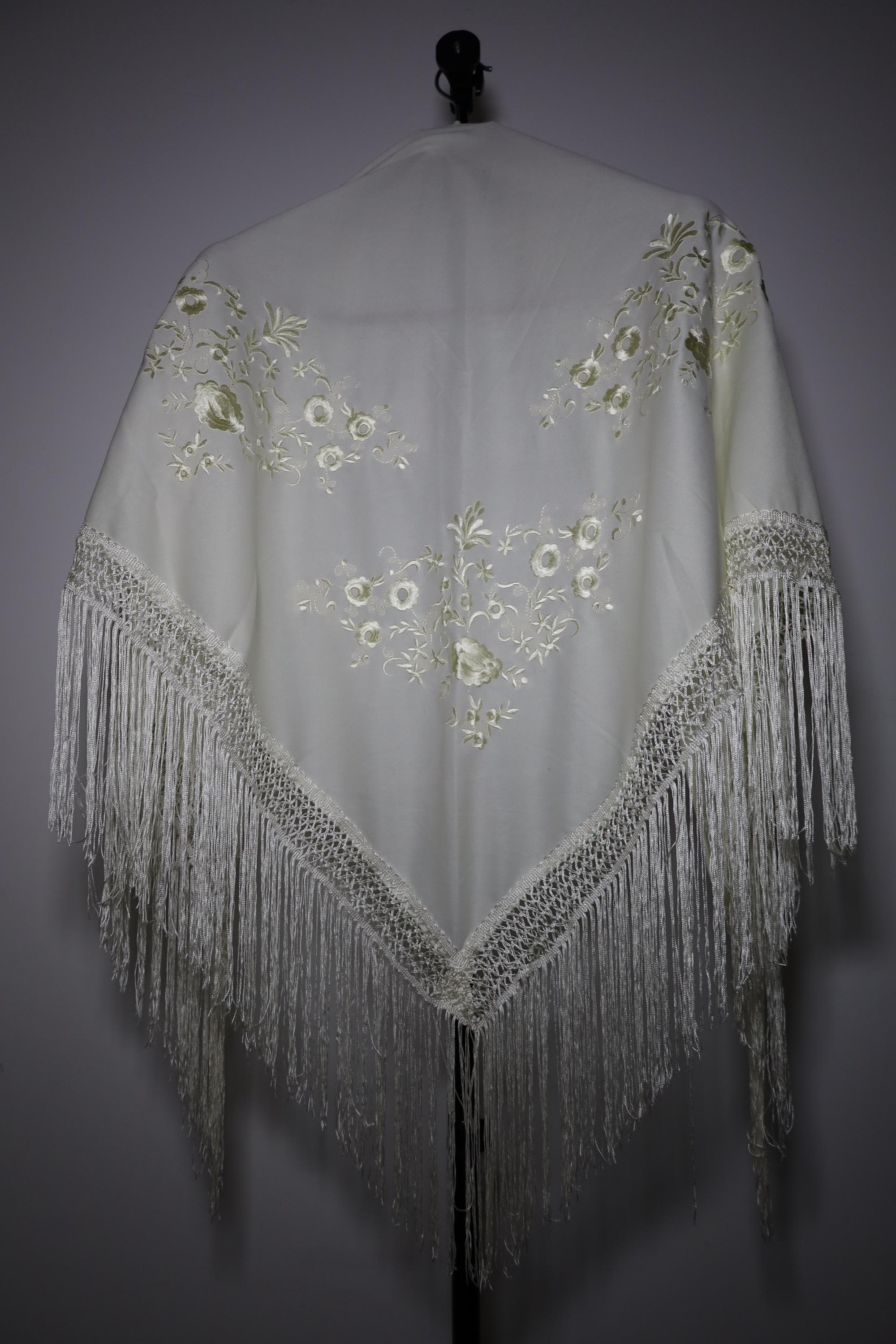 Immerse yourself in timeless elegance with this sumptuous beige Spanish shawl, a symbol of passion and refinement. Crafted from a silky, deep beige fabric, it is delicately embroidered with tone-on-tone floral motifs, adding a touch of sophistication and subtlety.