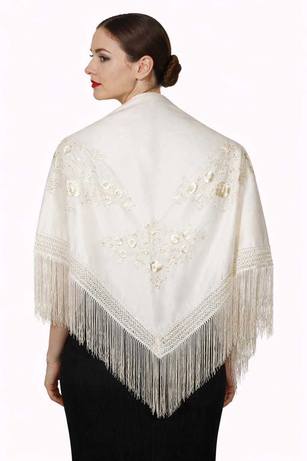 The finely braided fringe adds an enchanting fluidity to every movement, evoking the grace of flamenco dancers and the charm of Andalusian style. Perfect for enhancing an evening outfit, a boho-chic look, or a special occasion, this shawl is the ideal accessory for those who wish to combine tradition and elegance.