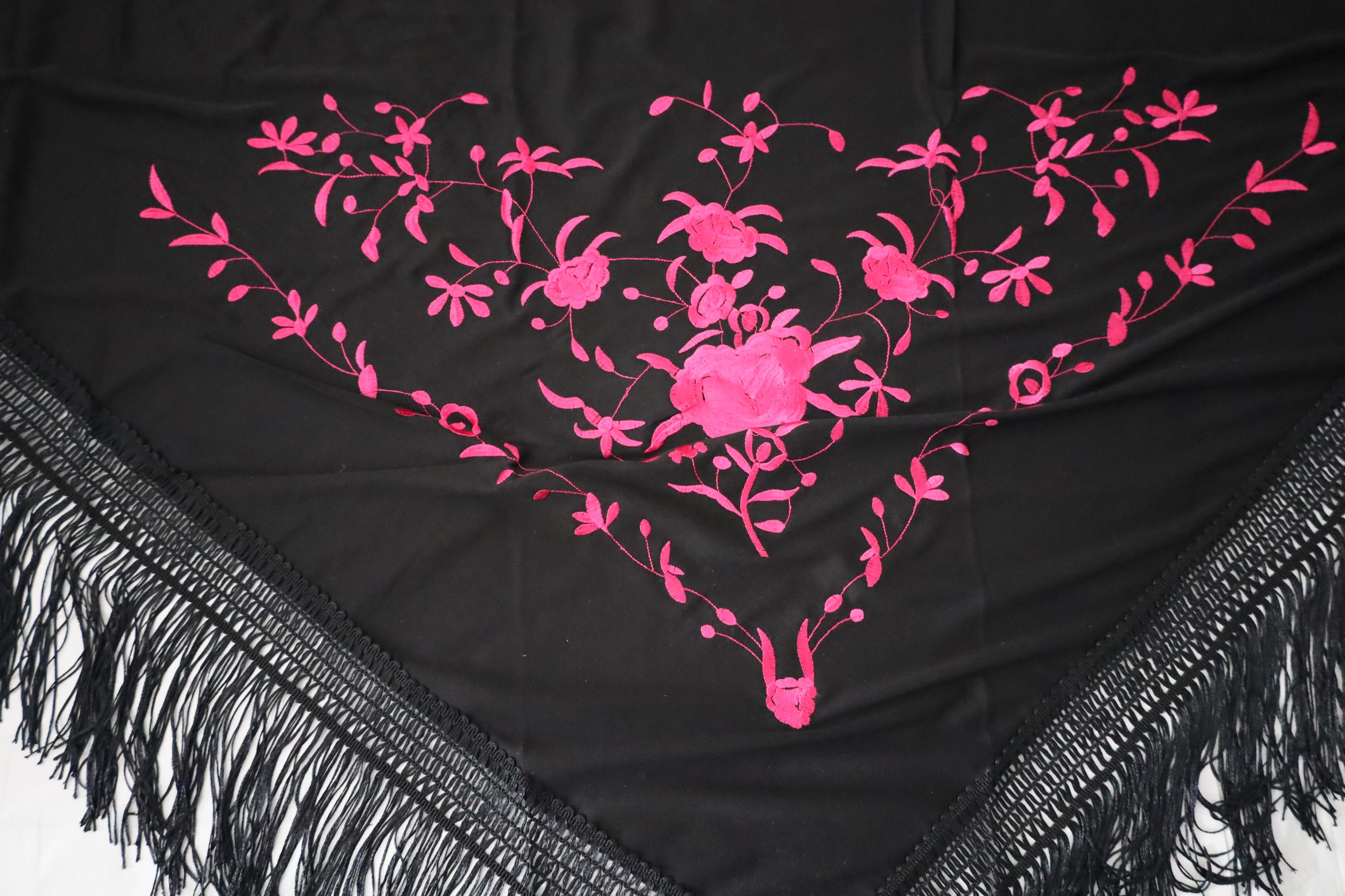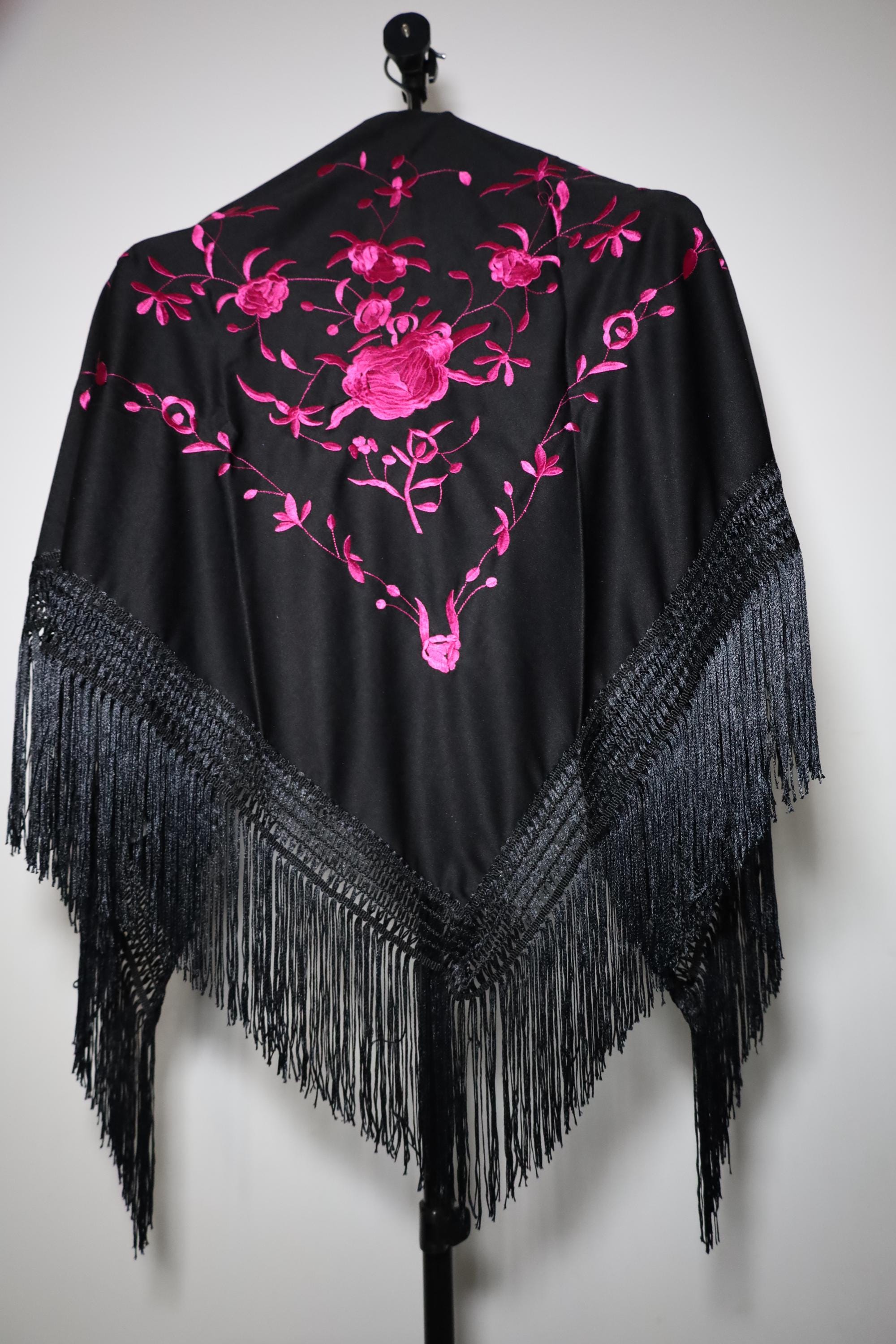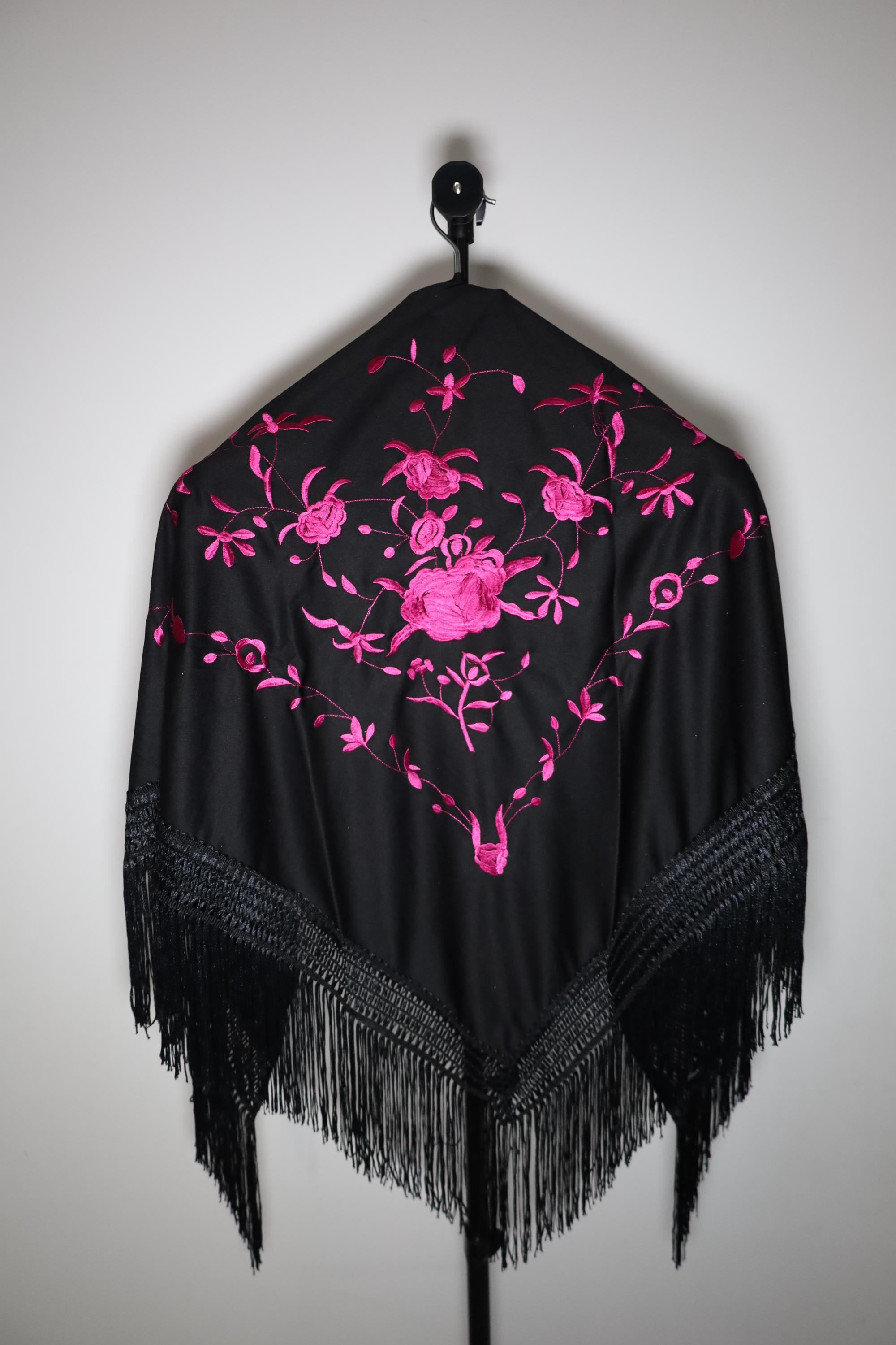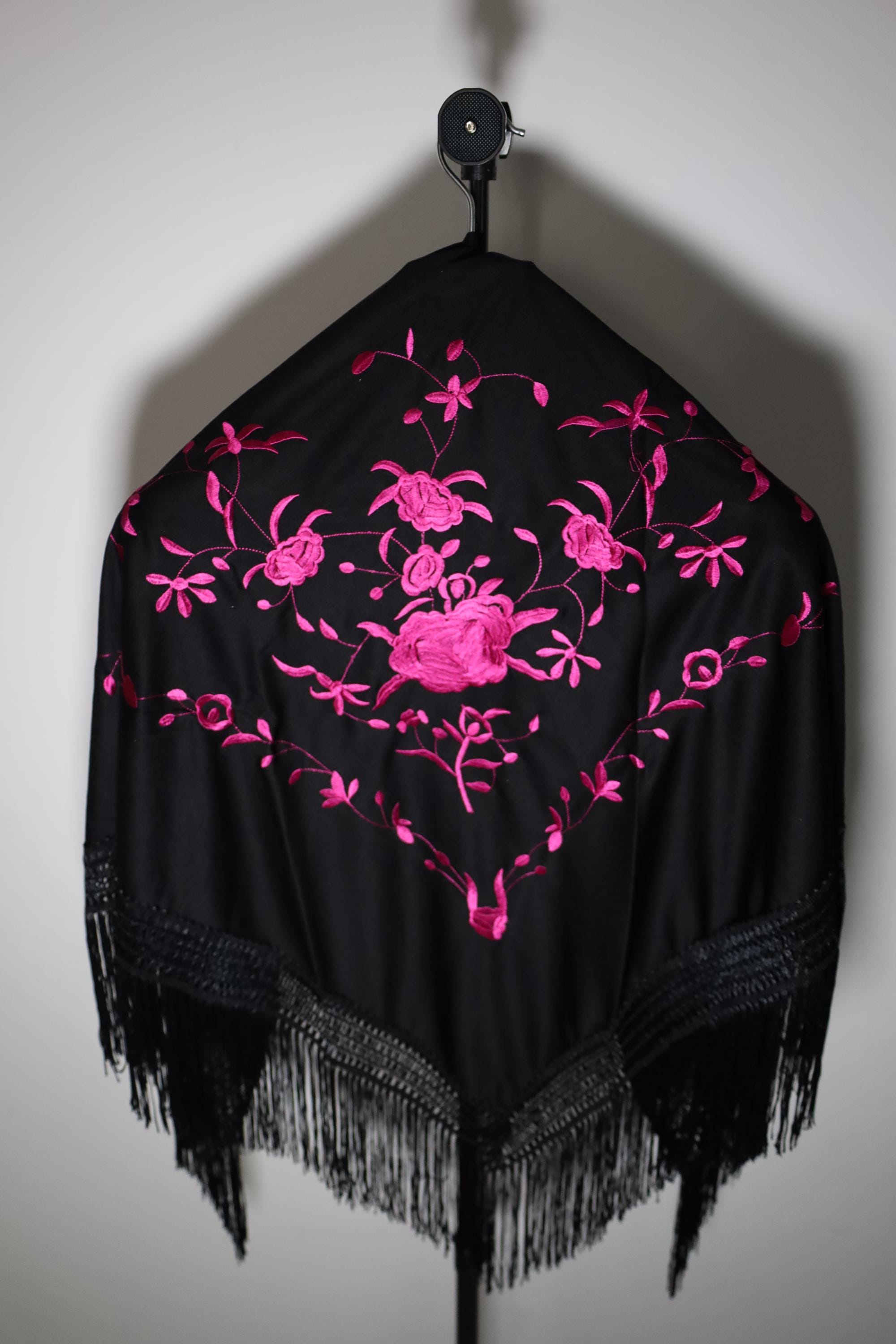 Be captivated by the timeless beauty of this traditional Spanish shawl, a symbol of elegance and grace. Crafted from sumptuous black fabric, it is exquisitely adorned with vibrant pink floral embroidery, offering a refined contrast and authentic style.