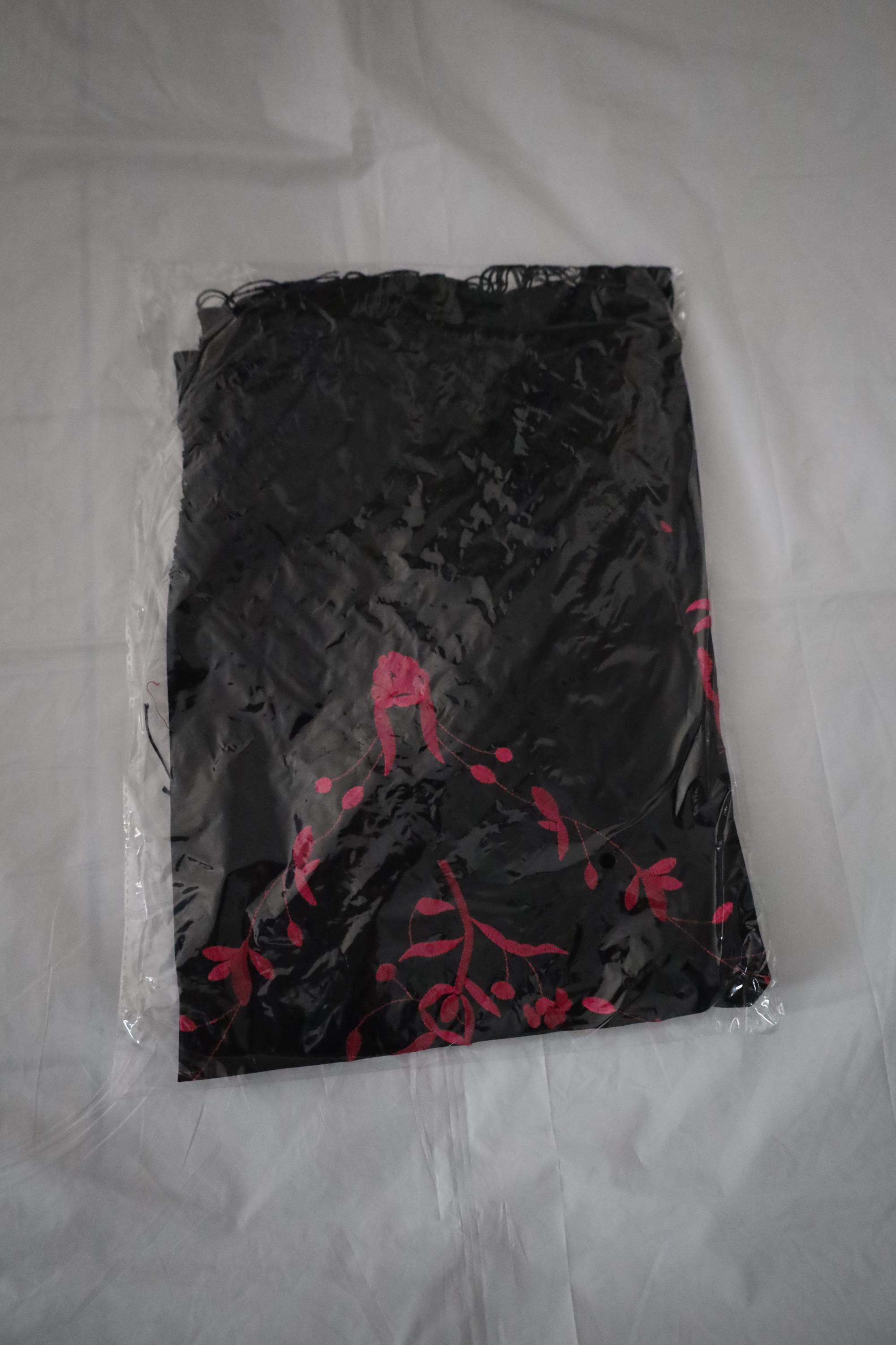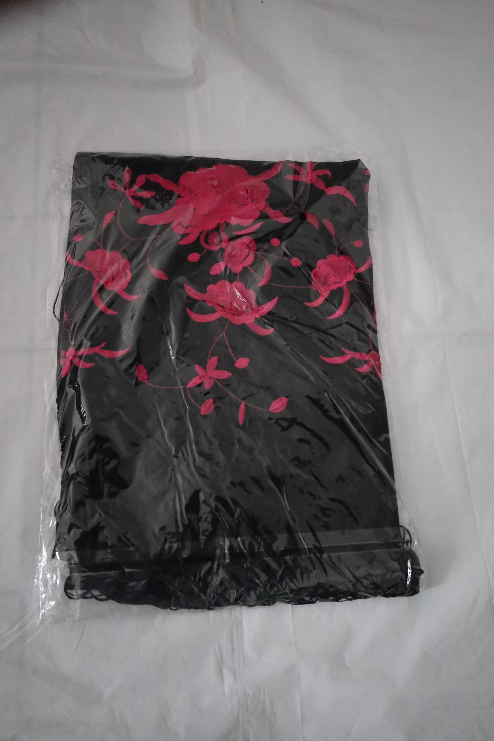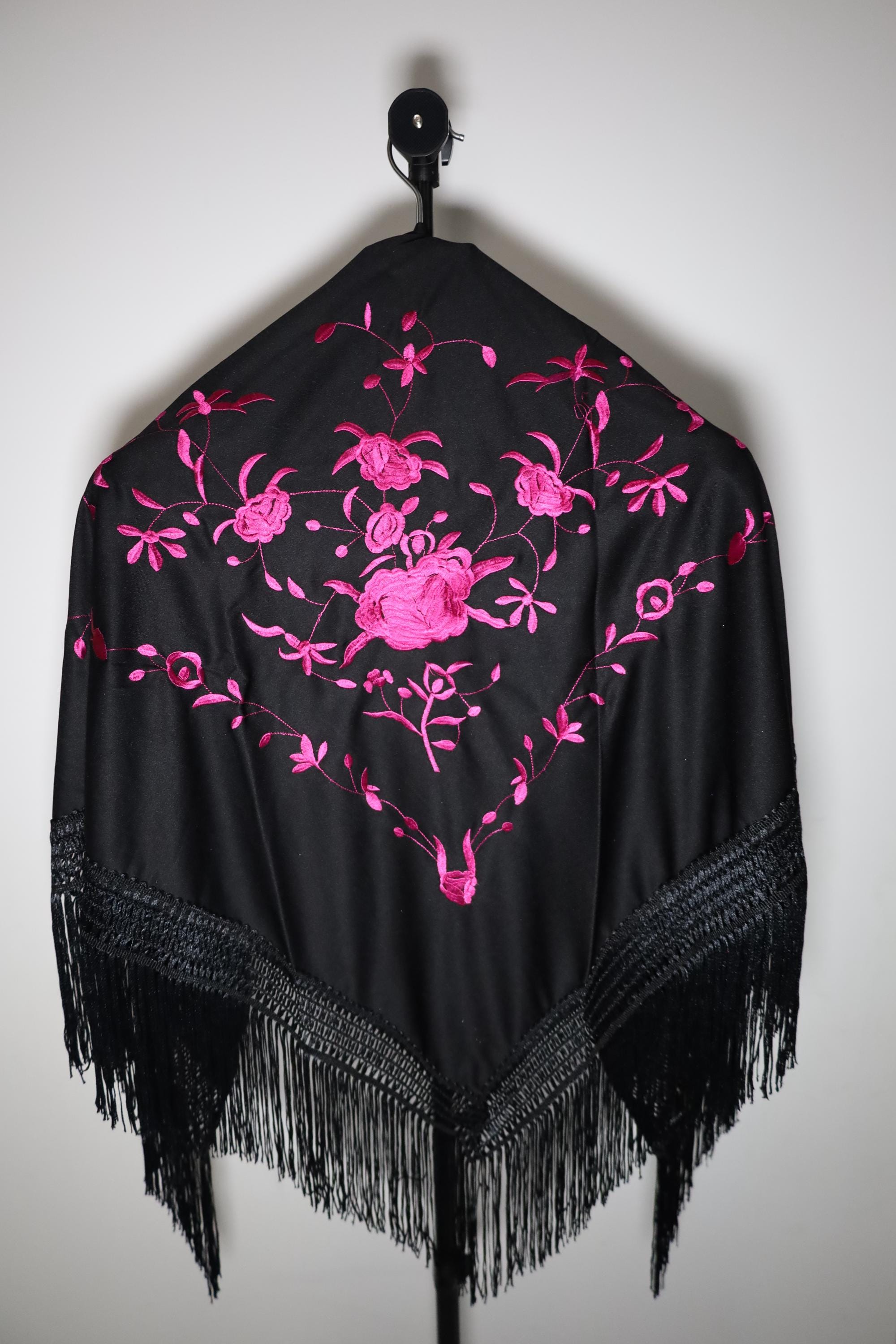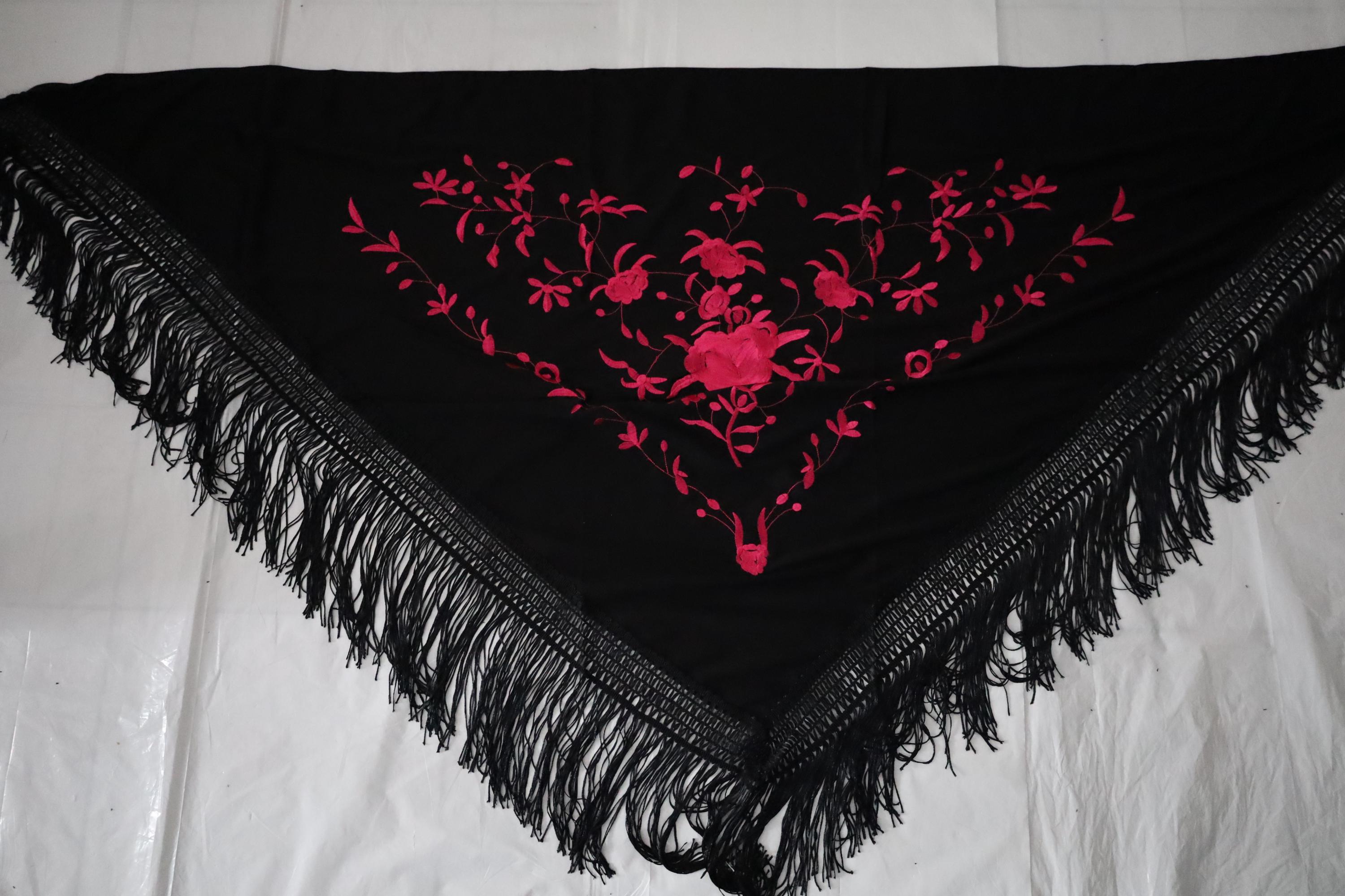 Be captivated by the timeless beauty of this traditional Spanish shawl, a symbol of elegance and grace. Crafted from sumptuous black fabric, it is exquisitely adorned with vibrant pink floral embroidery, offering a refined contrast and authentic style.