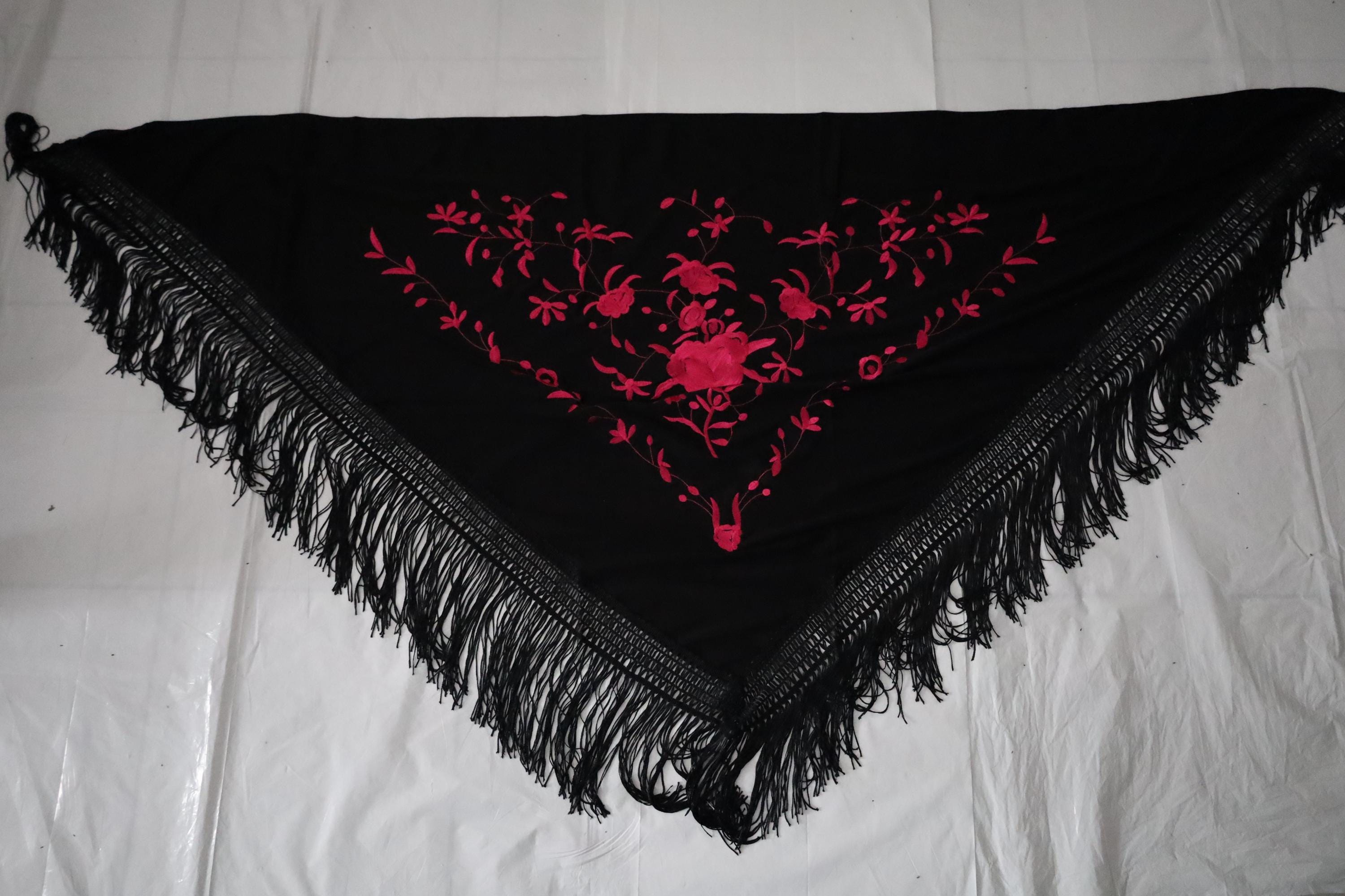 The black fringes that border the shawl add a touch of movement and fluidity, recalling the charm of flamenco dances and Spanish craftsmanship. Perfect for enhancing an evening outfit, a boho chic look, or even for a special occasion, this shawl is a true masterpiece of textile art.