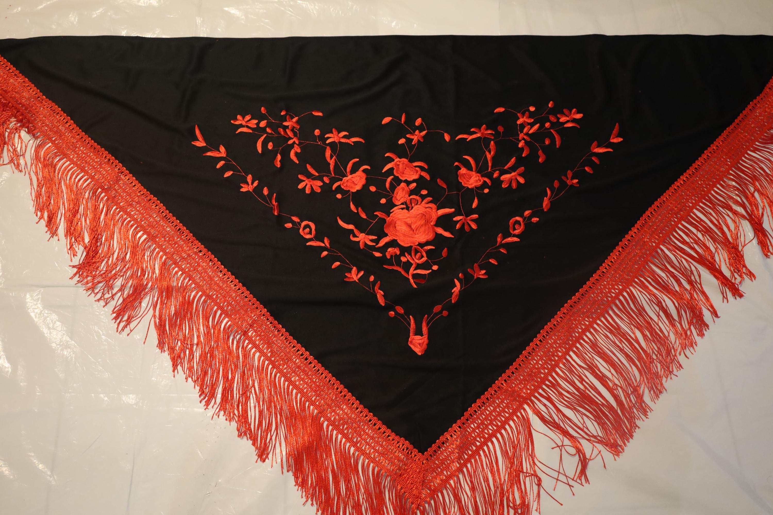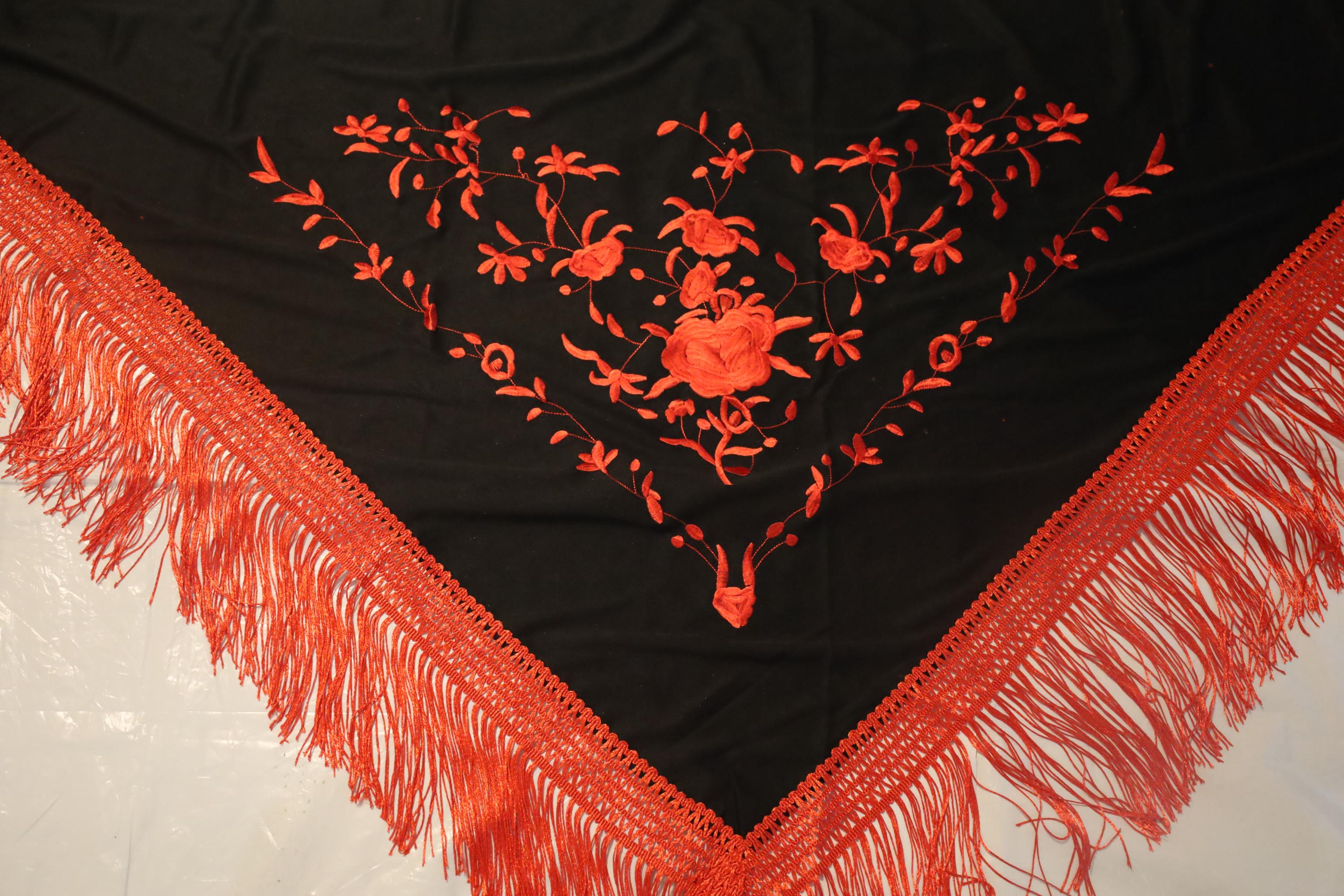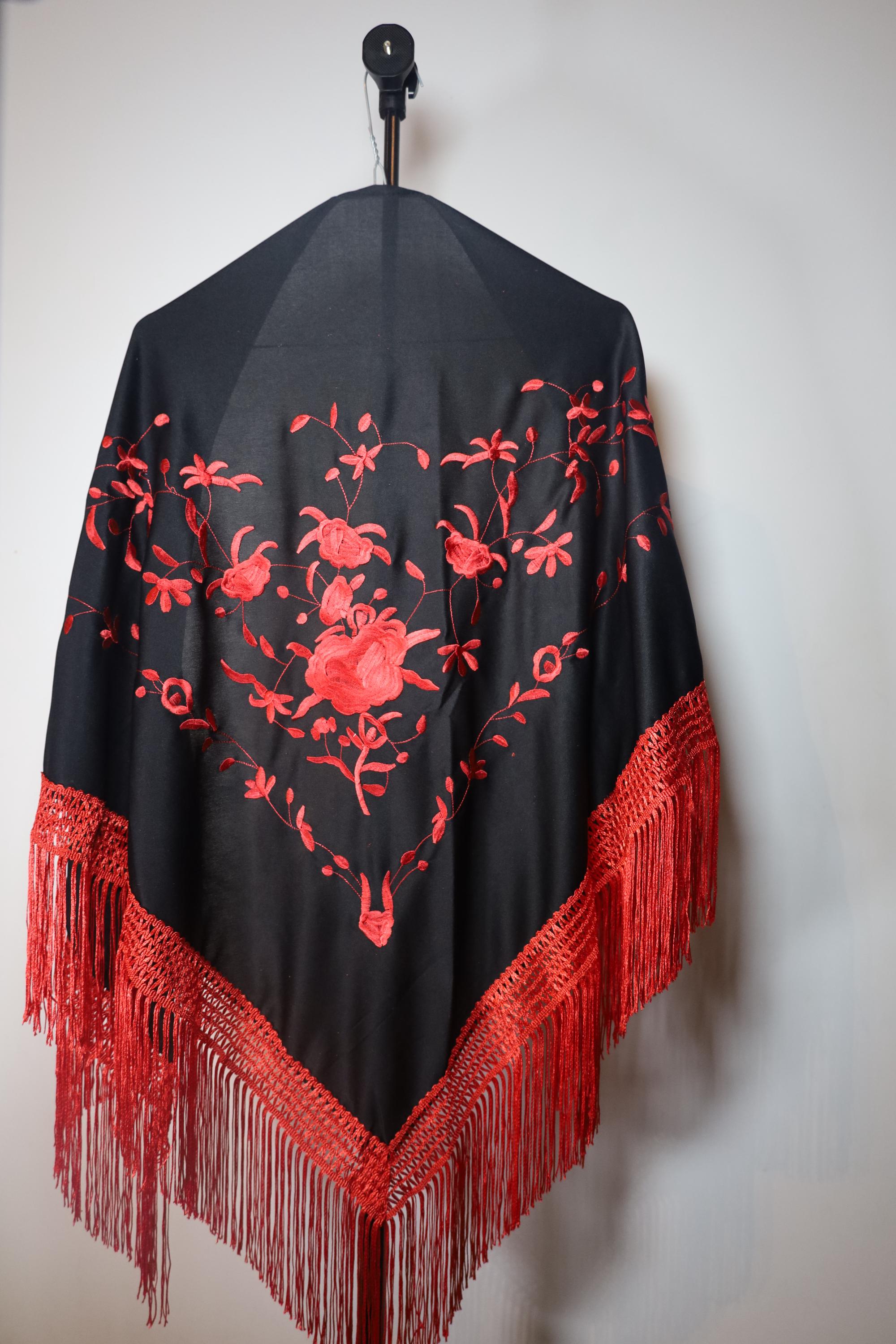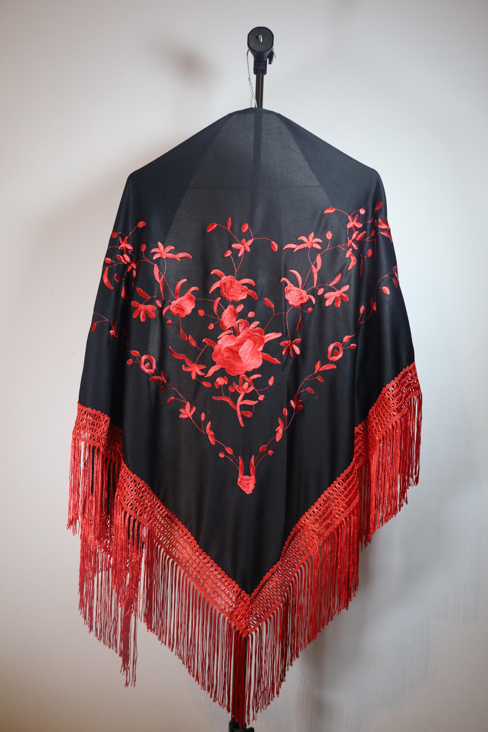 A true statement piece, this shawl is distinguished by the striking contrast between its deep black fabric and its sumptuous embroidery in a vibrant carmine red.
