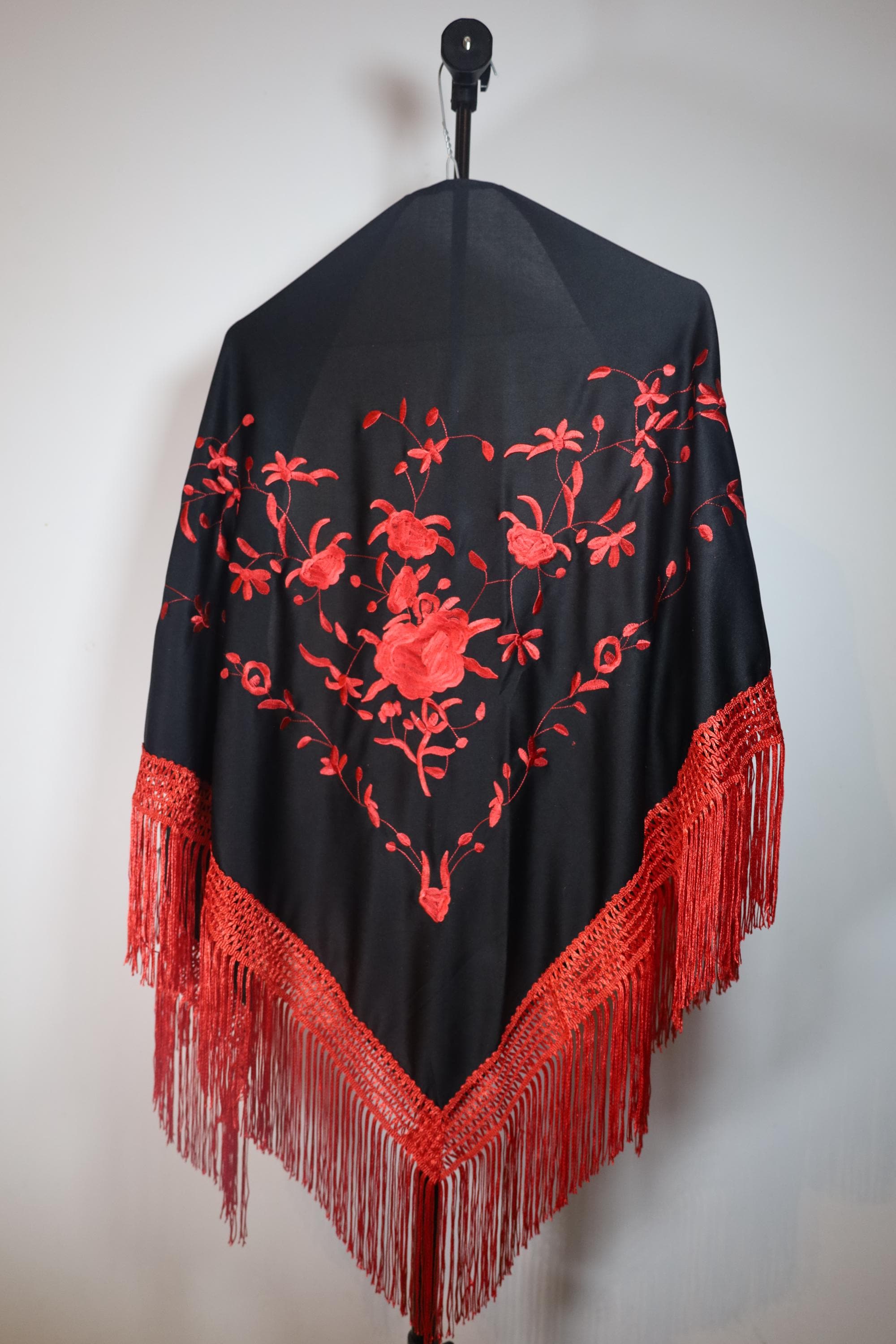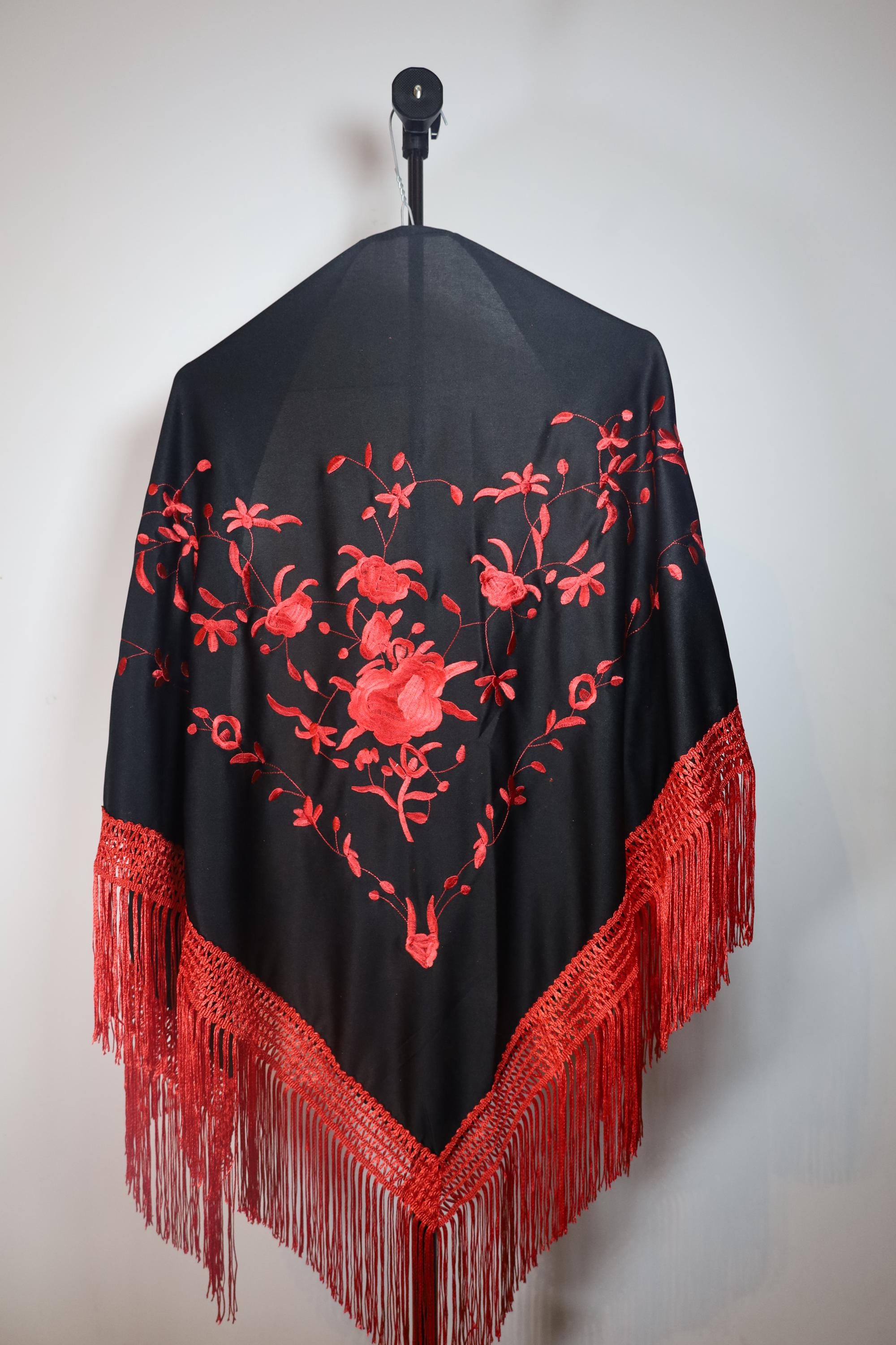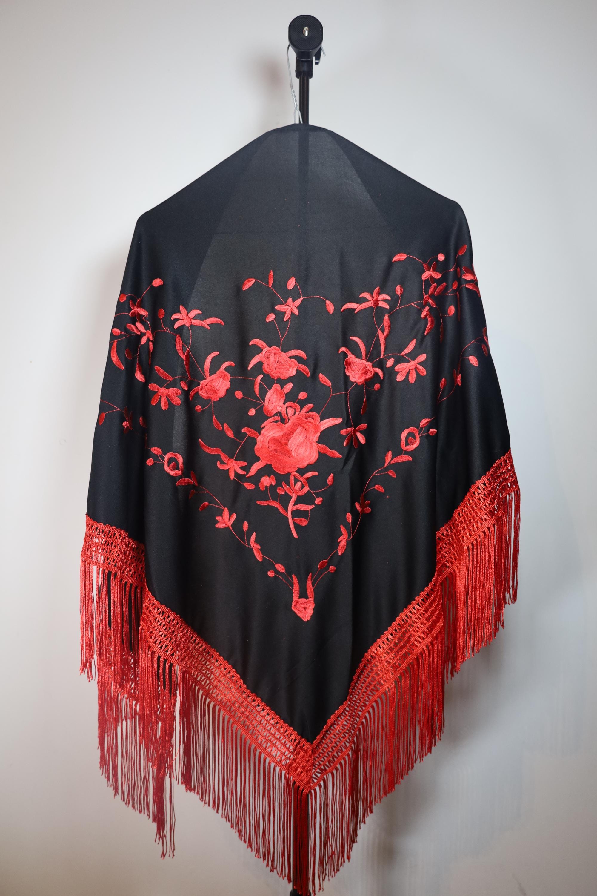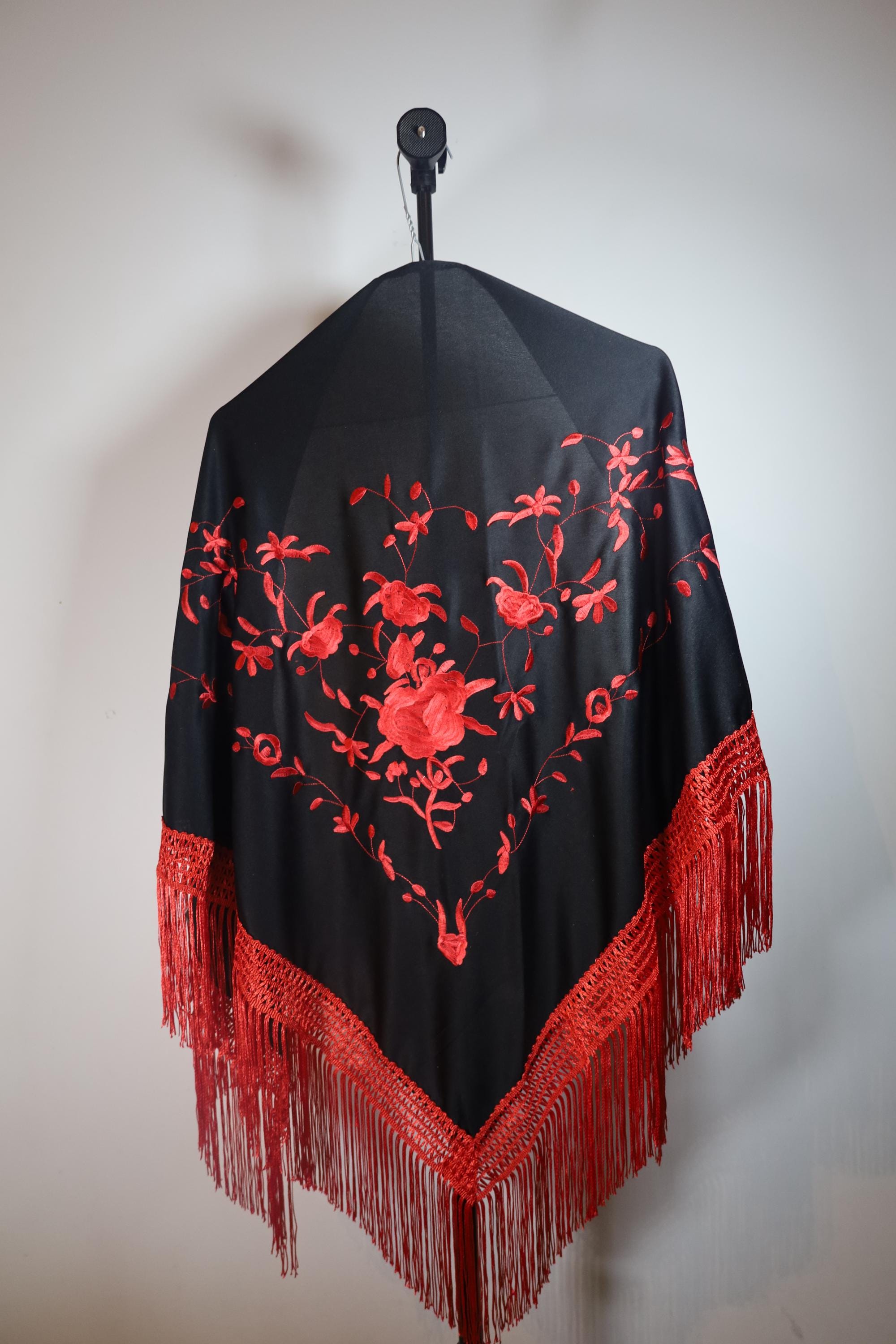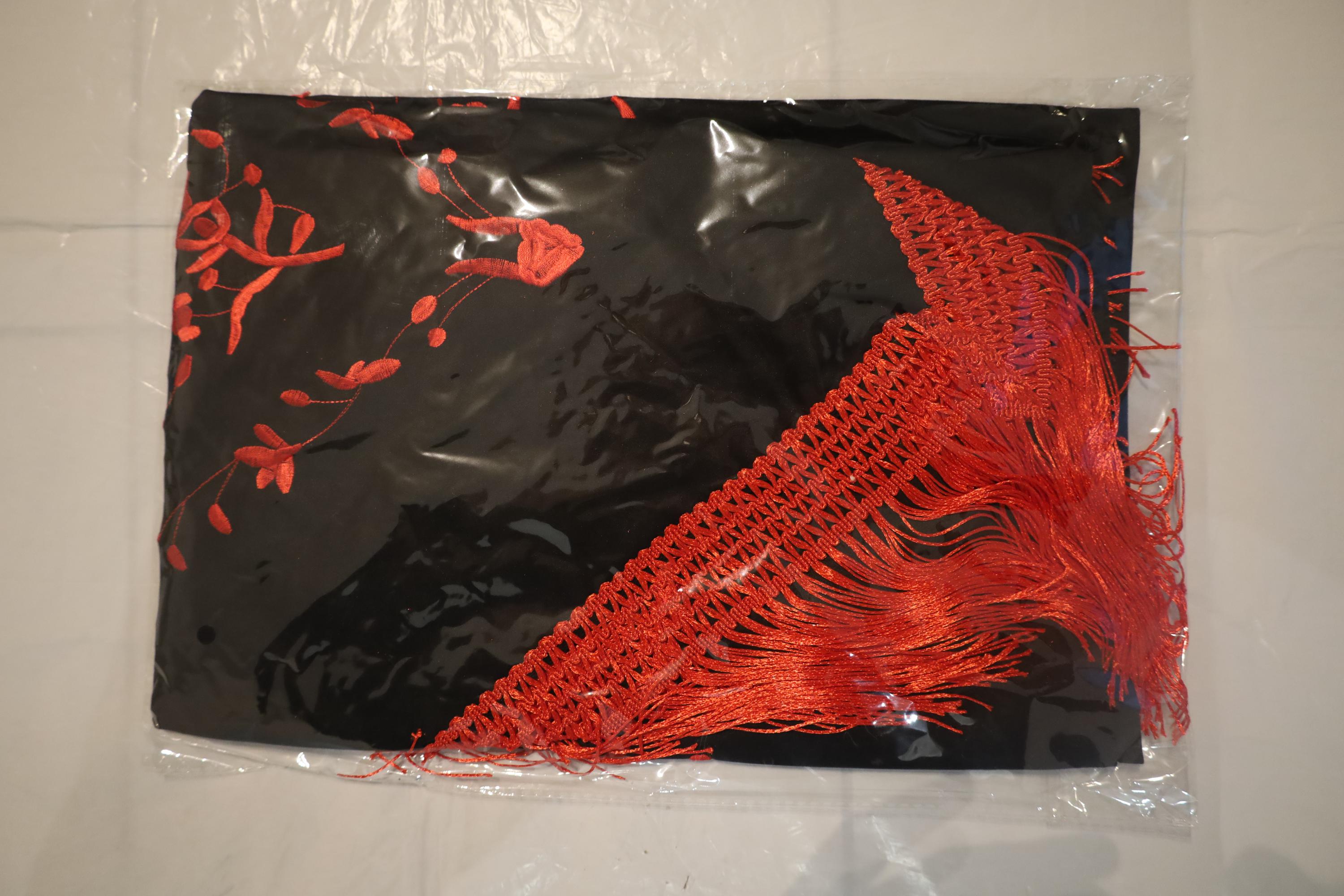 A true statement piece, this shawl is distinguished by the striking contrast between its deep black fabric and its sumptuous embroidery in a vibrant carmine red.