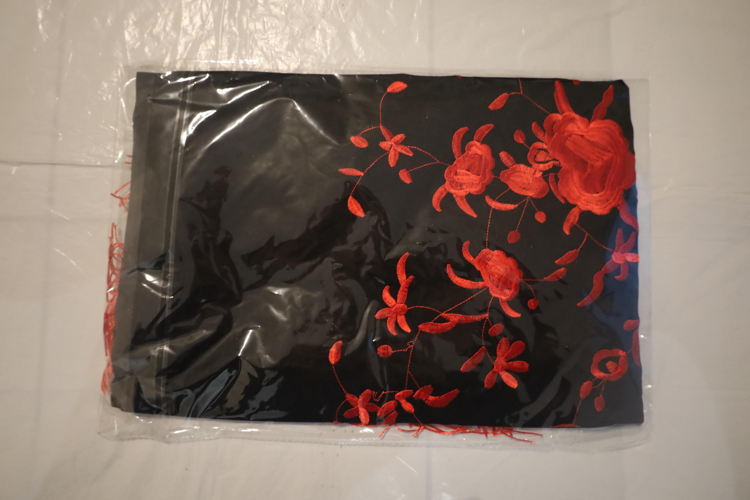 Design: Deep black background illuminated by rich floral embroidery (roses) in an intense red.