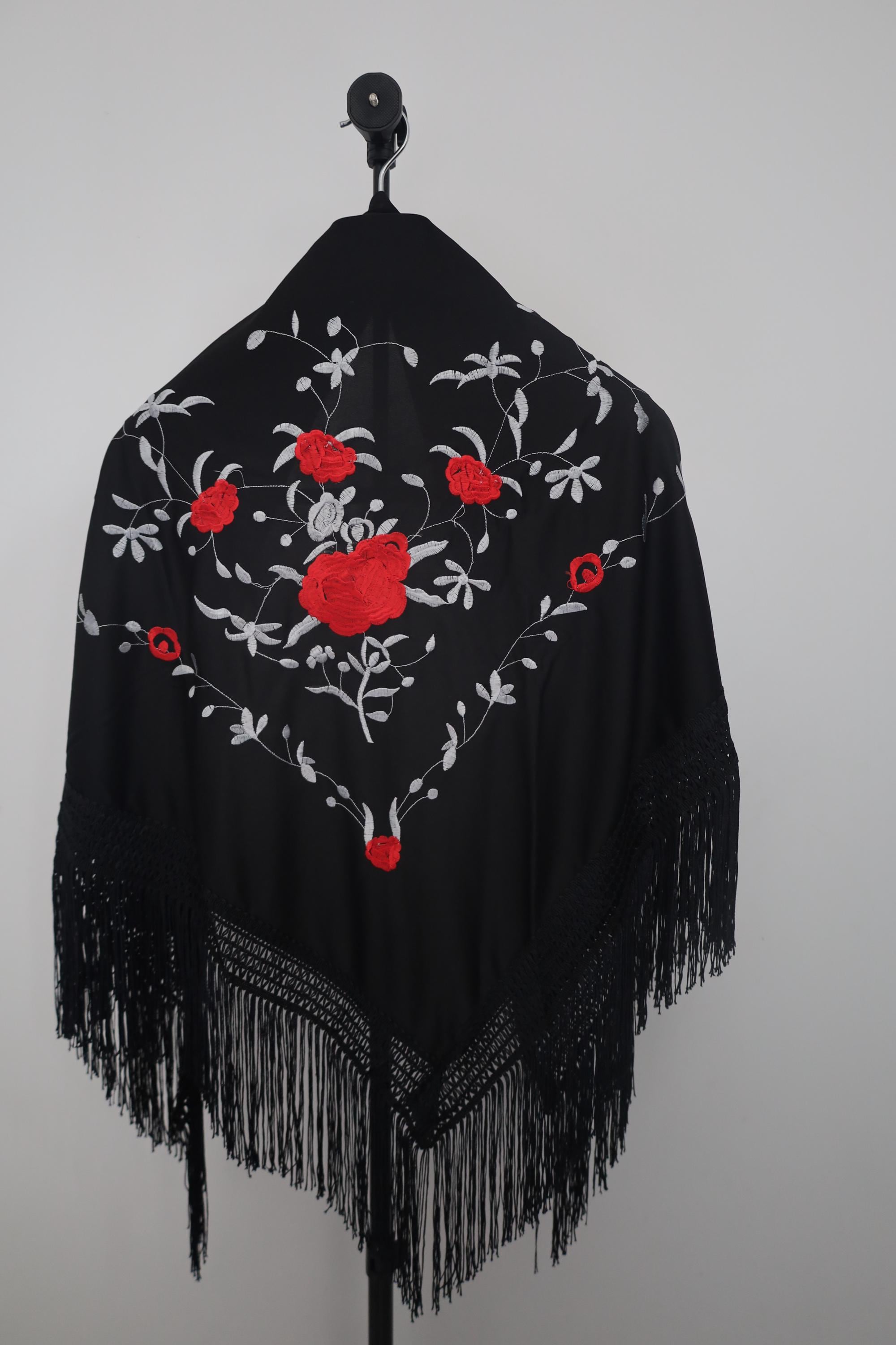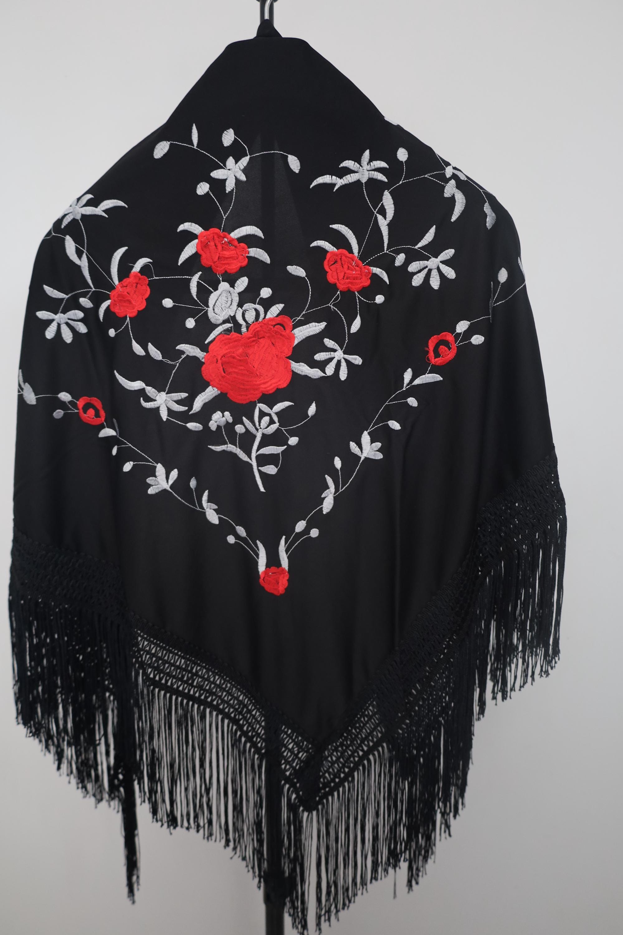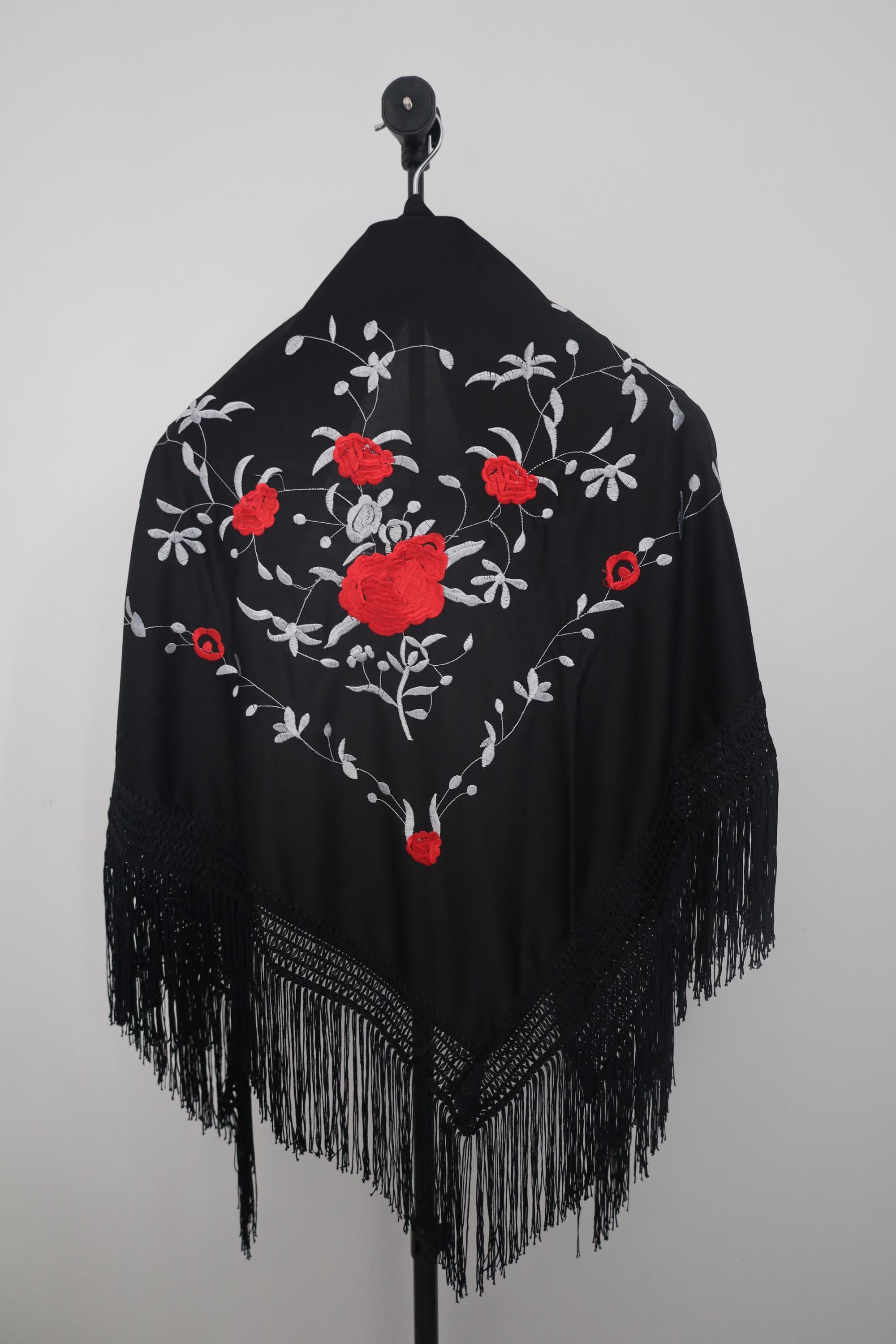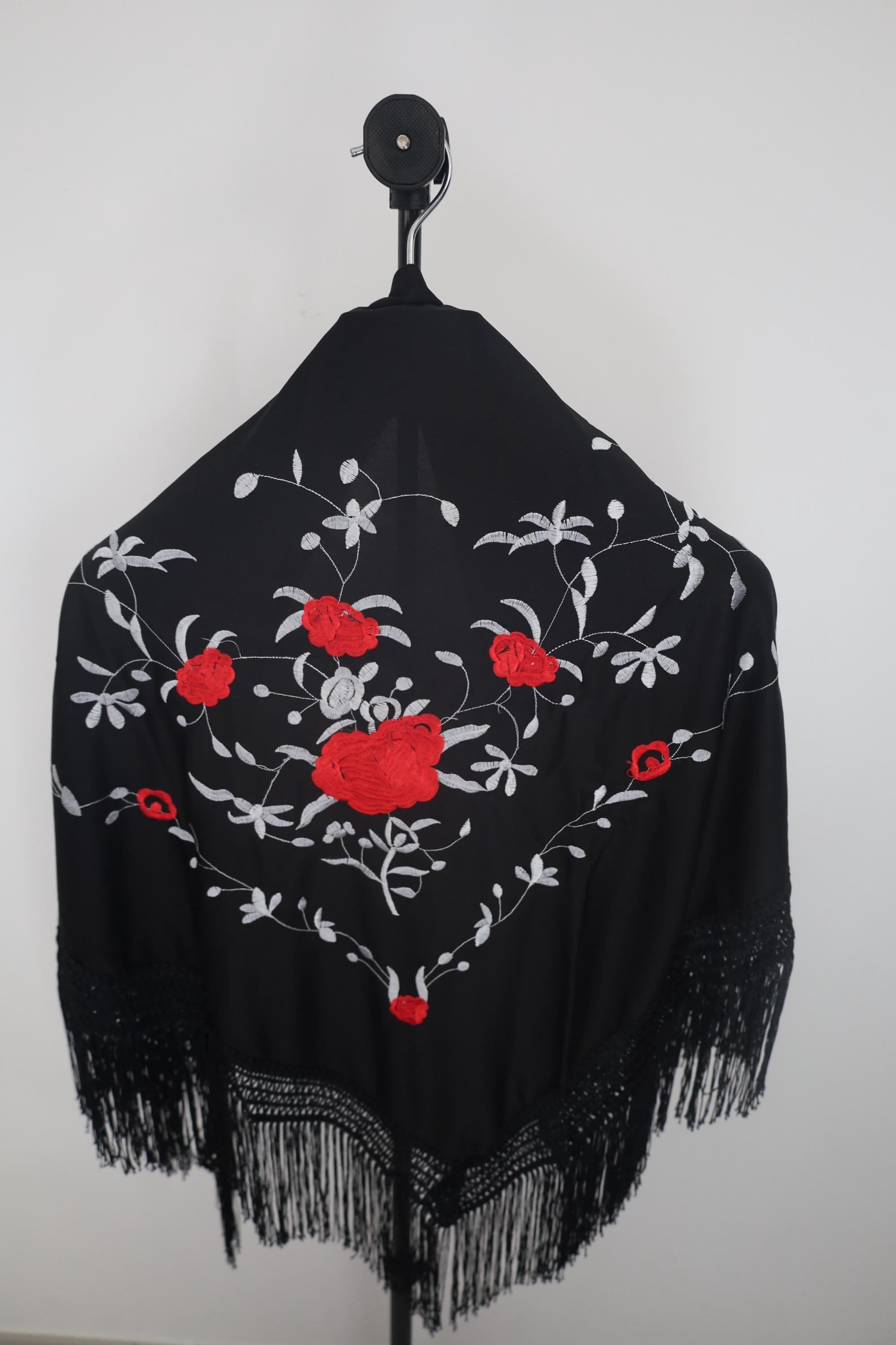 Be captivated by the timeless beauty of this traditional Spanish shawl, a symbol of elegance and grace. Crafted from sumptuous black fabric, it is beautifully adorned with vibrant red floral embroidery and delicate silver arabesques, offering a refined contrast and authentic style.