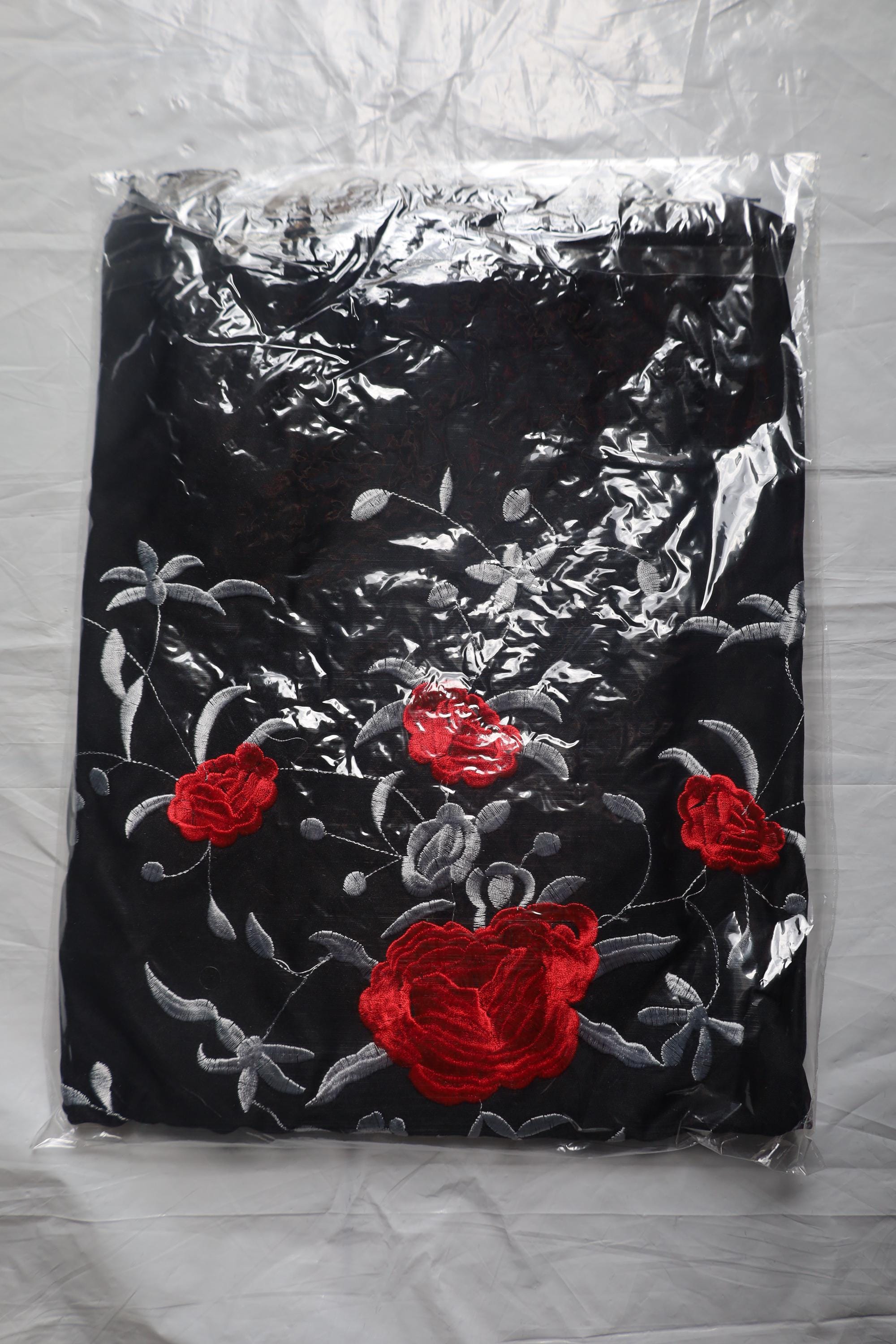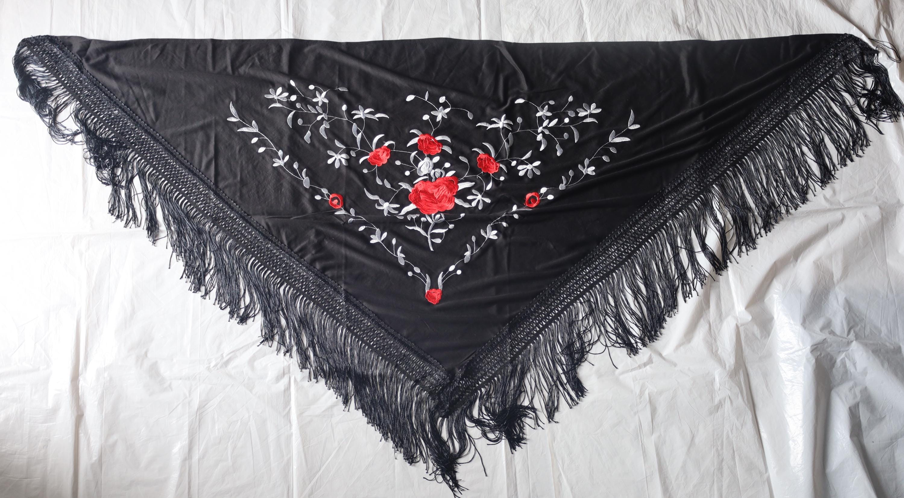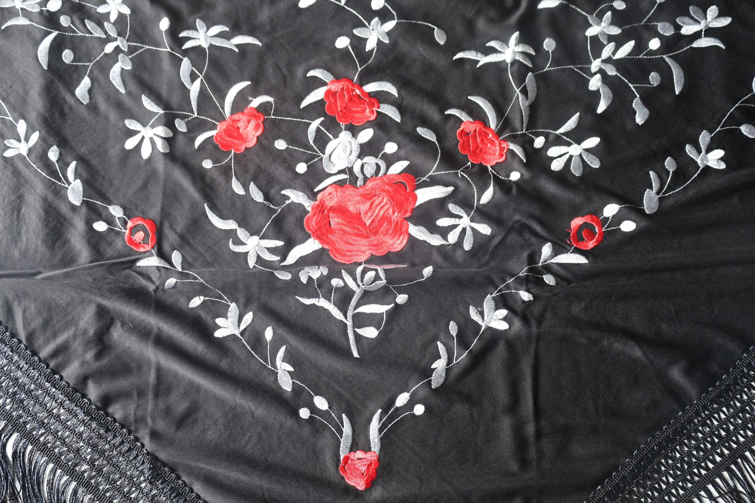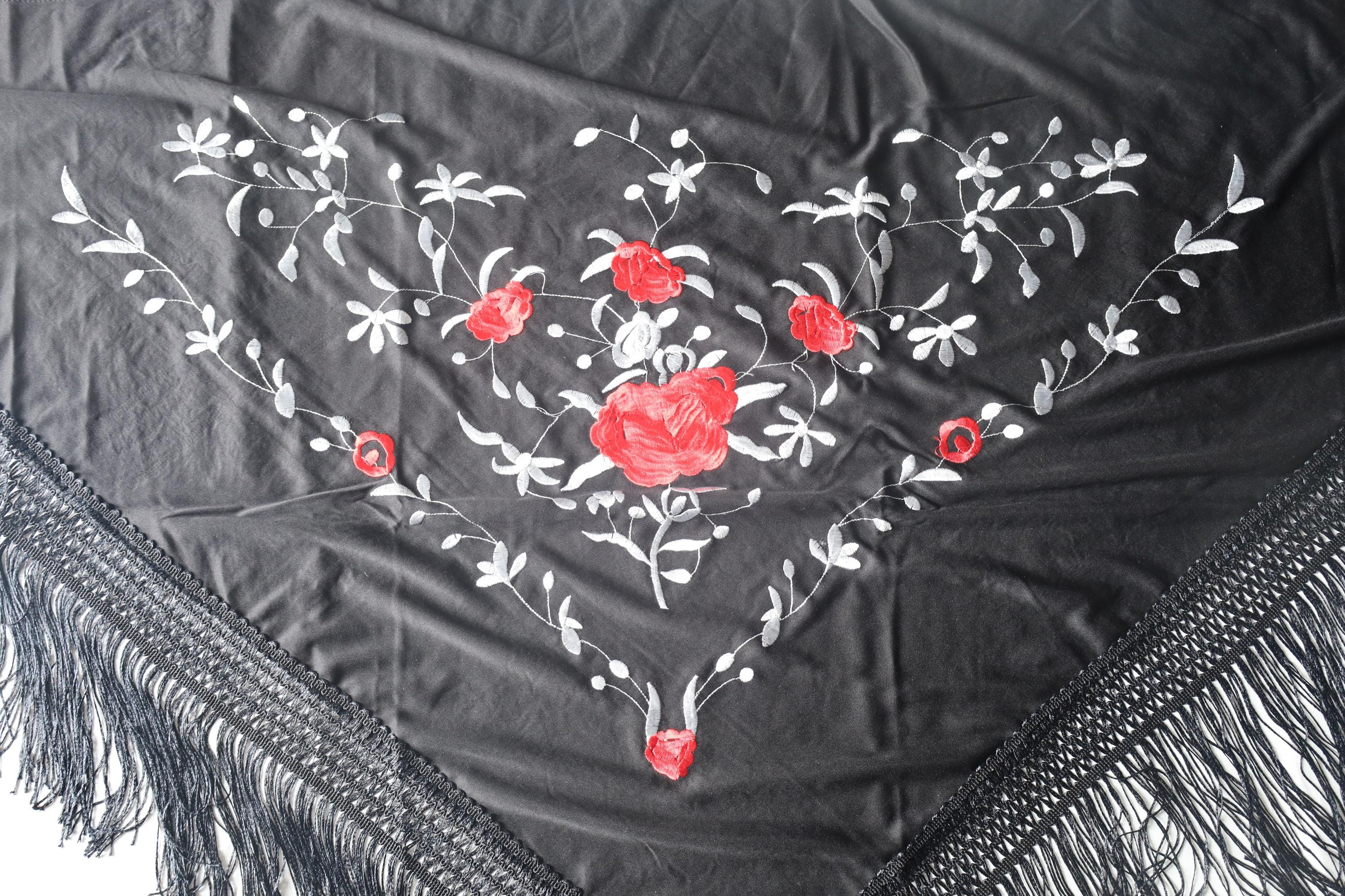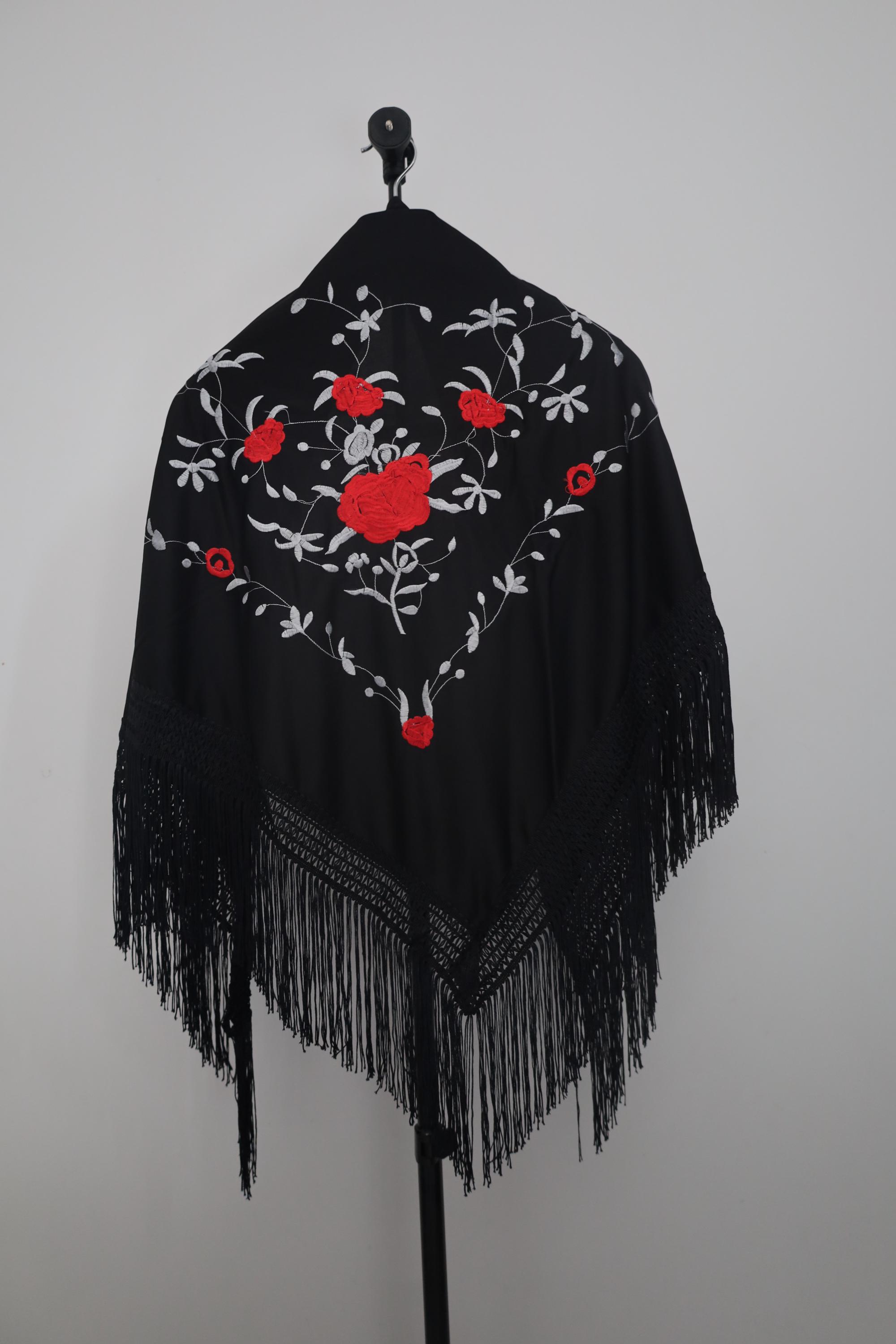Be captivated by the timeless beauty of this traditional Spanish shawl, a symbol of elegance and grace. Crafted from sumptuous black fabric, it is beautifully adorned with vibrant red floral embroidery and delicate silver arabesques, offering a refined contrast and authentic style.