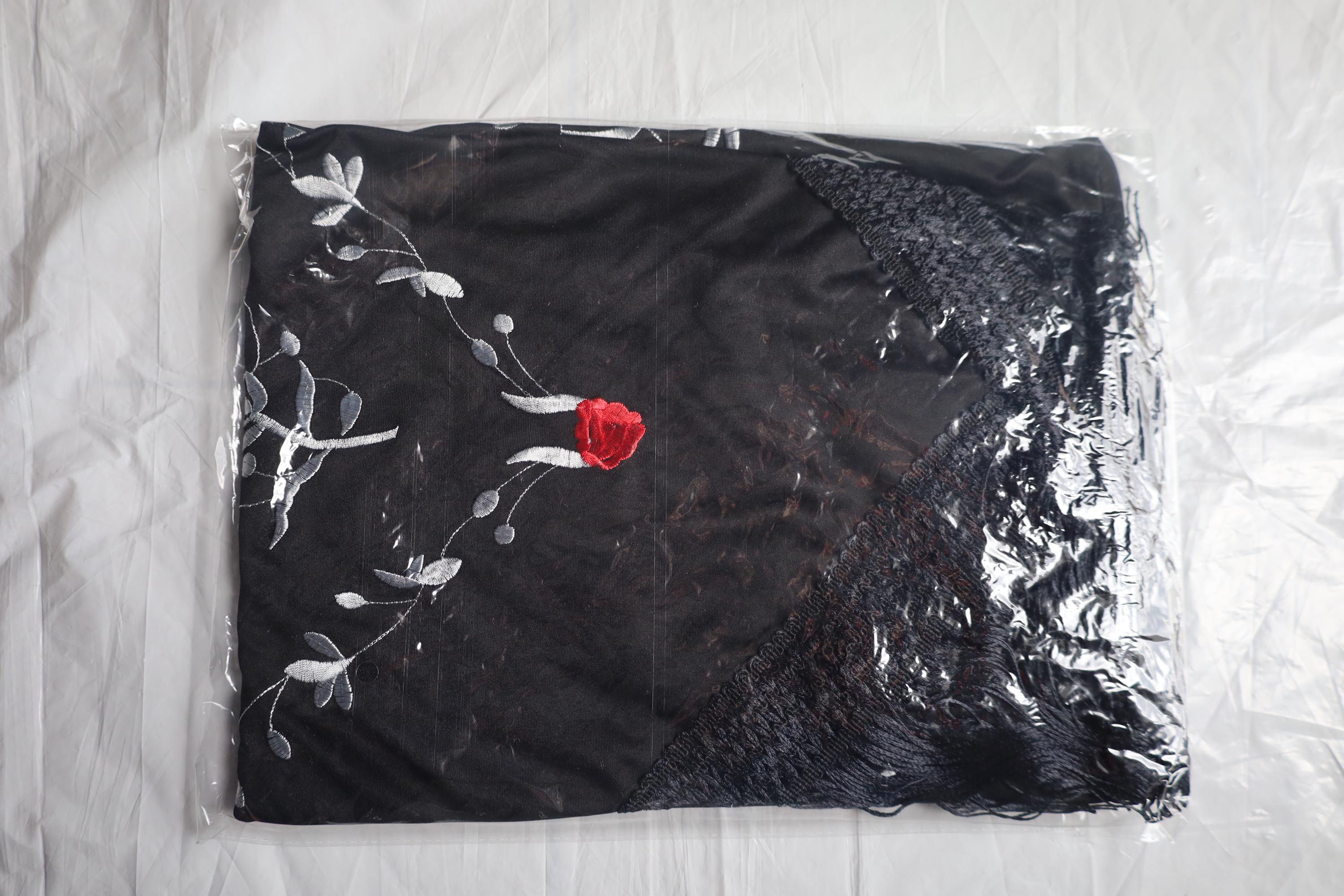 The black fringes that border the shawl add a touch of movement and fluidity, recalling the charm of flamenco dances and Spanish craftsmanship. Perfect for enhancing an evening outfit, a boho chic look, or even for a special occasion, this shawl is a true masterpiece of textile art.